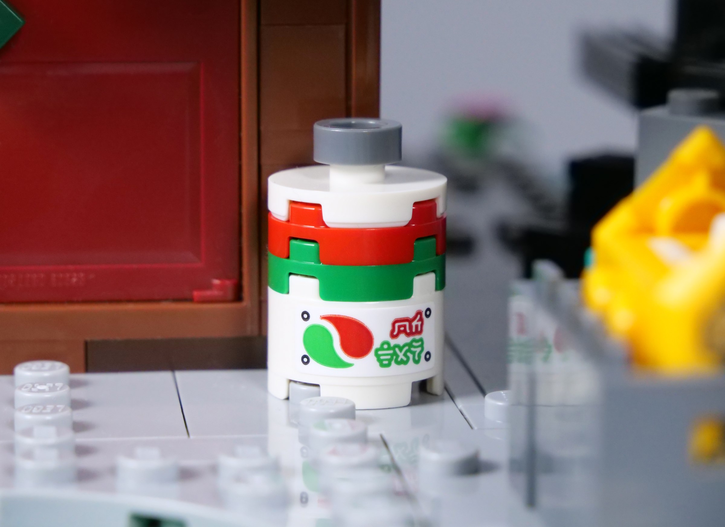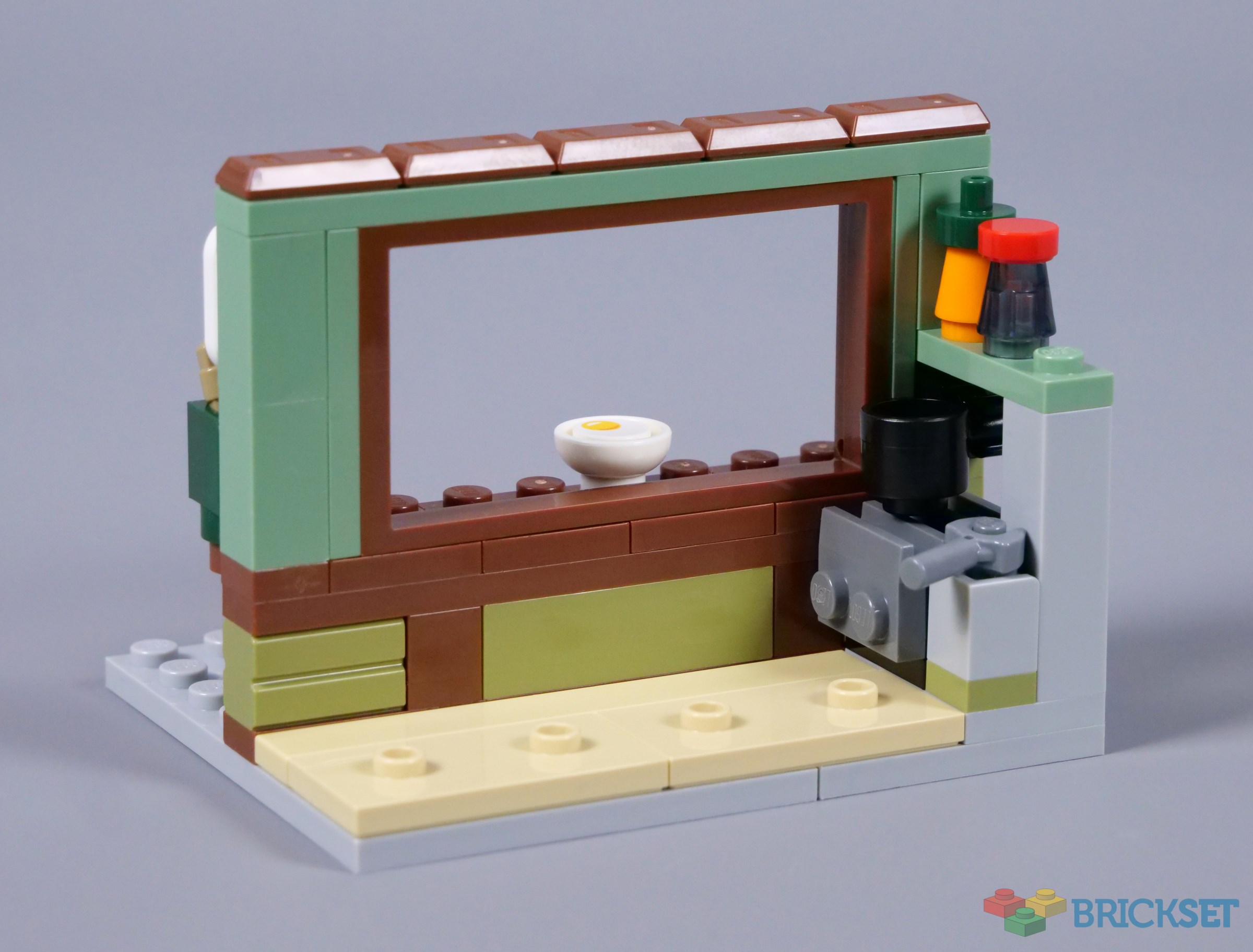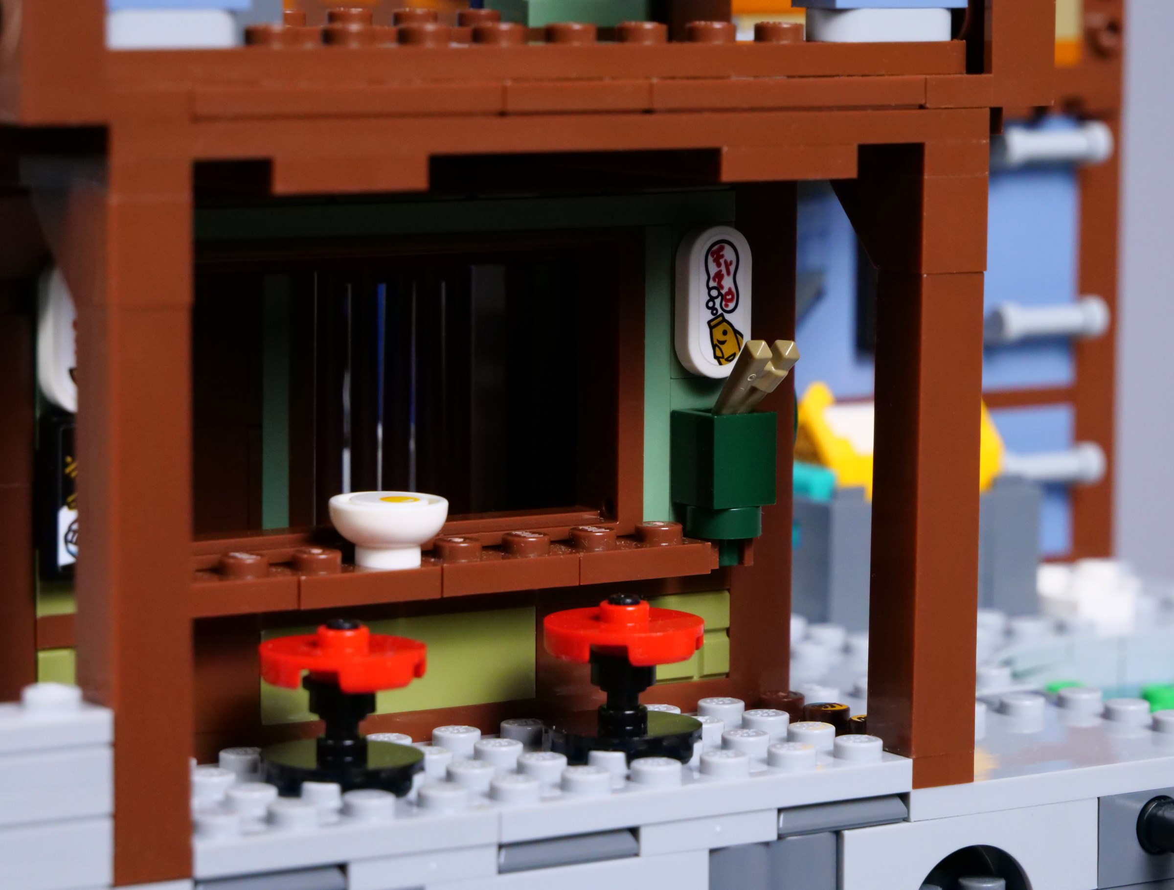 There are two seats for customers at the noodle shop, which seems authentic to the little food vendors found in many Japanese and Chinese cities. The wooden counter looks good and the bowl with a printed fried egg inside works well. However, only one bowl is provided and the 1x1 round tile with printed noodles released last year is not included at all, sadly.