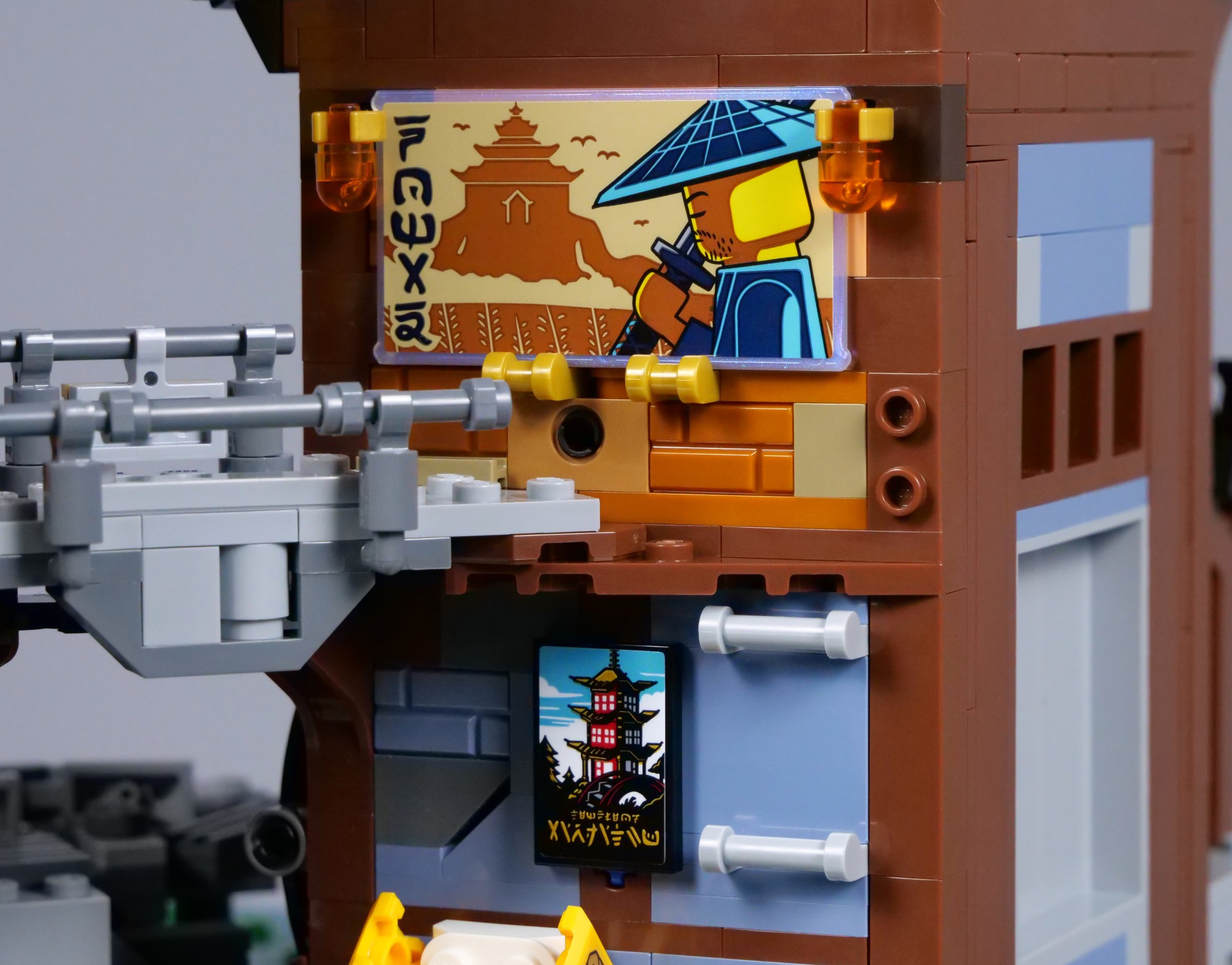 A wall lamp and another stickered poster are found in the passageway too. The latter displays 71797 Destiny's Bounty - Race Against Time flying over the city, with towers featured in 71741 NINJAGO City Gardens and 71799 NINJAGO City Markets underneath.