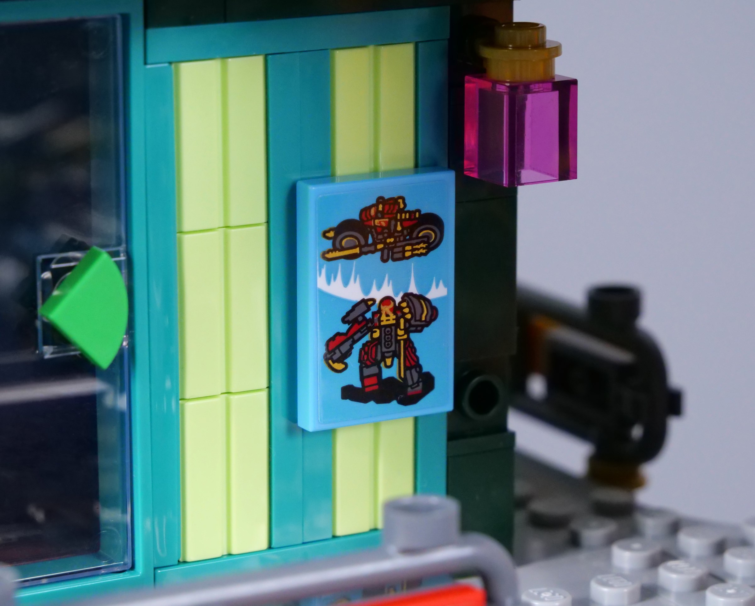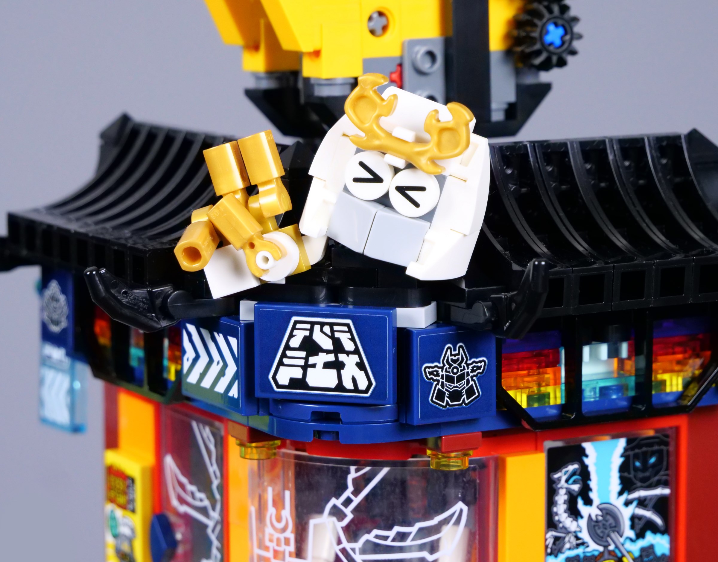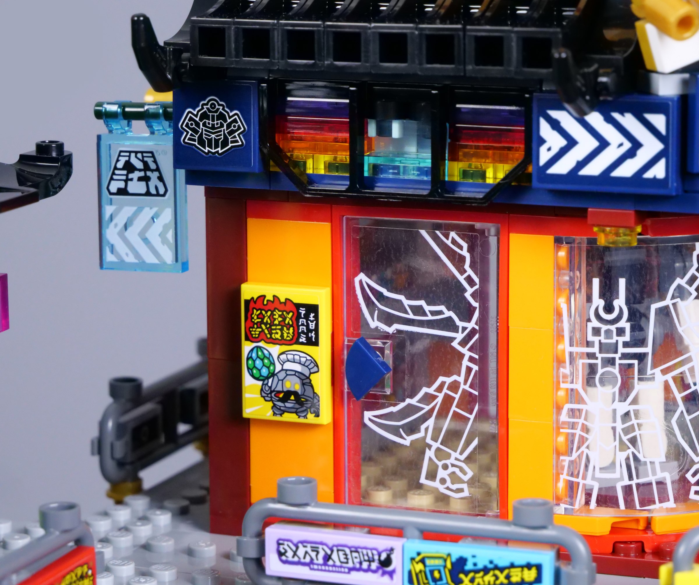 The combination of red and orange shades on the walls and a blue border around the roof is remarkably effective, with lights providing even more colour! Moreover, the stylised head and hand of a mech looks brilliant, reminiscent of the brick-built octopus atop 71799 NINJAGO City Markets, or the animal balloons in prior sets.