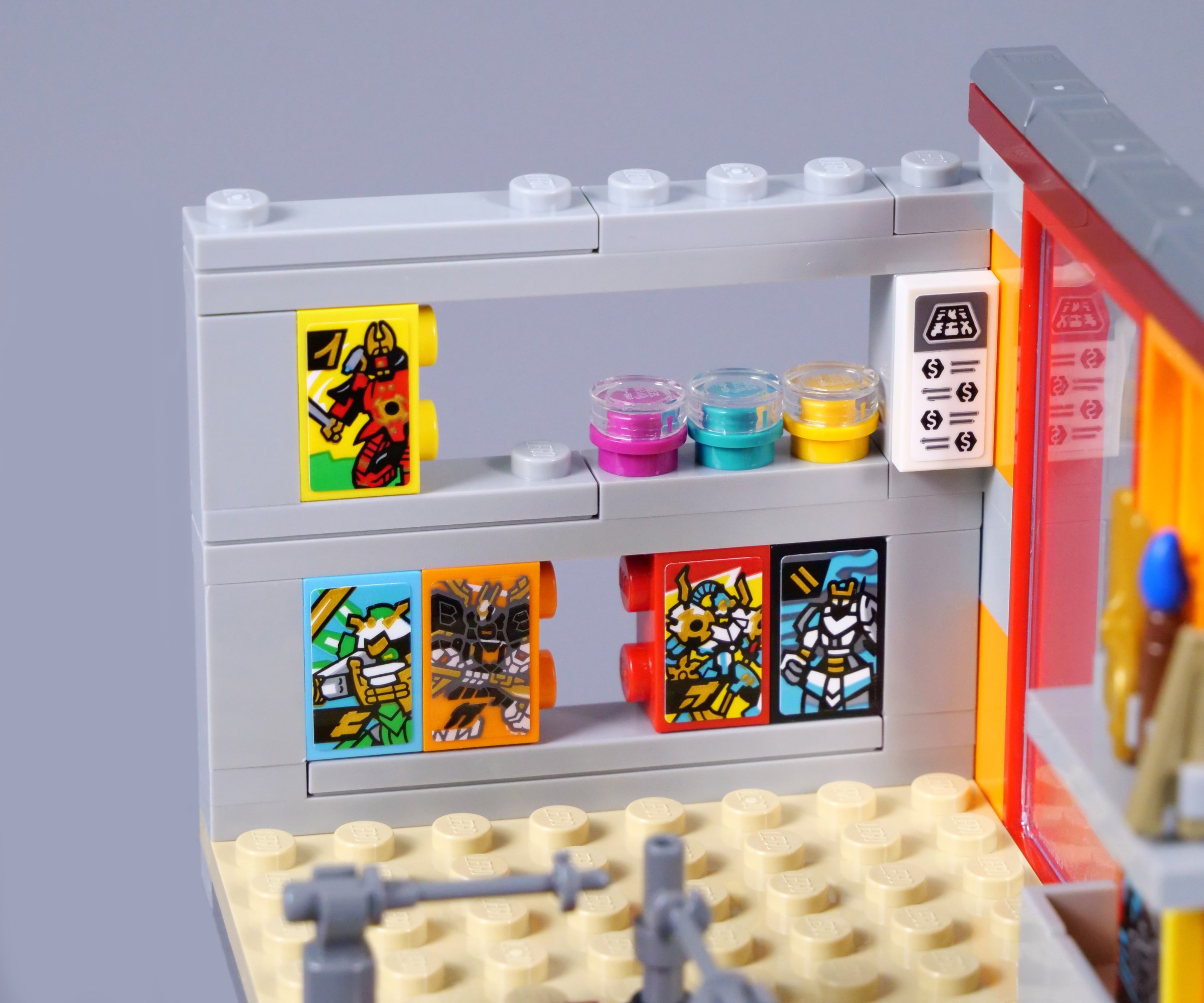 The striking Ninpla model shop stands in stark contrast to the buildings underneath, as one of the most colourful businesses anywhere in NINJAGO City! The shop is named after Gunpla, a range of plastic model kits based on Gundam mecha and vehicles, which has obviously had an enormous influence on NINJAGO designs.