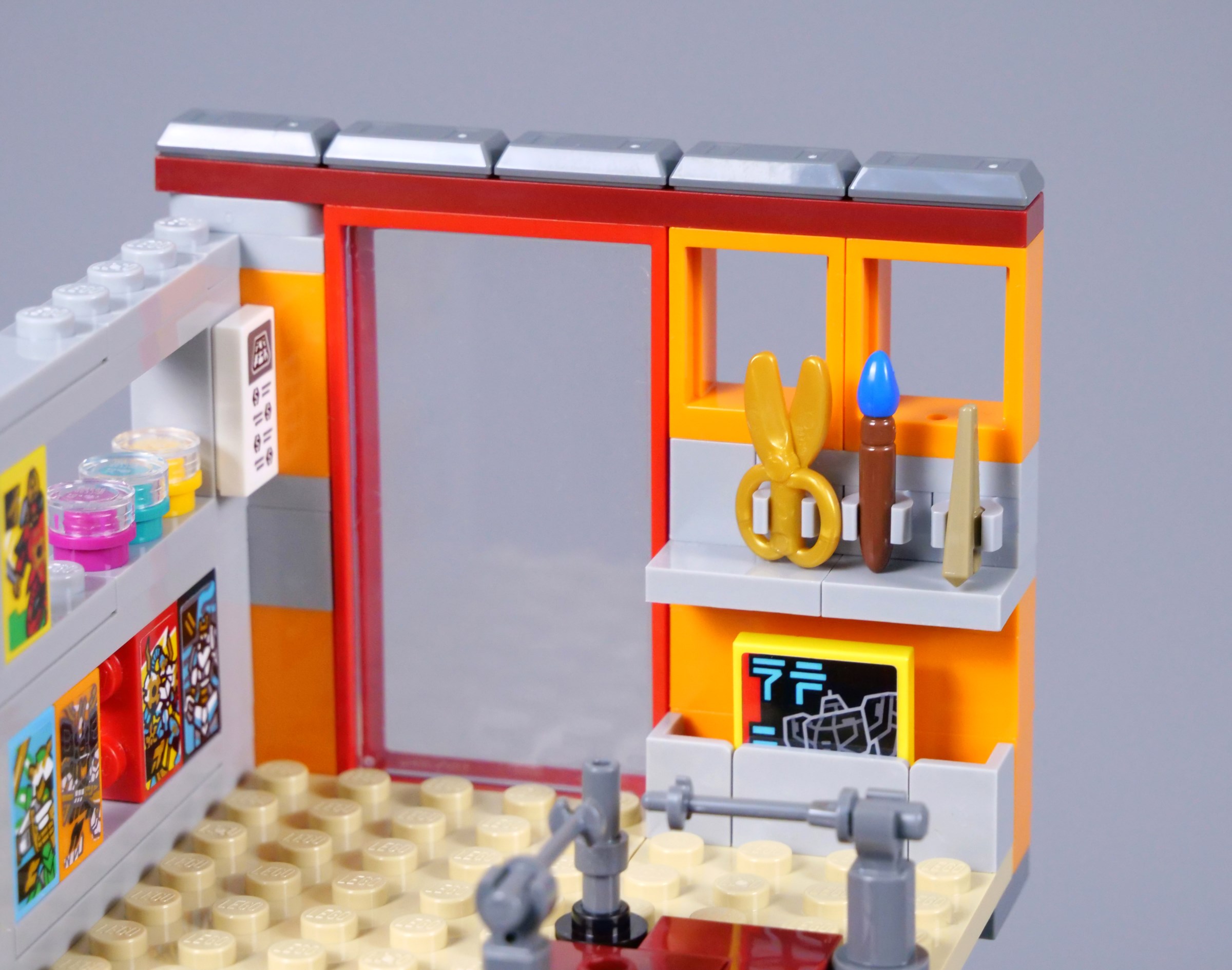 The back of Dorama's shop looks a bit untidy, although any odd colours are used to add detail inside, which I consider worthwhile. Also, I like how the pearl gold windows double as points to grip the wall when removing the interior, a technique used throughout this set.