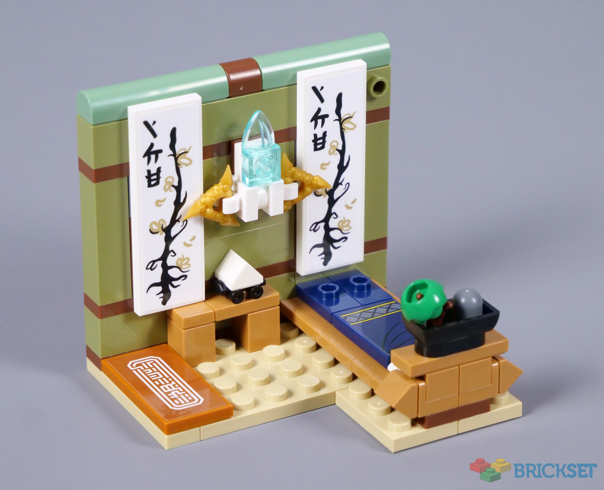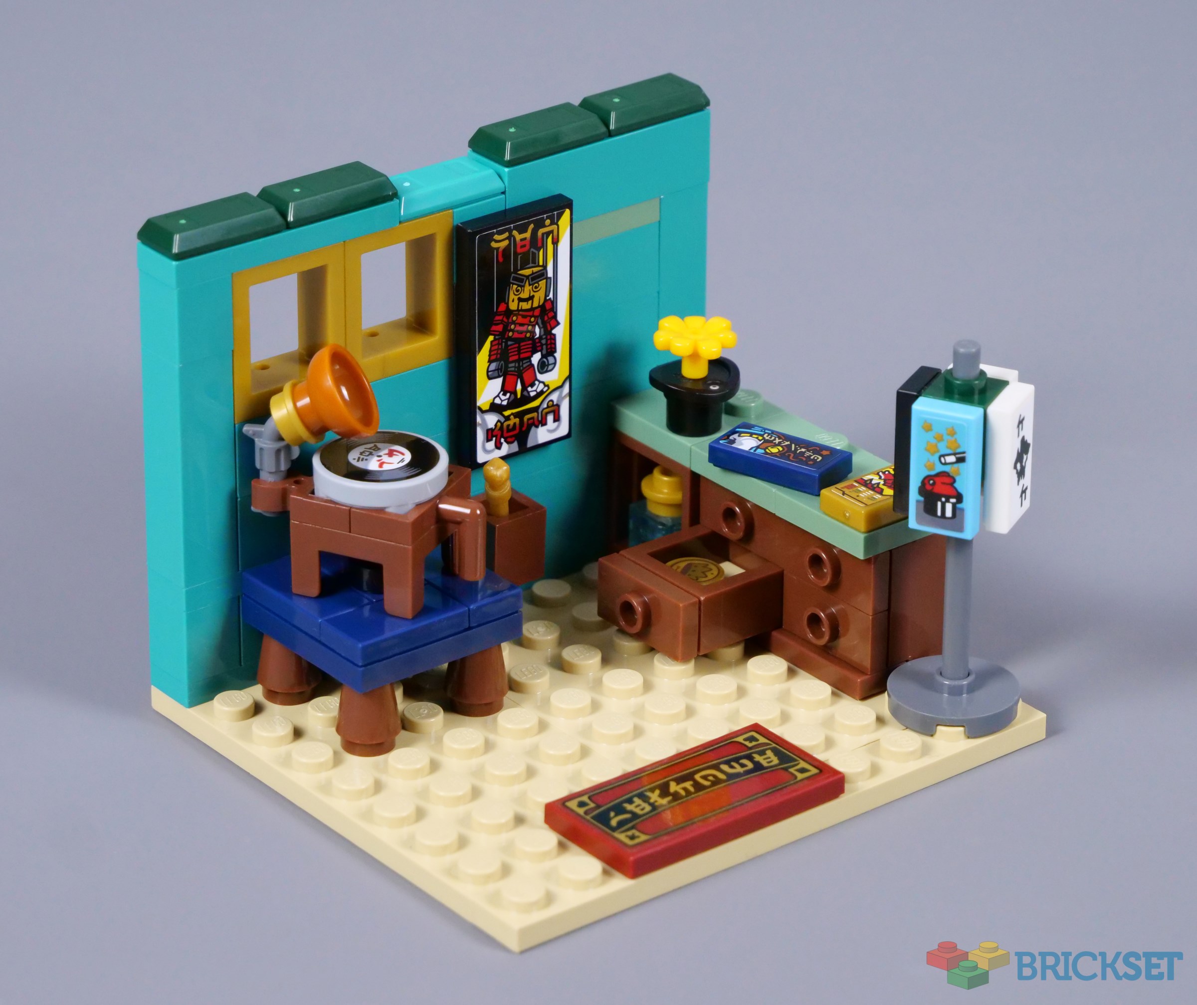 Otherwise, this room contains a poster for a new show featuring Dorama's puppet, a coin in a drawer and a couple more stickered tiles. One features the famous wizard Majisto from LEGO Castle, while the other recreates Nya's character card from 2172 Nya. I am glad the tradition of including these minifigure-scale cards in certain sets carries on.