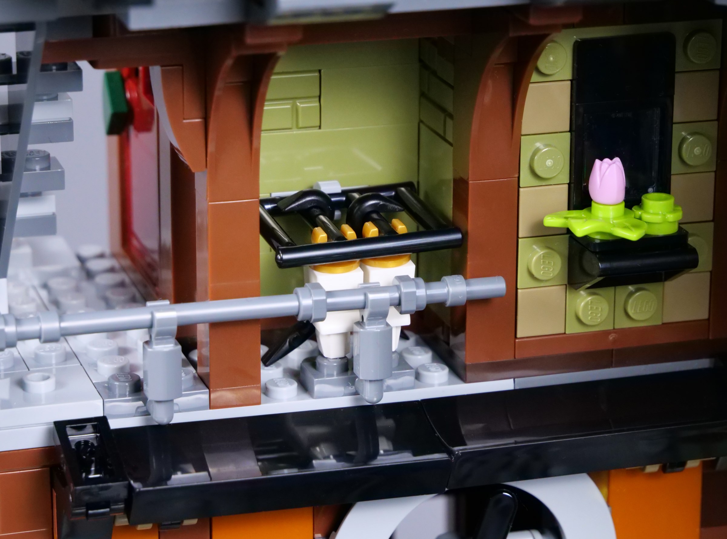 You can access the kitchen area by sliding out the whole interior, which is a feature returning from 71799 NINJAGO City Markets. There is not a huge amount of detail inside, although the compact stove looks reasonable and I like the colourful sauces on the shelf. The jumper plates on the floor are welcome too, for posing minifigures.