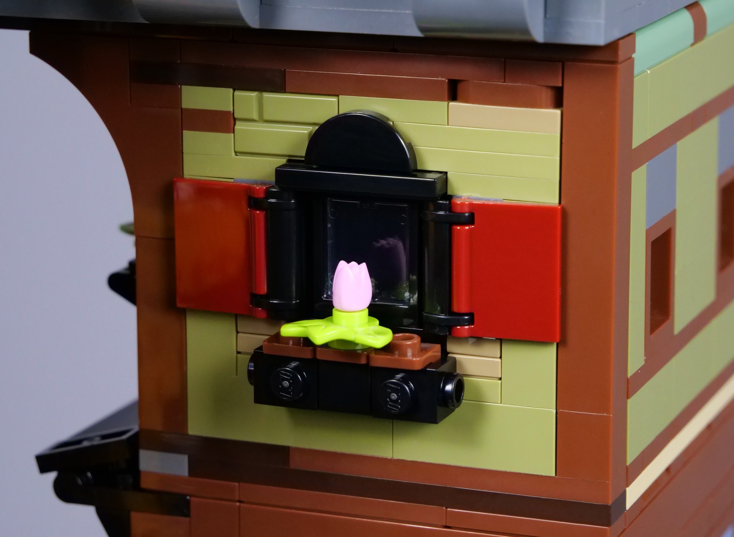 The window on the side of the apartment is another impressive feature, using books as part of the frame and dark red book covers as shutters, which hide messier parts of the structure. The result looks wonderful, brilliantly finished with a 1x2 semicircular tile and a window box to match the front window.