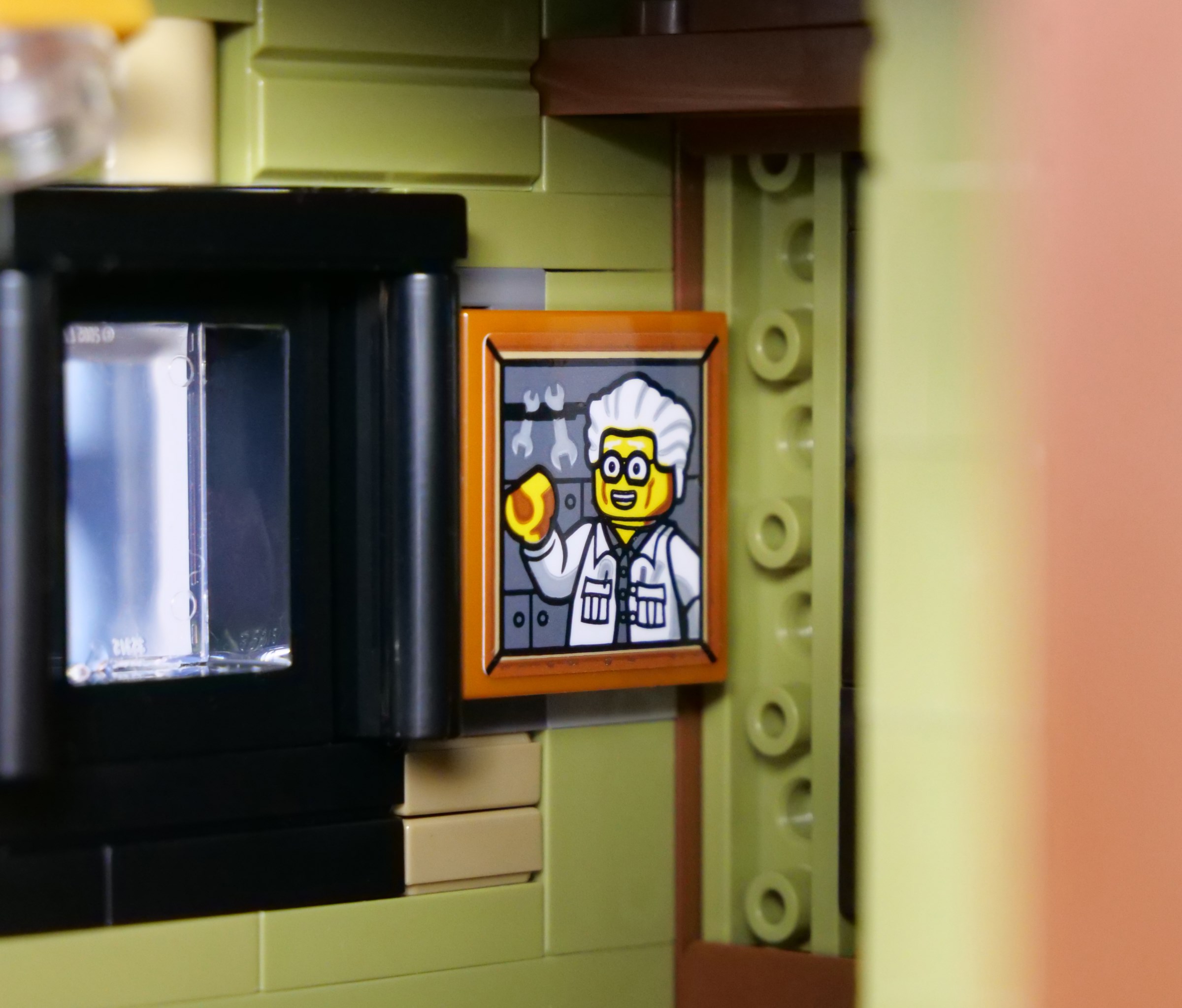 The interior of Zane's apartment slides out and leaves some interesting details behind, like the curtains in Dorama's shop, as two stickered portraits flank the side window. The first depicts Dr. Julien, Zane's creator and a character definitely deserving of a minifigure in the future.