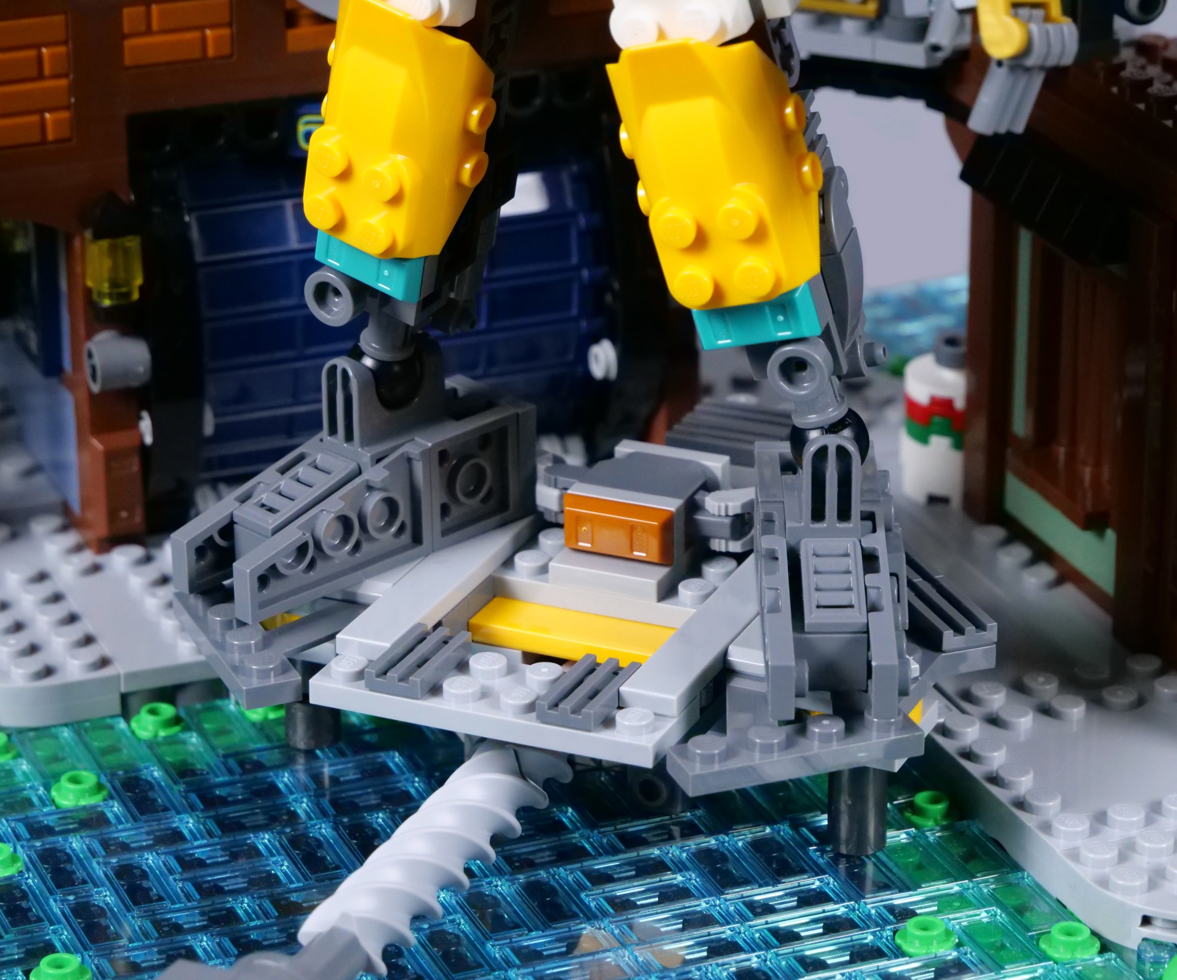 The hook cannot actually reach the ground, only extending just under Zane's apartment. While this is comfortably enough to attach sections of armour to the mech's arms and torso, the other crane and minifigure intervention will be required for the legs.