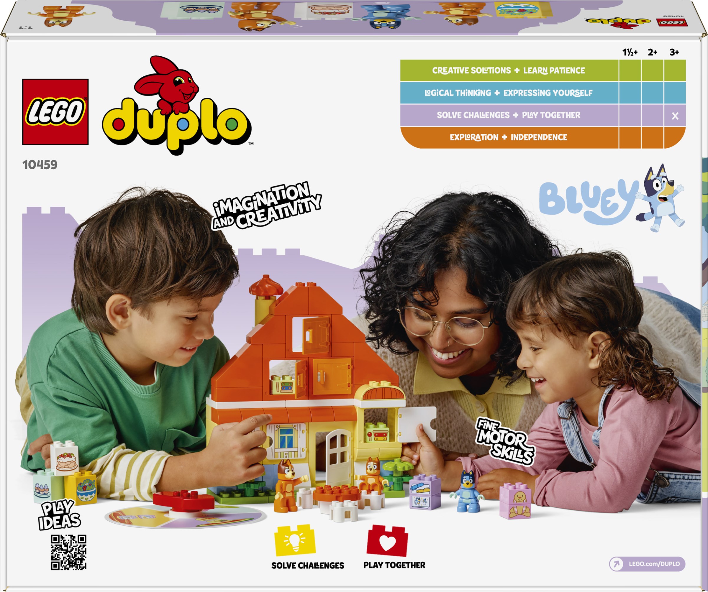 The LEGO DUPLO (10459) Bluey's Family House with Memory Game set gives ages 3+ and their families a fun building experience combined with two different memory games. After building the iconic Heeler Family House, families can engage in a memory game by twisting the spinner to find paired items and figures. The other side of the spinner introduces a second memory challenge, where it is possible to pair bricks to create well-known items from the show. The set includes figures of Bluey, Bingo, and Mum (Chilli).
