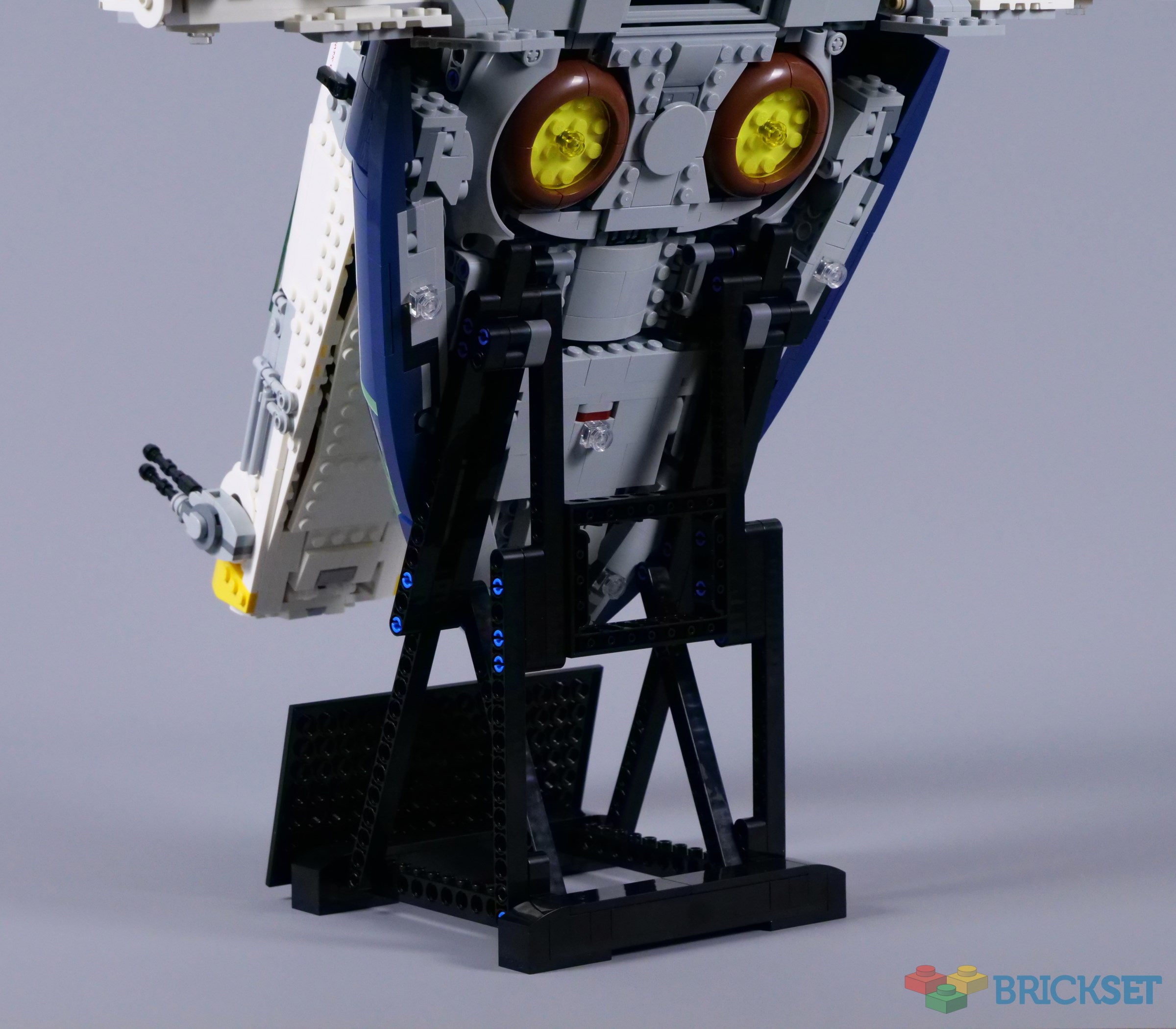 The display stand remains fairly consistent though, mirroring the skeletal style of these stands across the Ultimate Collector Series. The blue Technic pins are a bit distracting, but the simple structure feels completely stable. Additionally, the supports hardly interfere with details seen on the reverse, leaving as much as possible visible.