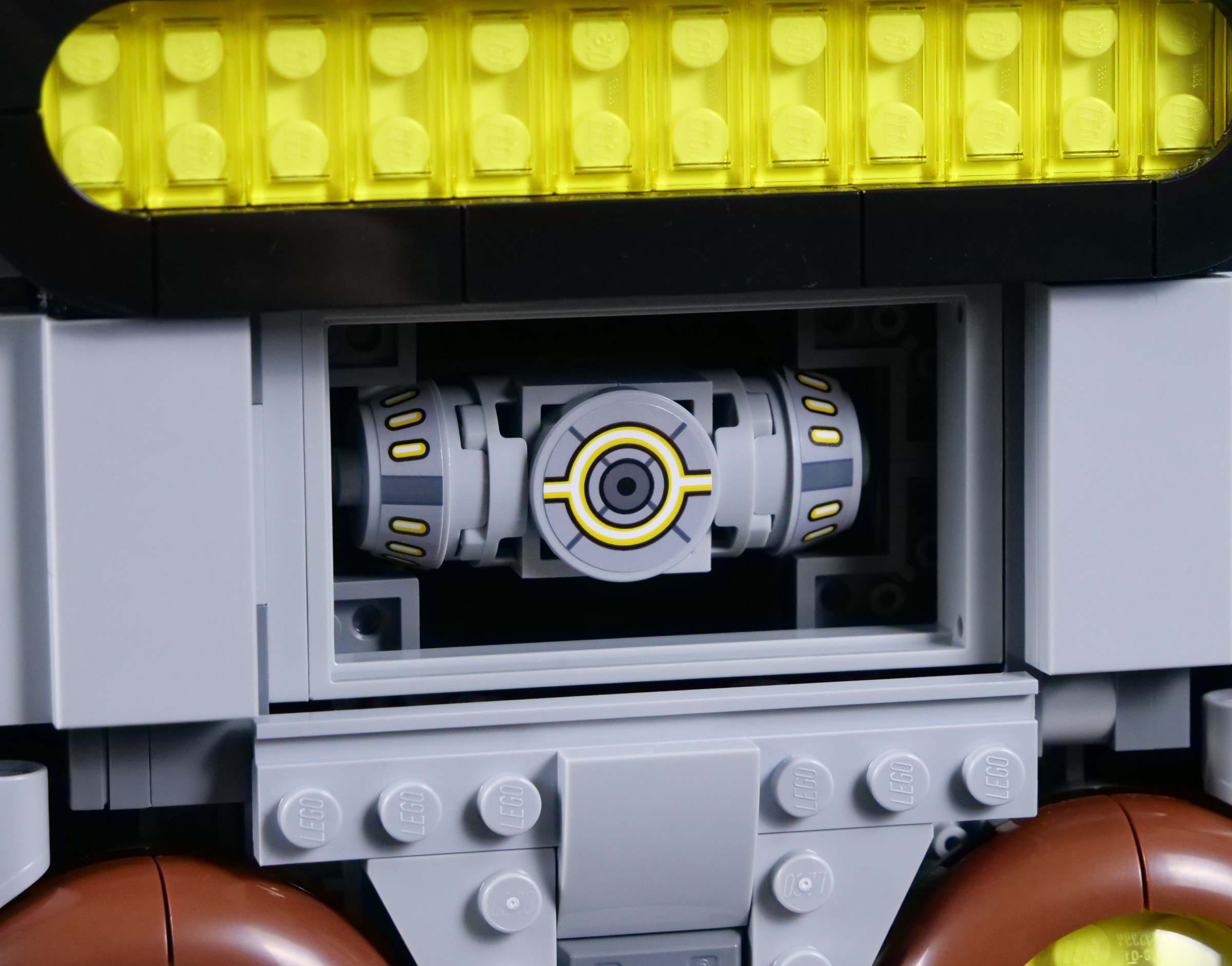 Slave I's engines are among its most recognisable features, with two round thrusters lower on the fuselage and a single engine band above. The use of reddish brown curved slopes around the lower engines is interesting and could look awkward, given the shade is not used anywhere else, but those pieces and the trans-yellow dishes inside really draw attention to the engines.