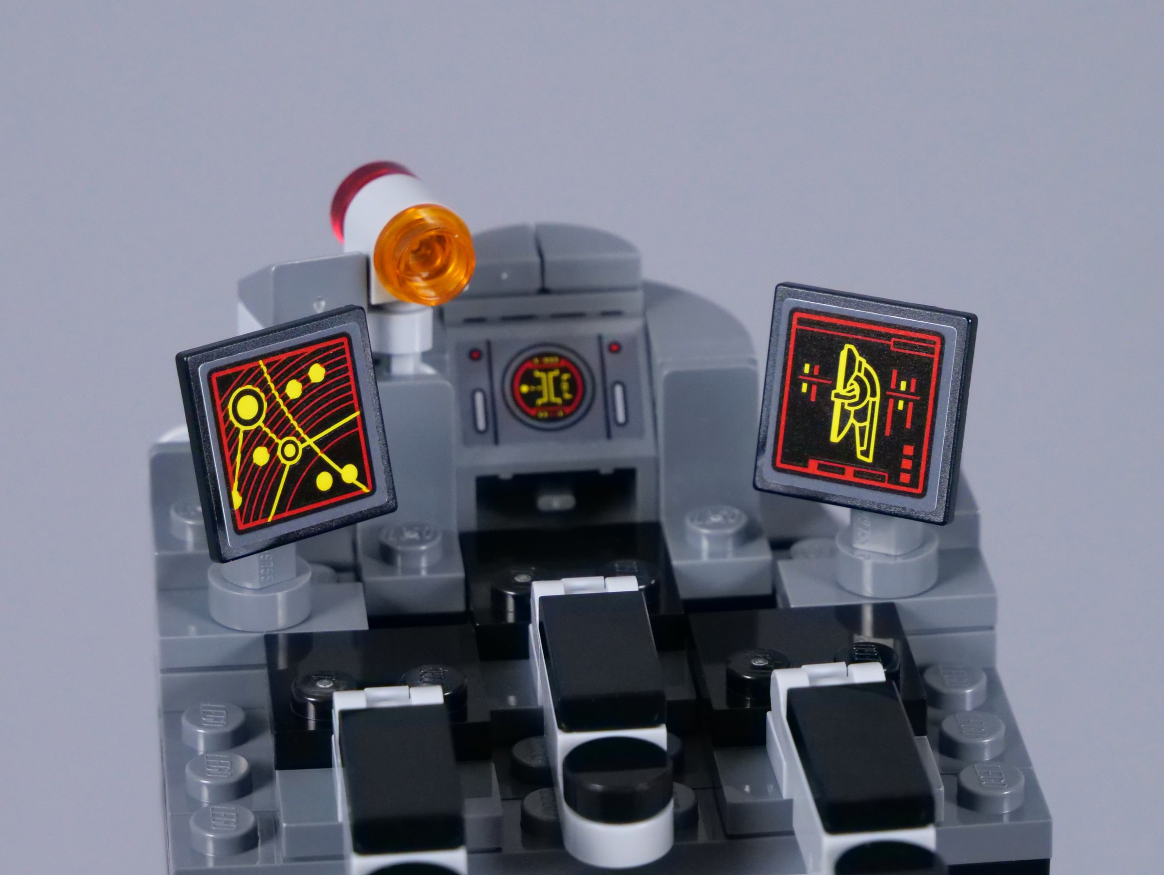 The upper deck slides out, which makes it much easier to place the minifigures inside. Three seats are available and their slender backrests are faithful to the film. Moreover, the stickered consoles are inspired by designs seen in Attack of the Clones, with a chart of nearby asteroids on the left, a status display on the right and the targeting computer in the centre.