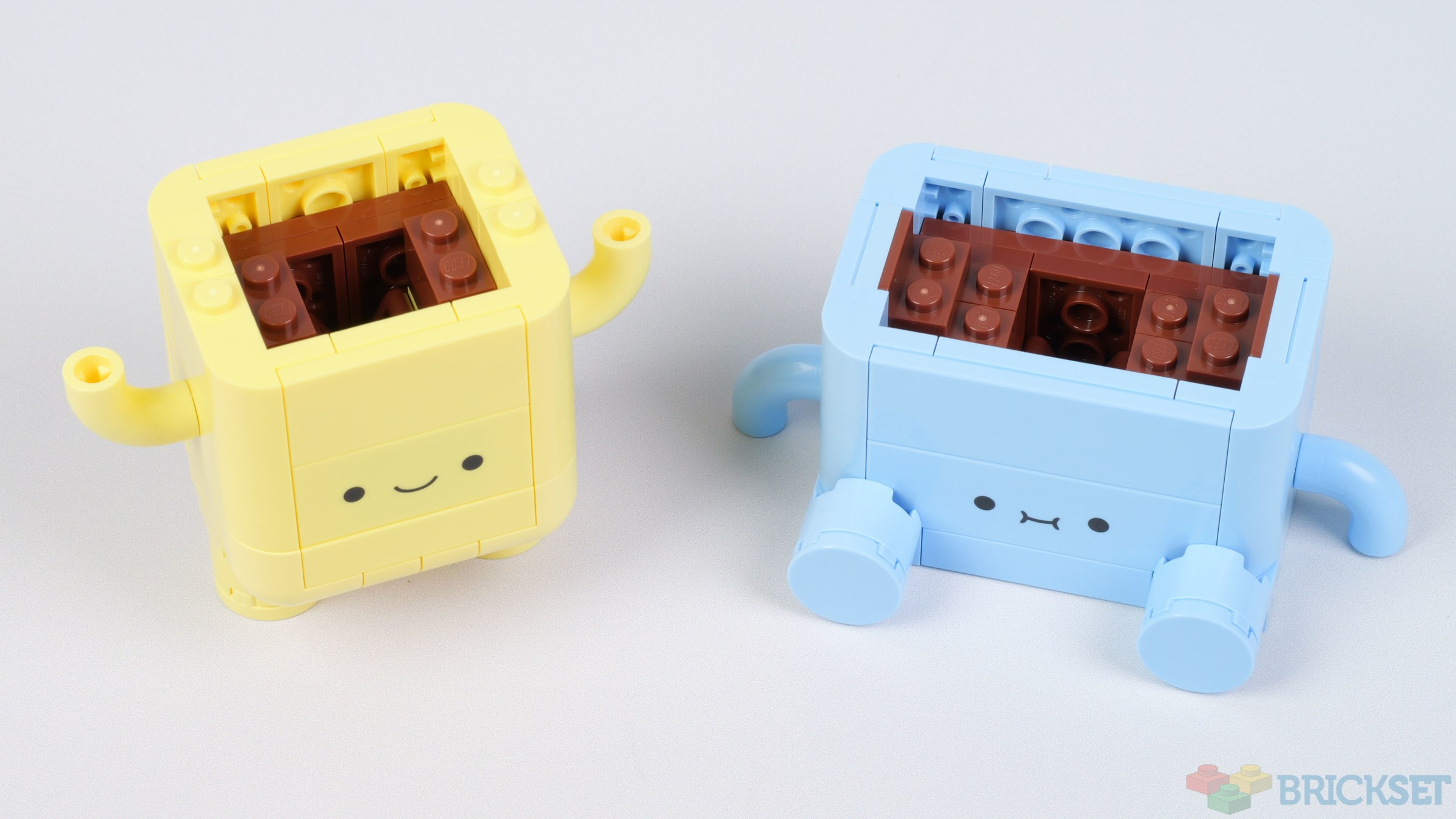 The pastel-coloured pots are bright and cheerful. The light yellow one is six studs wide and standing, while the royal light blue one is eight wide and sitting. Their faces are printed, and their 'macaroni' arms can be swivelled, to enable a degree of posing.