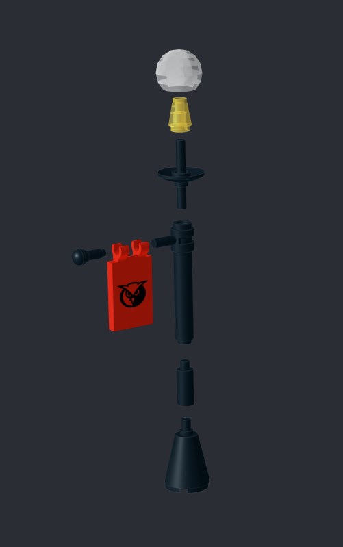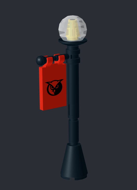 I wanted to include lampposts with banners, as they are a frequent site around university campuses, at least where I live. The bar of part 87617 worked perfectly to add the banner on the side while allowing the light on top of it, and the microphone element nicely rounded off the banner support assembly.