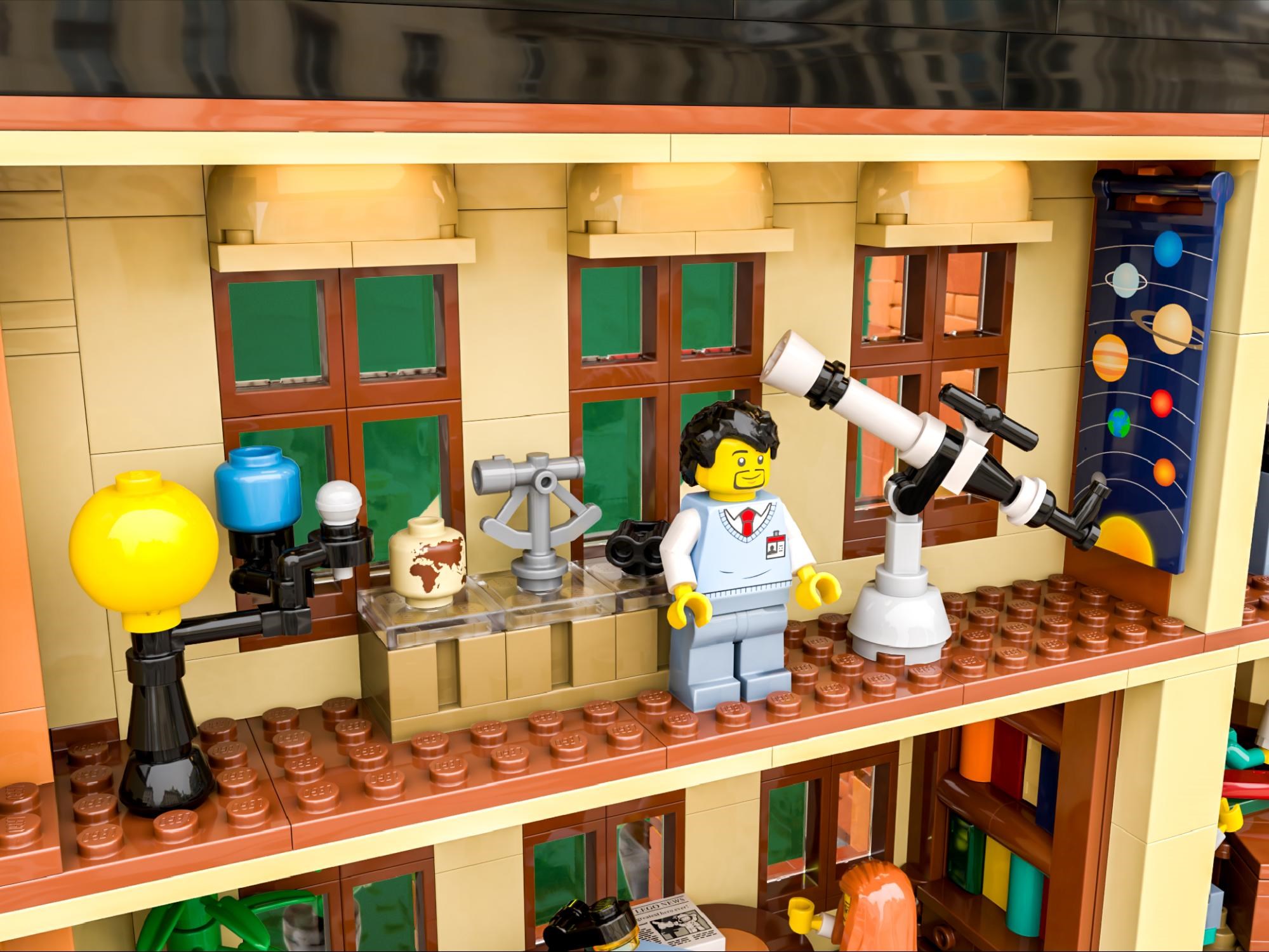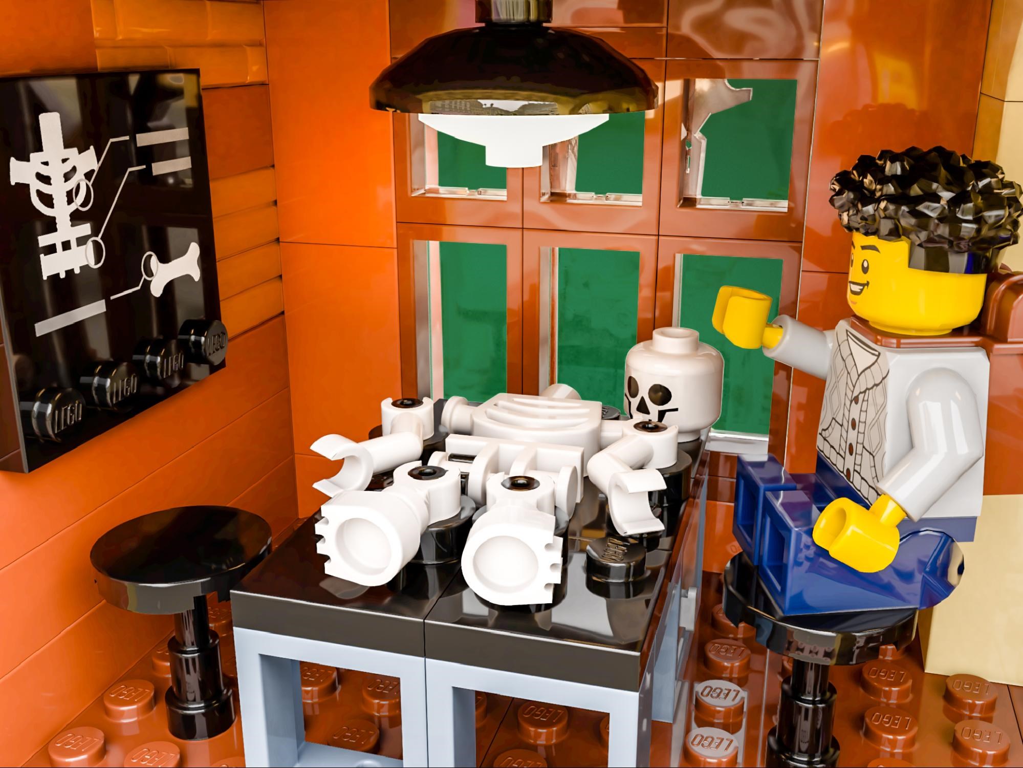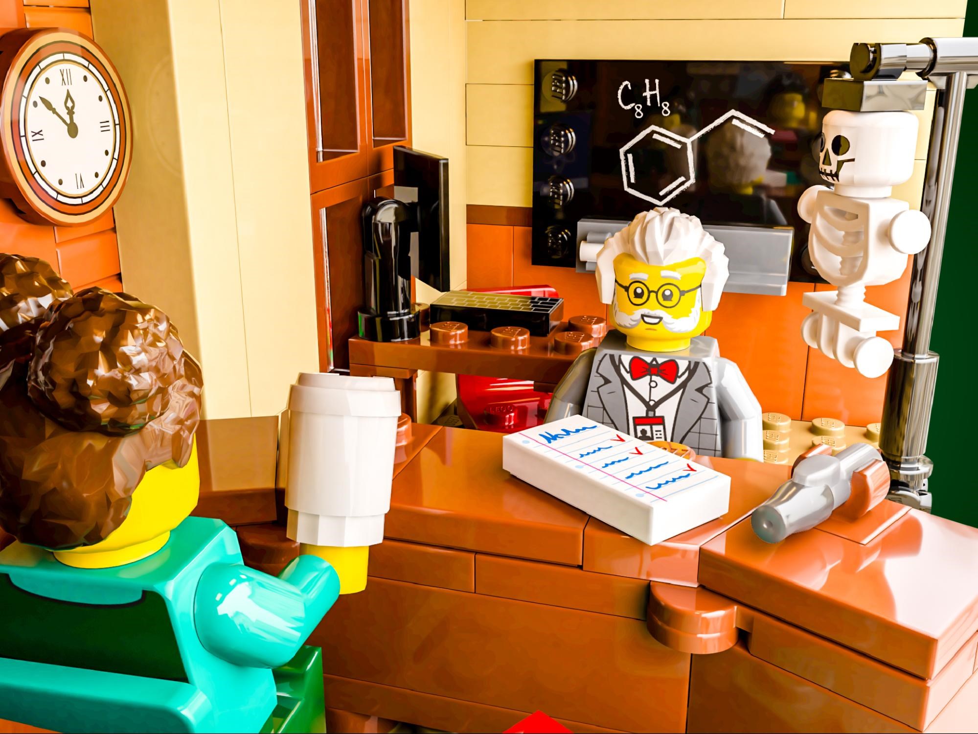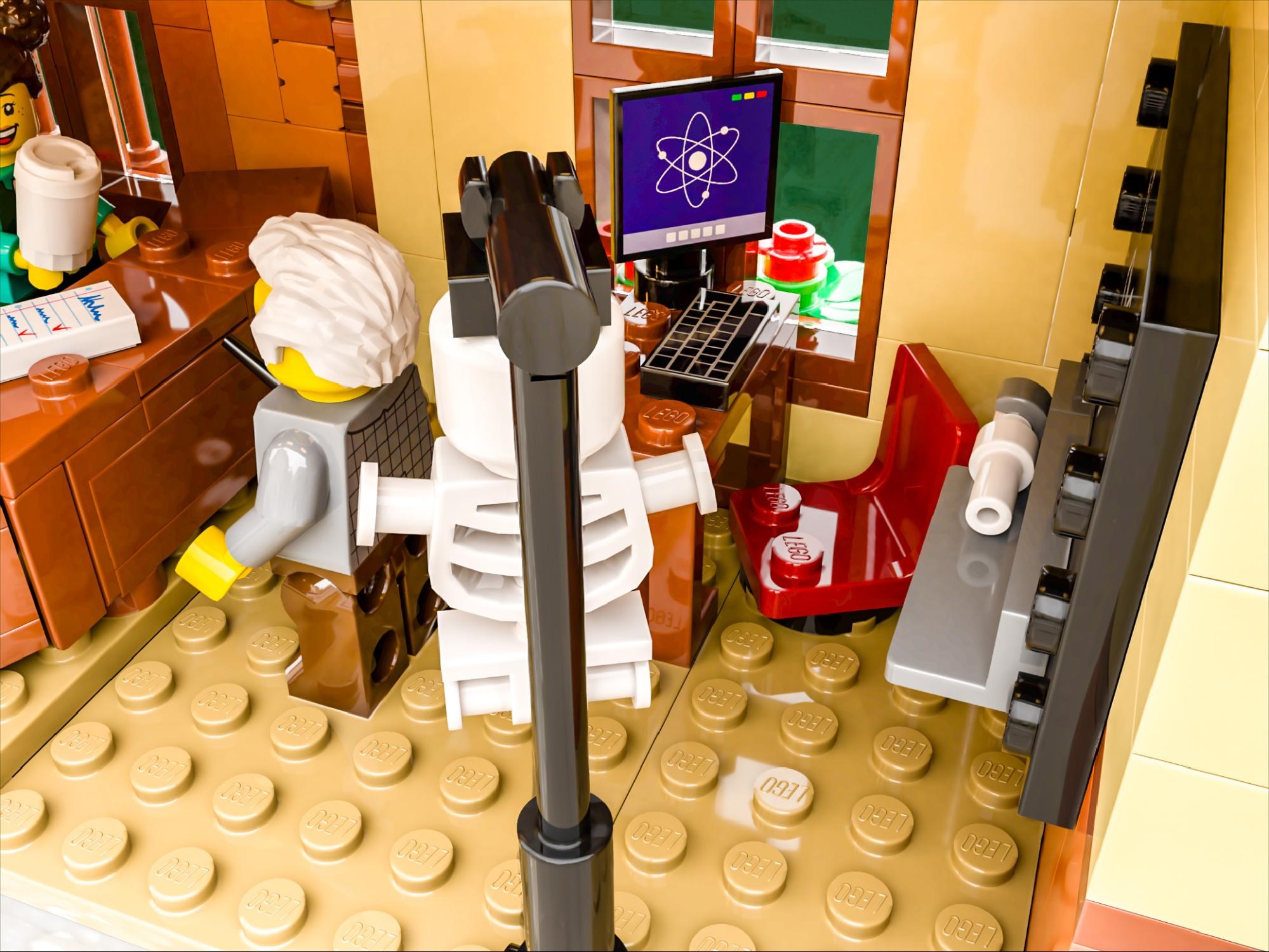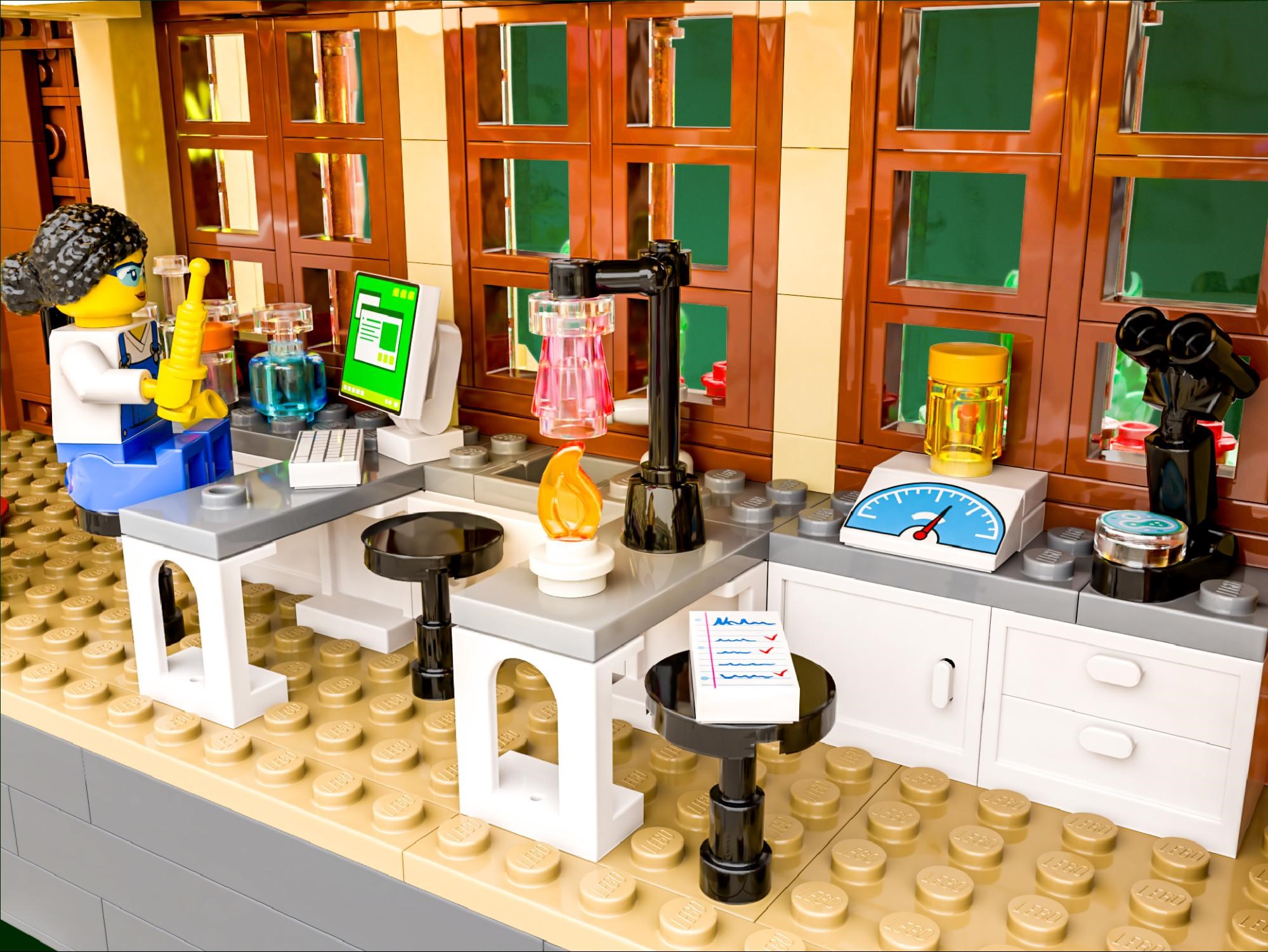 With the classroom, I decided not to focus on one single field of science but instead have references to multiple fields, making it suitable for whatever you want to highlight. The skeleton model references anatomy, while the atom on the desktop background and the blackboard reference chemistry. Fun fact, the C8H8 on the blackboard is styrene, one of the elements of ABS which LEGO bricks are made of!