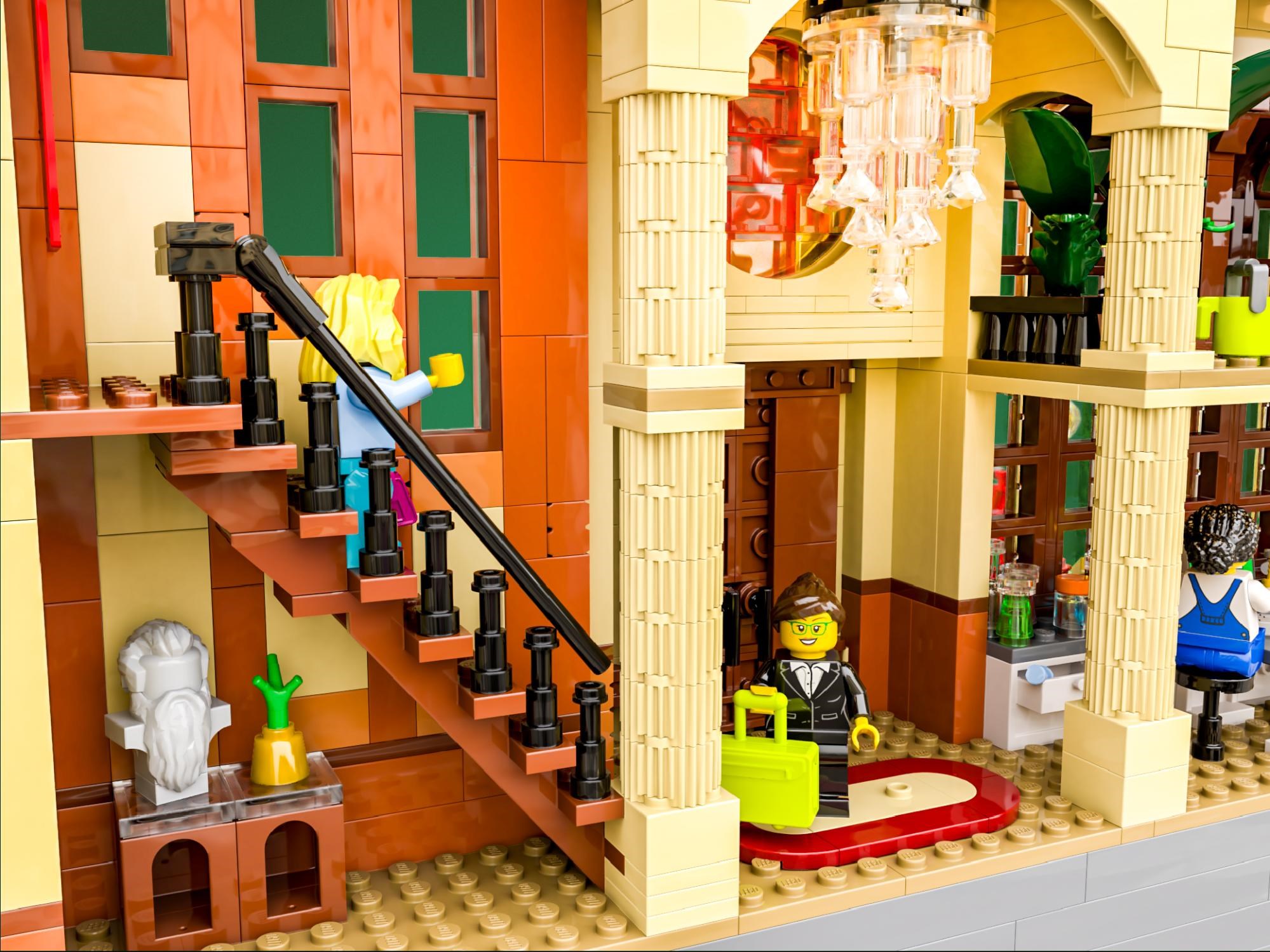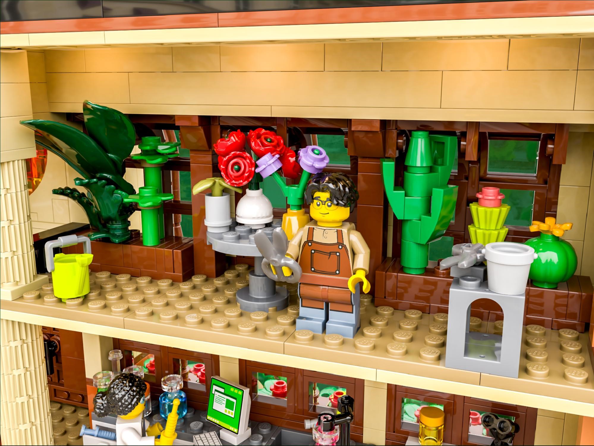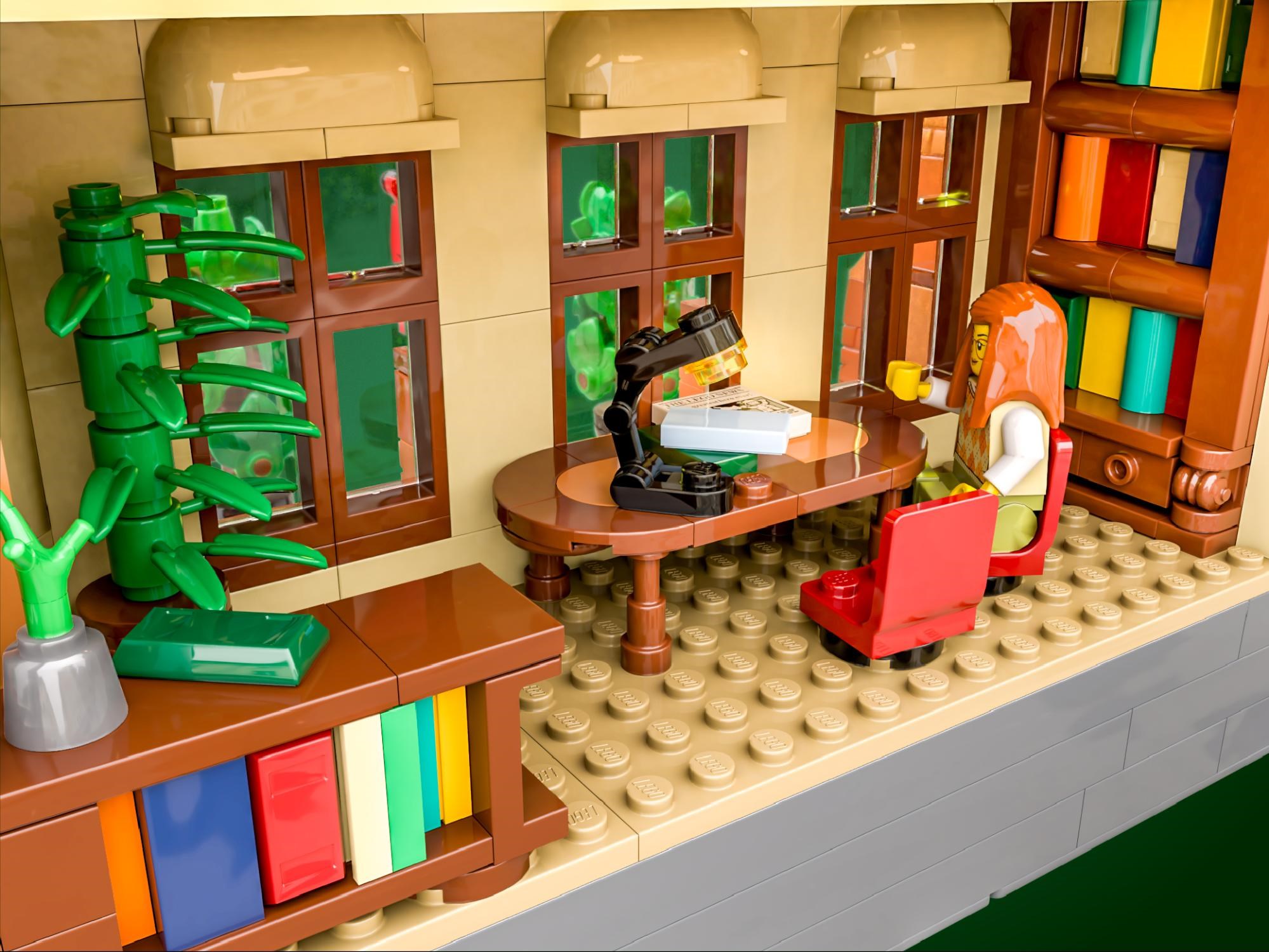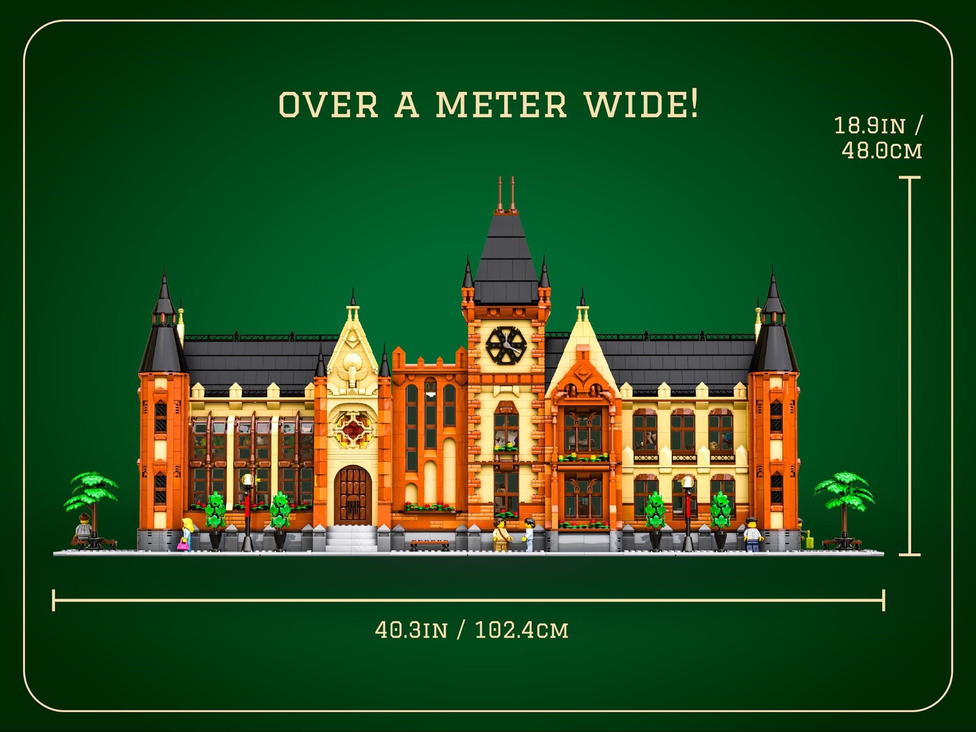 Speaking of the building’s size, I was really happy with how this version of the university captured a sense of the large scale of a campus. In open form, the model is four baseplates wide (128 studs), resulting in a model that’s more than a meter wide (40.3in / 102.4cm). The closed form is more palatable for those wanting to fit it in a city, with a footprint of 32x64 studs, similar to the IDEAS Botanical Garden and twice the size of a typical modular building. It’s no slouch when it comes to height either, maxing out at 18.9in / 48cm, helping it tower over most modulars.