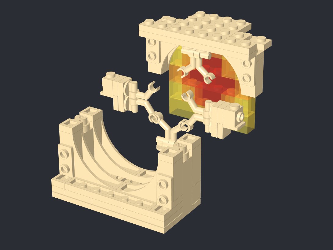 I originally considered having hinges to smoothly open and close both halves, but the connection point of the hinge elements juts out and would have prevented the design from sitting flush next to another building. It also would have made model transportation more difficult, so I settled on a clip and bar connection system.