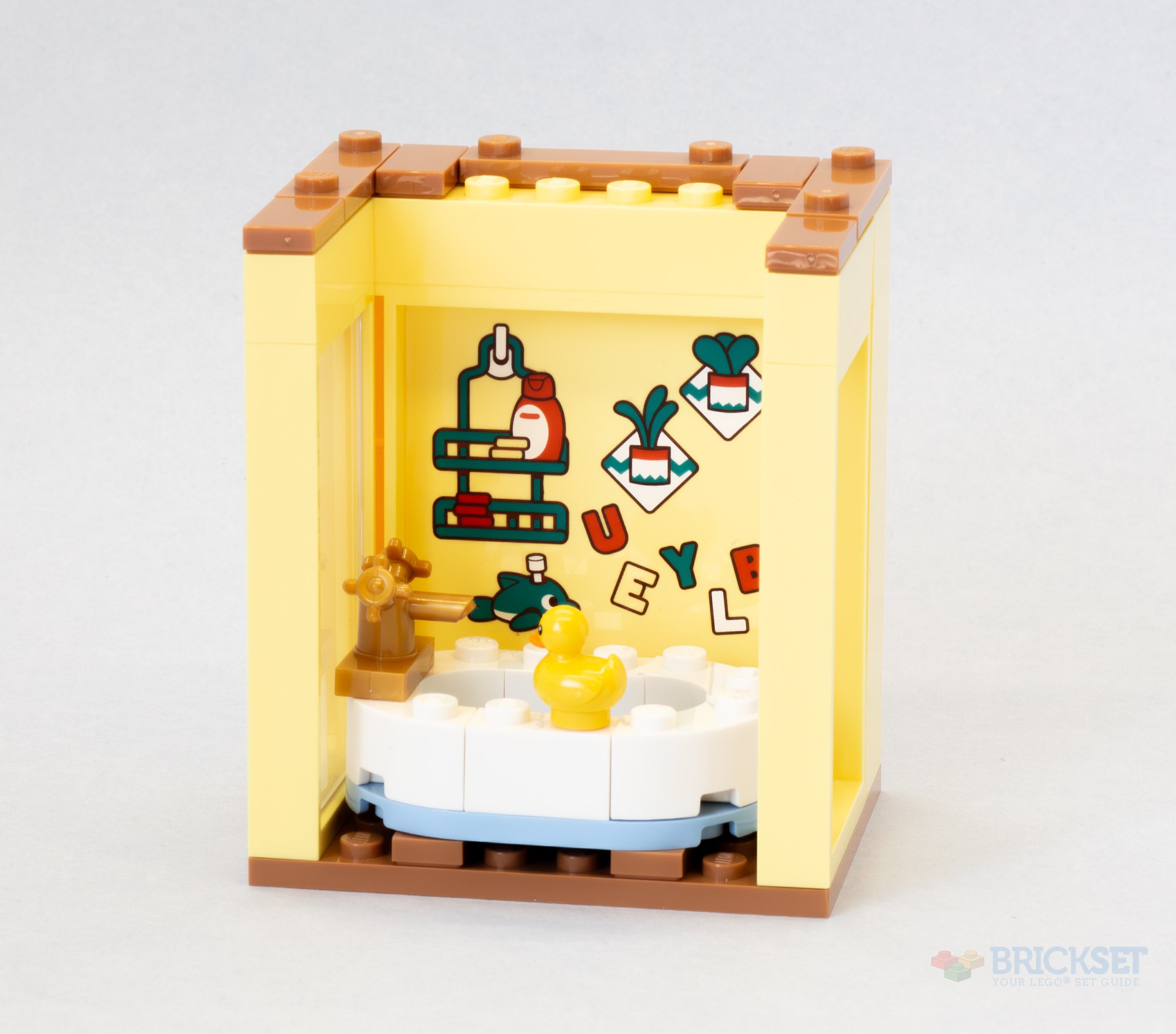 Above the kitchen sits the bathroom, with a very small footprint in this LEGO version. Only the bath is included, with the printed wall panel depicting the plants on the wall behind it, and foam letters (spelling the word Bluey) that they play with in numerous episodes.