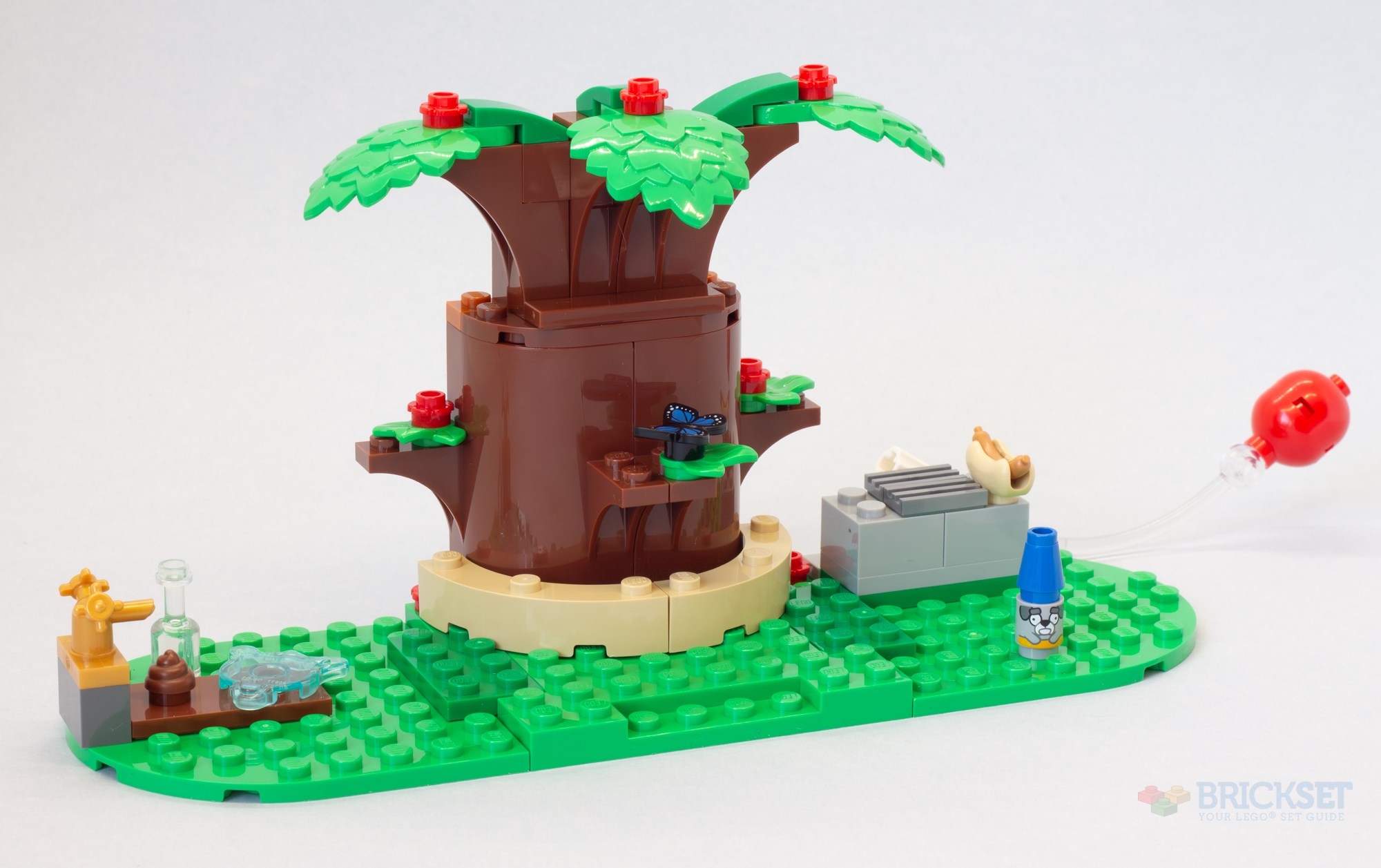 Finally, a small section of the Heeler's garden is included, complete with the large Royal Poinciana tree, surrounded by a circular bench. A butterfly sits on one of the branches of the tree, a creature Bingo names Flappy in the episode Slide. A bottle sits next to a tap, which has spilt some water on the ground along with a suspicious-looking dog poop. The other side of the tree is Bandit's barbecue, an hotdog (do they call them that when they themselves are dogs?!), and a red balloon. The balloon is a nod to one of the earliest episodes, Keepy Uppy, and is attached to the rear of the barbecue by a transparent rod on a Technic pin, allowing it to rotate and the balloon be bounced up and down.