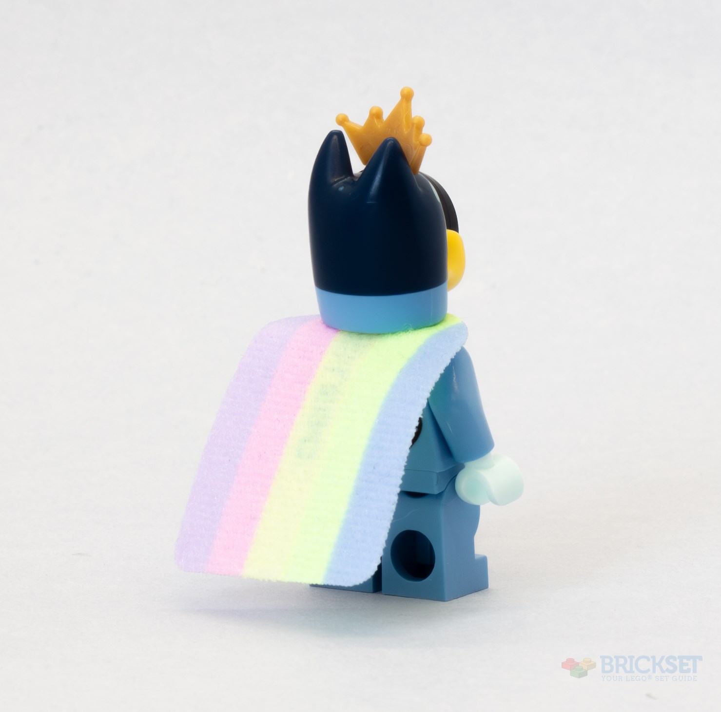 Bluey's wearing a crown, holding a magnifying glass, with a rainbow-coloured cape draped about her neck. This is a direct portrayal of her outfit in Queens, shown below.