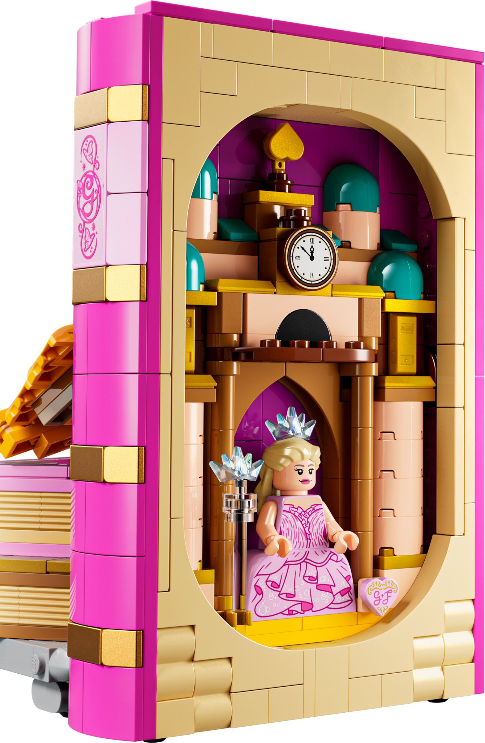 Elphaba’s green bookend includes her green elixir bottle, a model of Emerald City and a Grimmerie housing with secret compartments for The Wizard and Fiyero minifigures. Inside Glinda’s pink LEGO book nook is a Shiz University model. A butterfly model nestles on top of a book stack that has a compartment for the Madame Morrible and Pfannee minifigures.