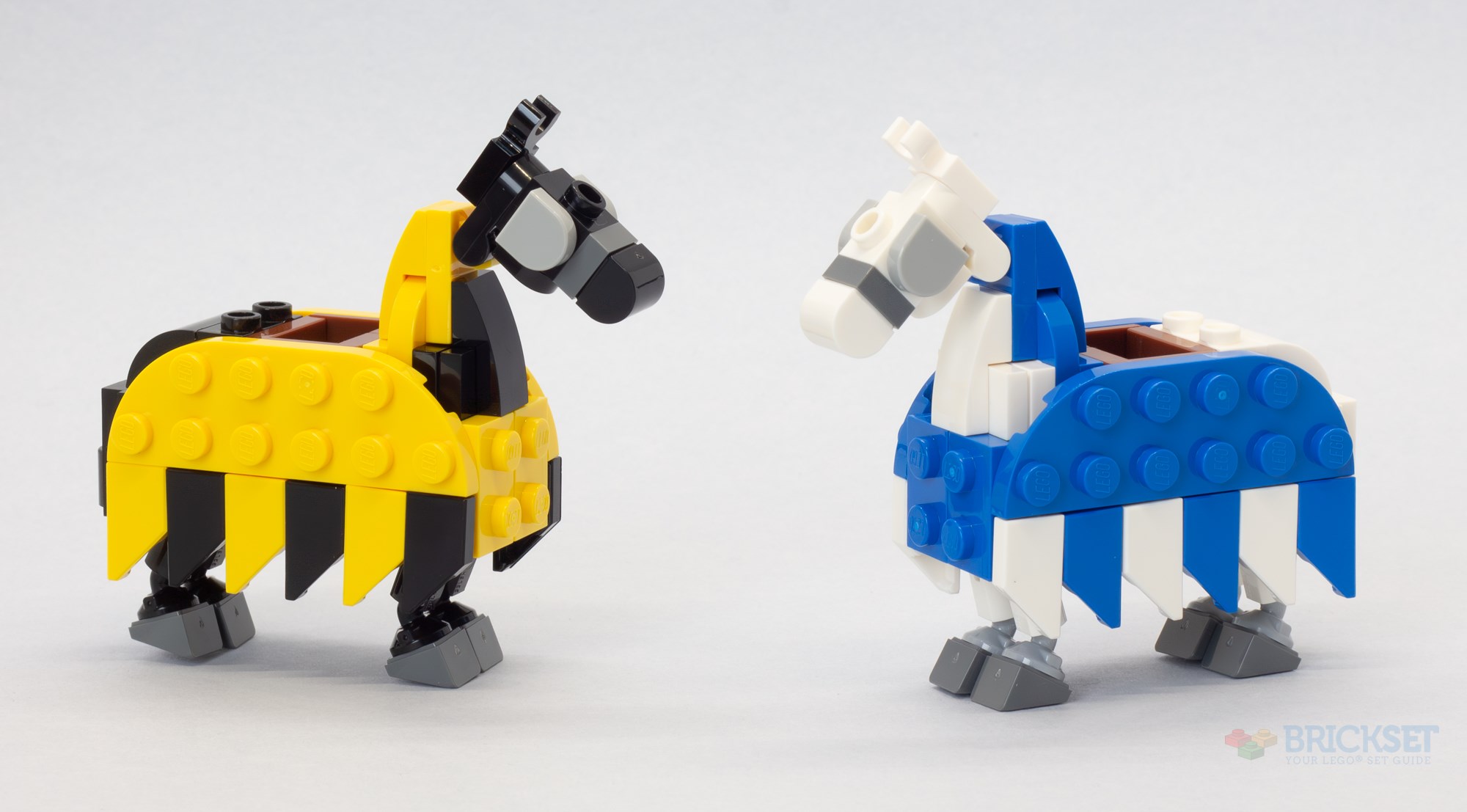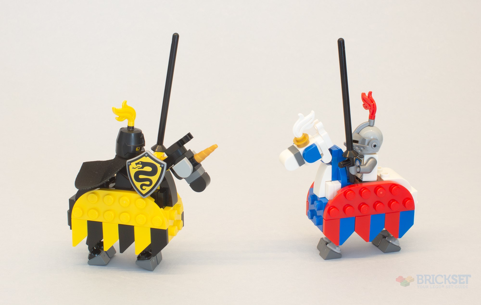 It wouldn't be a jousting tournament without the knights and their steeds, and these are built identically to those in the main castle model, although both horses now sport more detailed head gear—the black one looks somewhat like a unicorn! The white horse's colours have changed from blue and white to blue and red, and the shape of its caparison is slightly different.