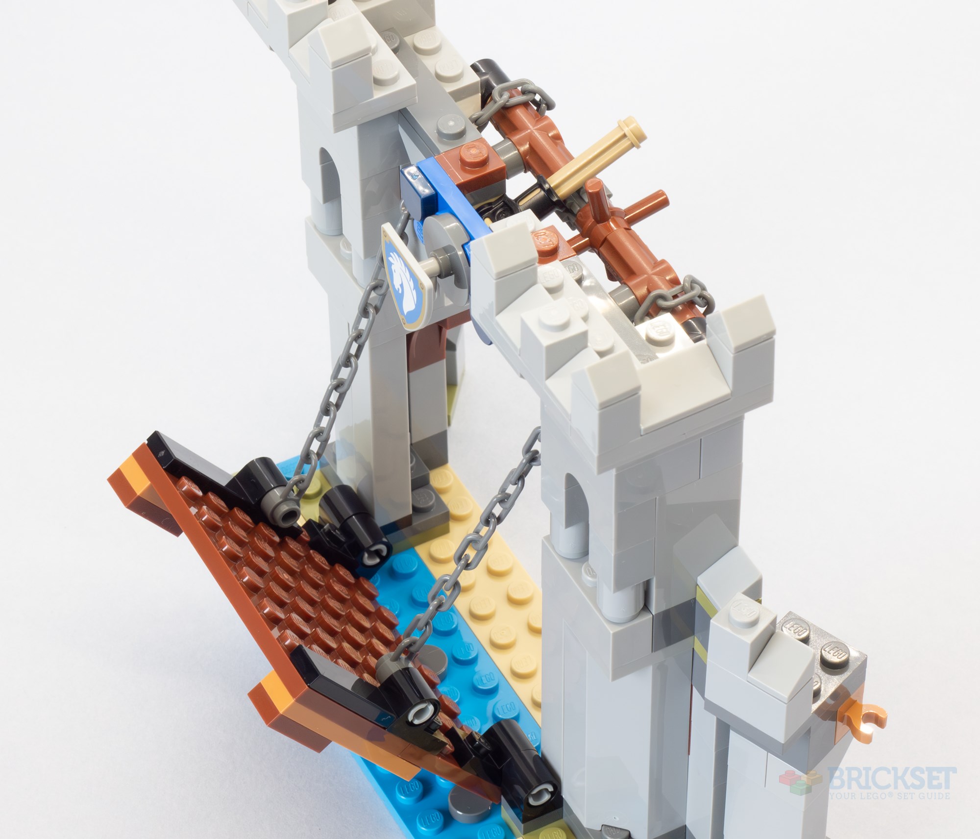 Once raised, the gear prevents the drawbridge from lowering again by catching on the bush on the tan lever—lifting the lever frees the axle to spin and the drawbridge will drop to the ground. It can be raised to vertical, although as you can see in the photo below, even when lowered there's still a strip of moat you must jump!