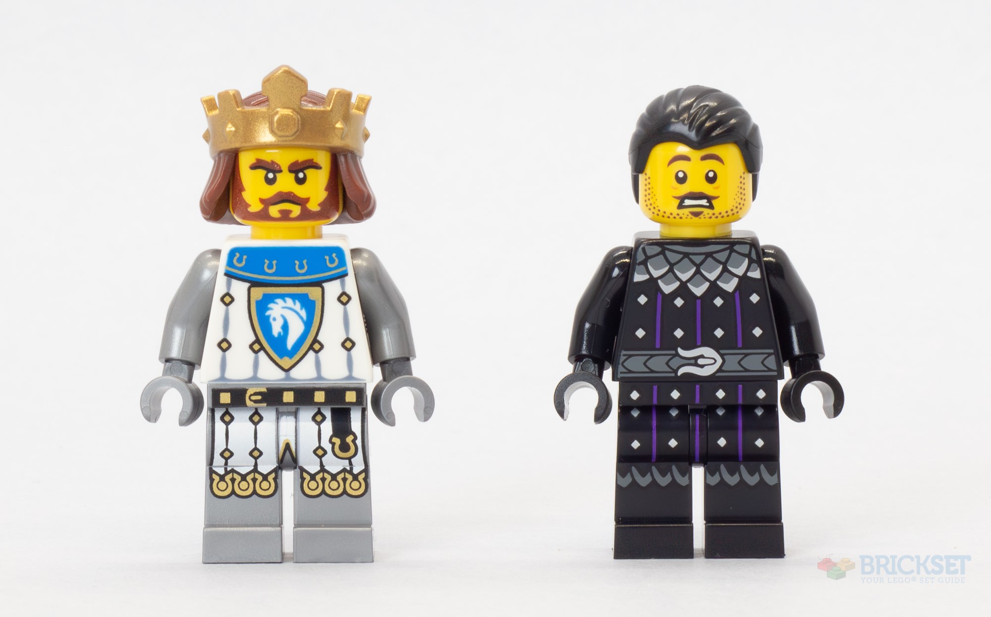 The set introduces us to two new factions from LEGO medieval times—the Horse Knights (hence the somewhat unwieldy set name) and the Serpents. The Horse Knight King is wonderfully detailed, wearing a white tabard over gleaming silver armour, decorated with blue and gold detailing and adorned with the crest of the Horse Knights, a horse's head in white on a blue shield, edged with gold.