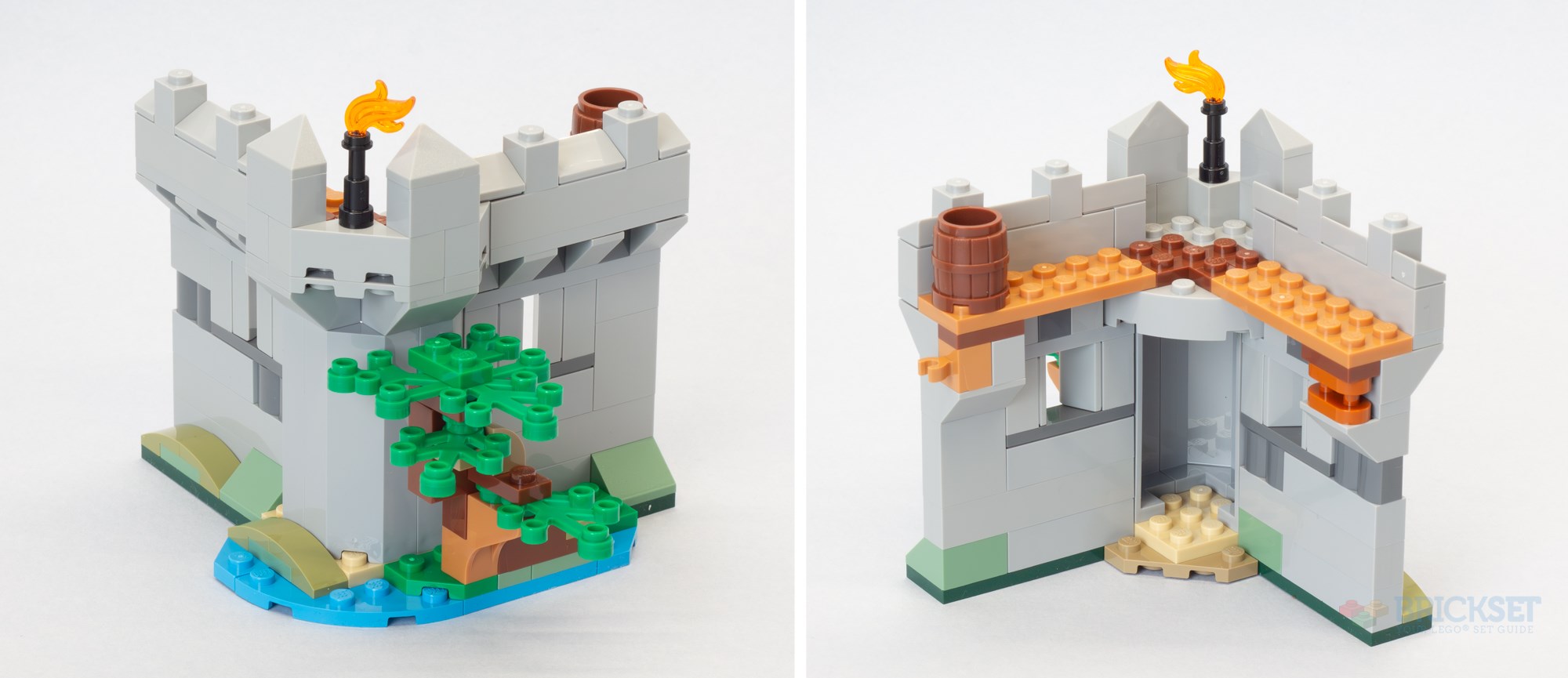 A small corner of the castle is built first, showing a tiny amount of moat at the bottom of mossy walls. Each wall houses an arrow slit, built with sideways slopes to realistically replicate the way medieval arrow slits were wider on the inside of the wall than the outside, to better facilitate firing a bow through them. Above, narrow battlements lead to a small room inside a thin tower, atop of which a flag flies.