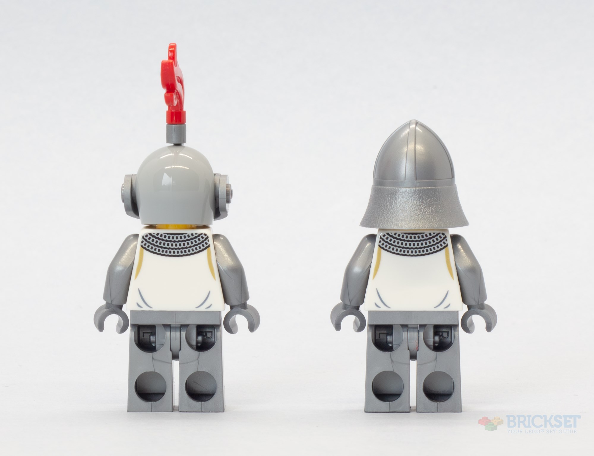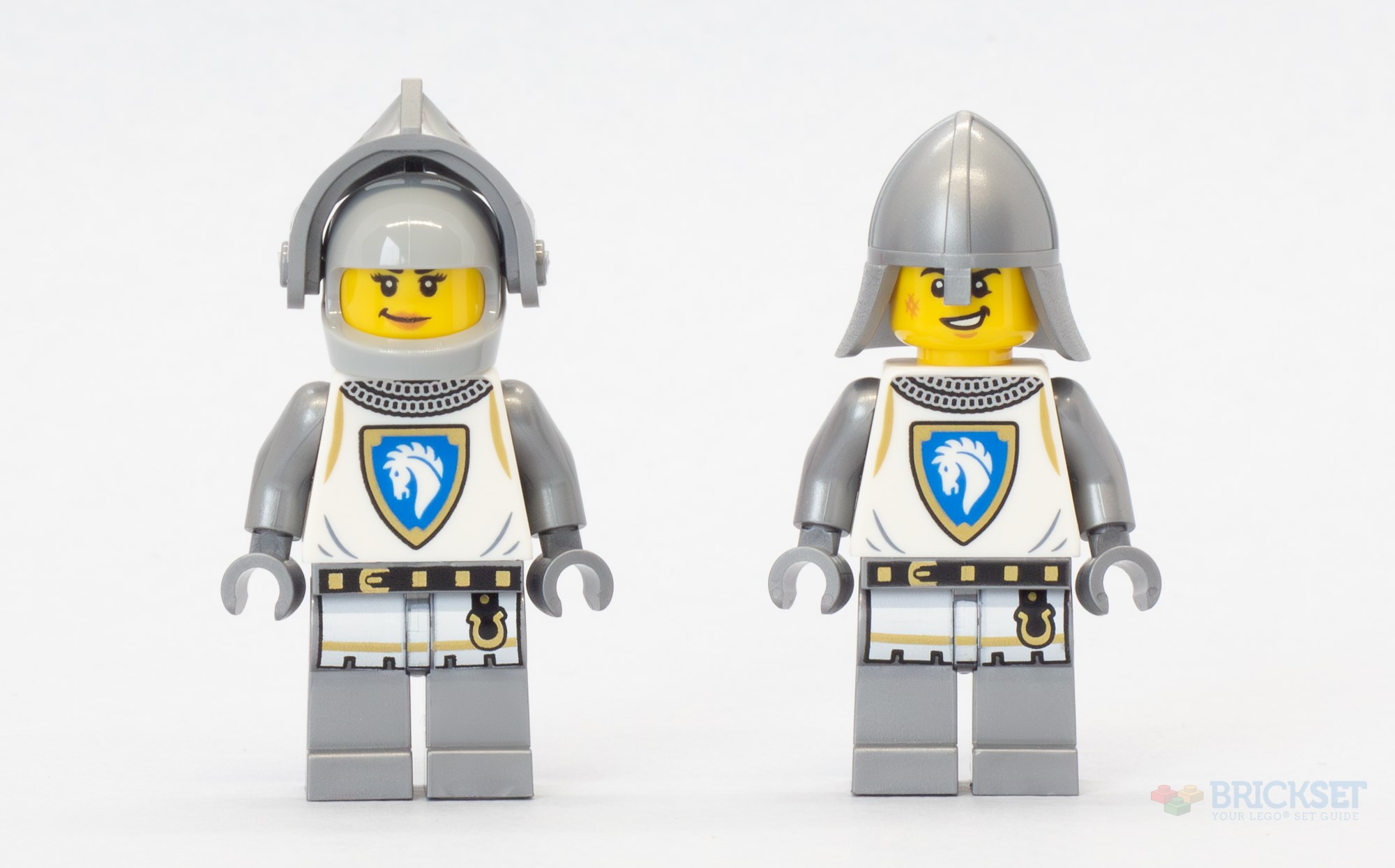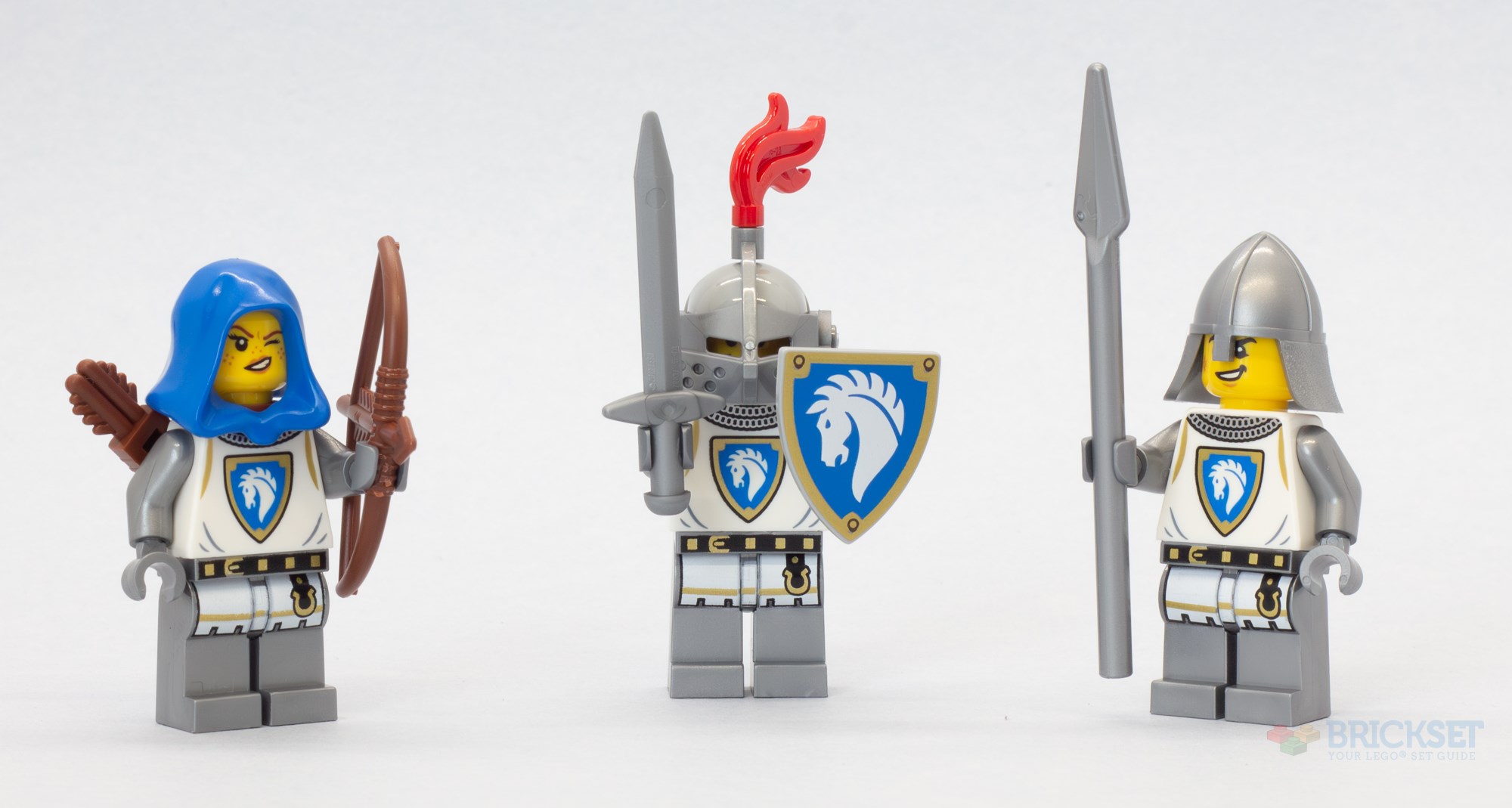 The Serpent Knight is the lone representative from his faction—the rest of the minifigures all belong to the Horse Knights. Three knights wear identical white tabards over their silver armour, similar to the King's but less detailed—the Horse Knight crest still large on their chest. The Horse Knight Champion wears a helmet with a large visor that can be lifted out the way, and the Horse Knight Spearman a more simple, pointed, one.