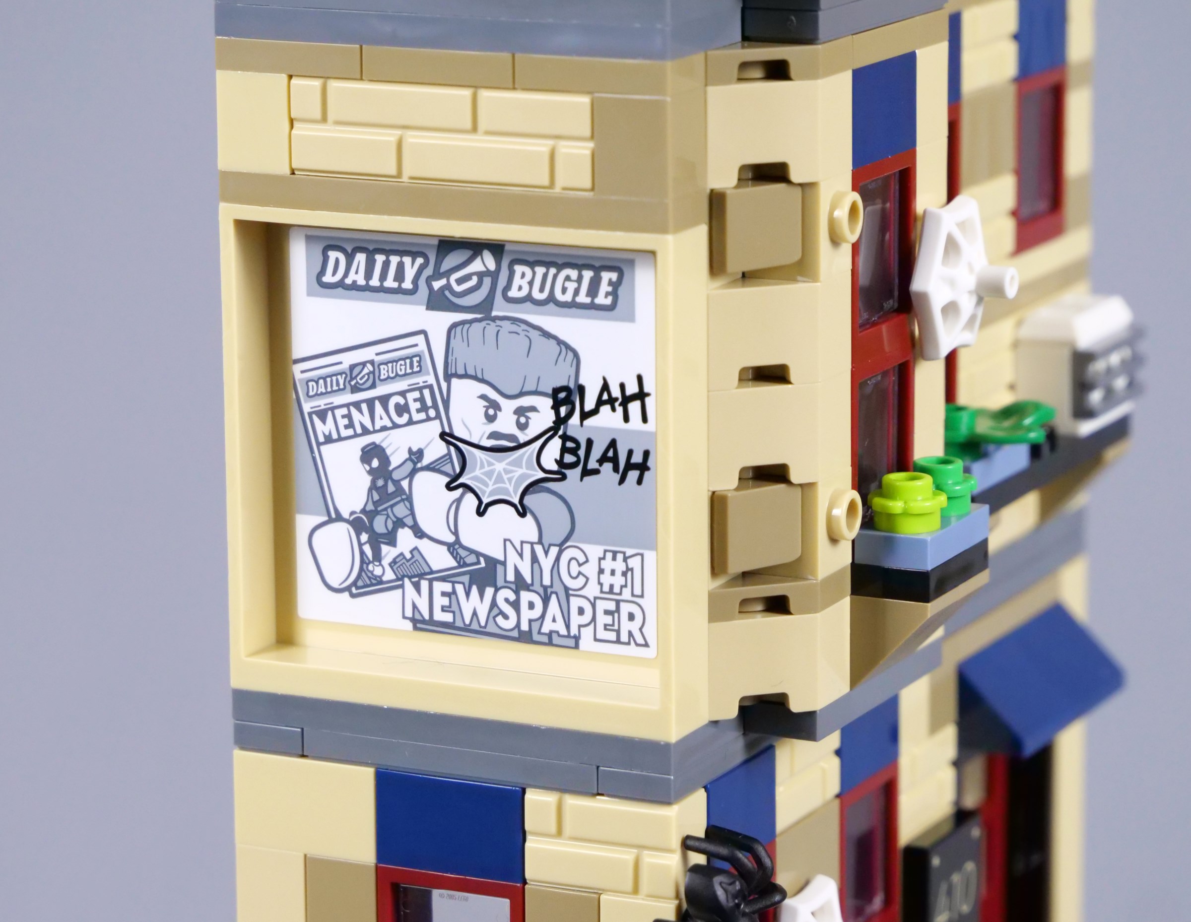 MJ carries a printed pizza box, while Spider-Man is equipped with a pack of web accessories. Some of these accessories are attached to the building in the instruction manual, but you can use them however you choose.
