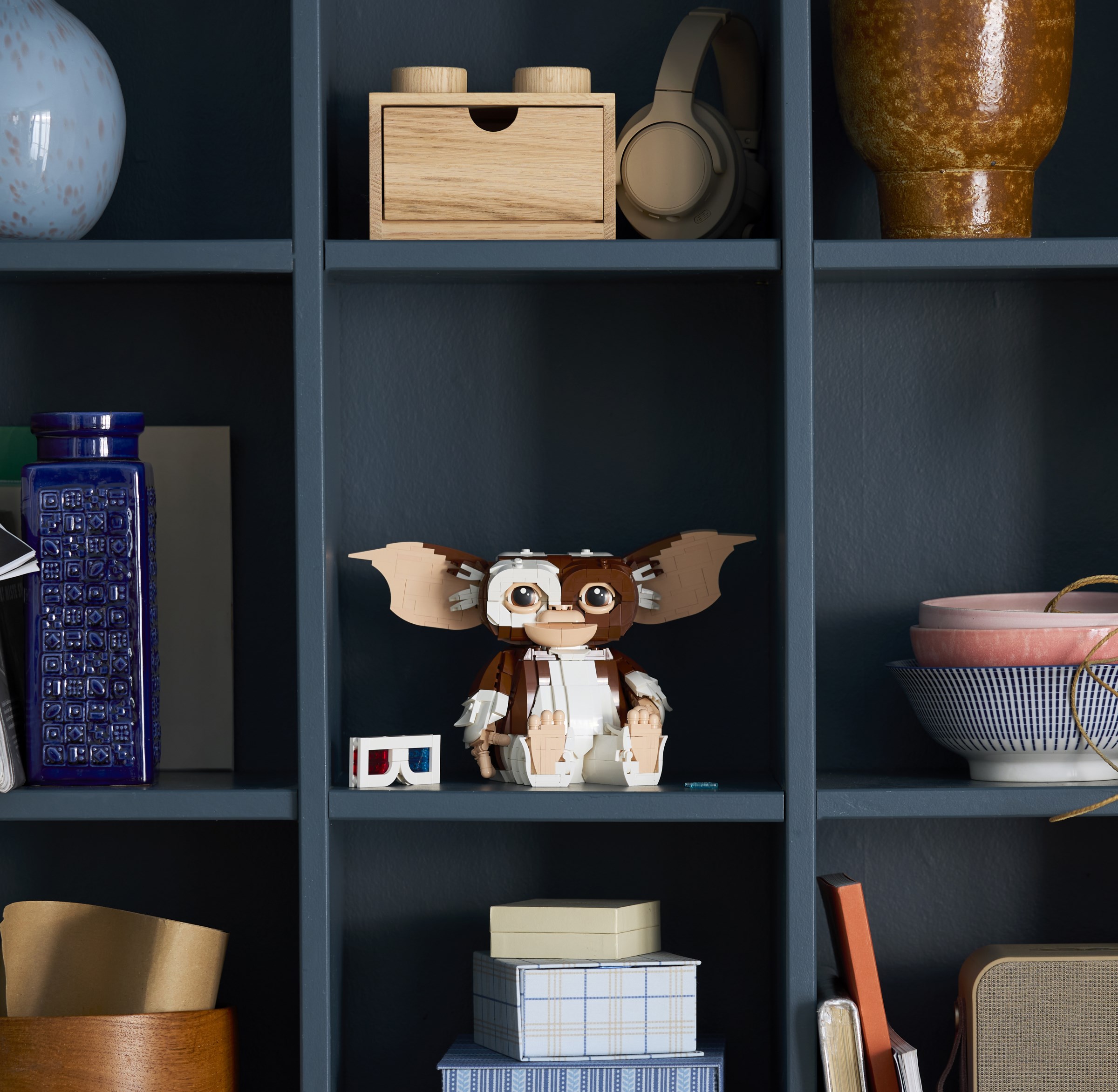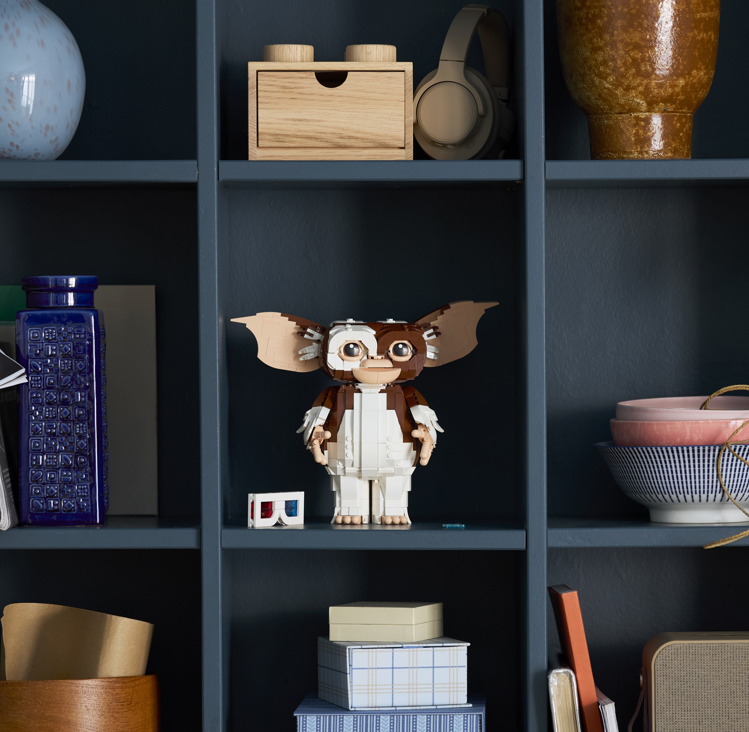 Assemble the Gizmo figure so he is either standing up or sitting down. Rotate his head and adjust his ears, arms, hands, fingers and feet to create different looks. The set also includes iconic accessories to make your display even more irresistible: a water splash element, alluding to how water makes Mogwais replicate, which attaches to Gizmo’s back, plus brick-built 3D glasses like the ones Gizmo used to read comic books.
