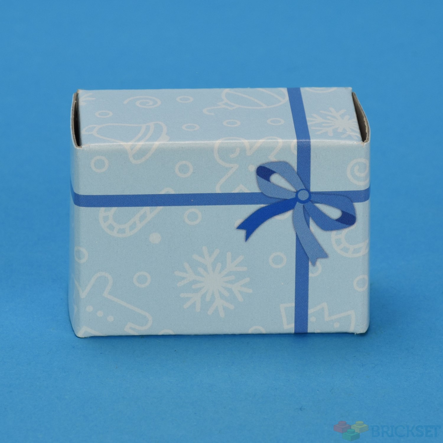 Inside the box is a small cardboard gift box that has been printed as if it is wrapped in decorative paper and held together with a blue ribbon.