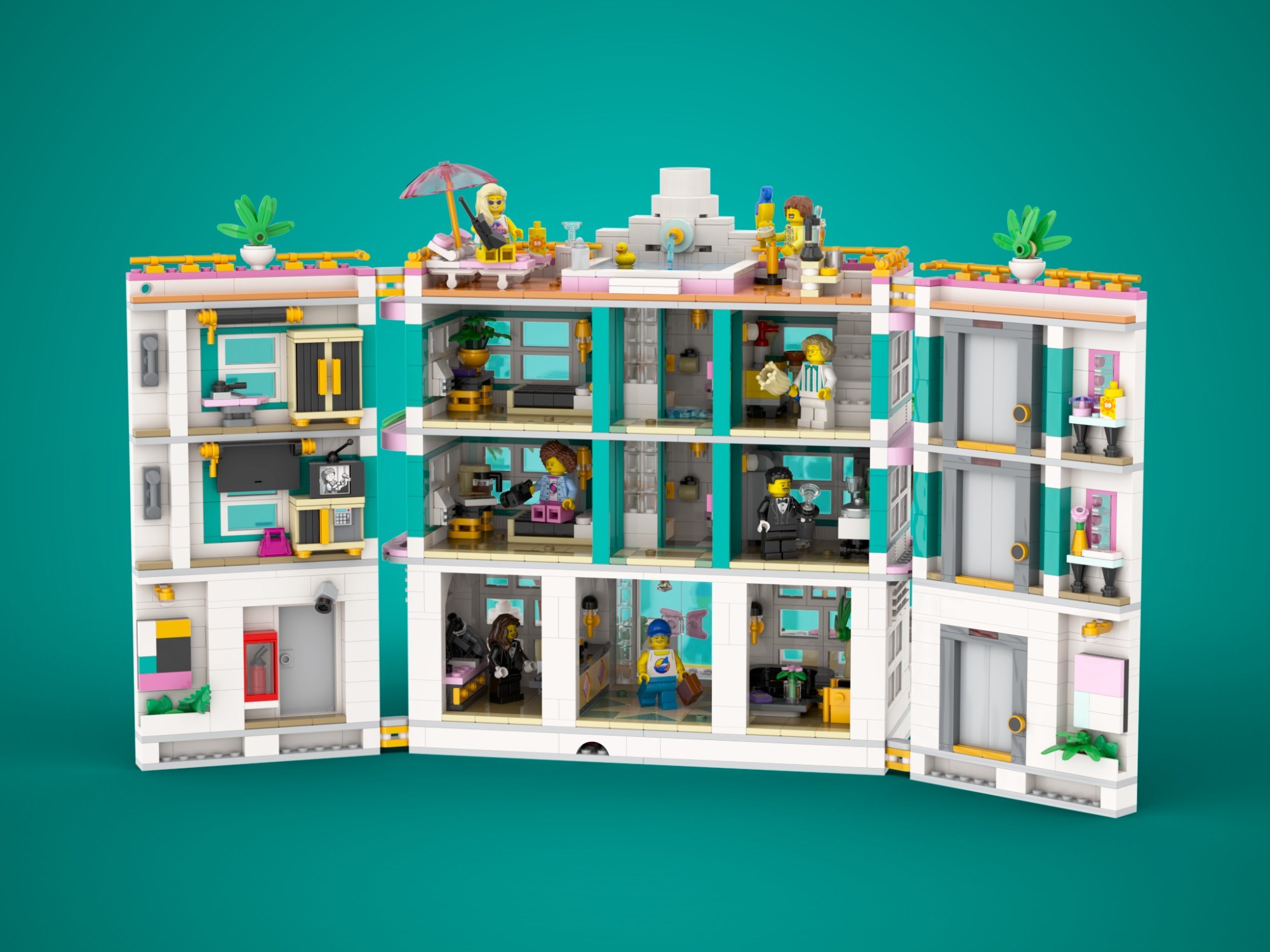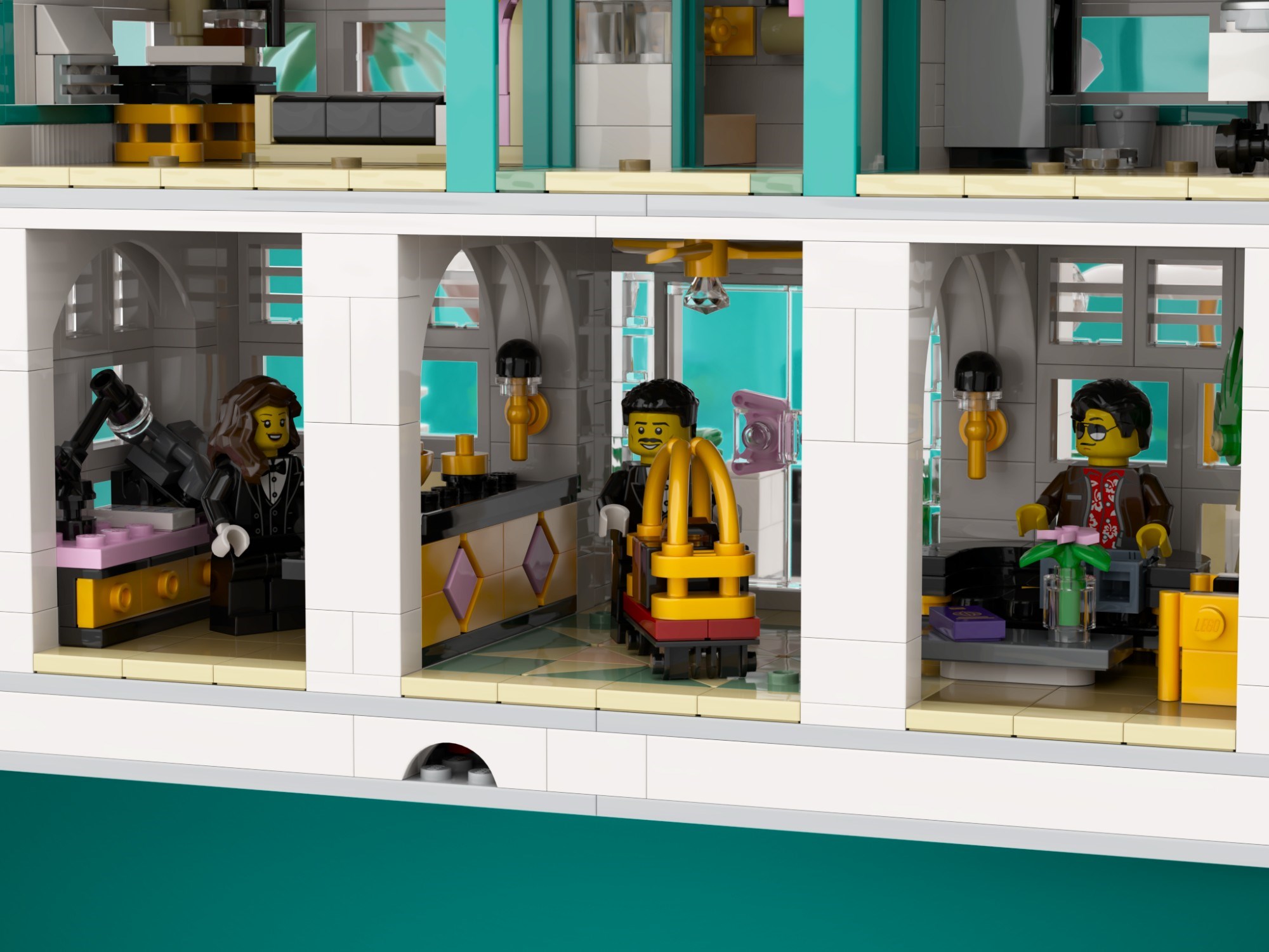 The building is detailed on all sides and opens at the back in a doll house style for easy access to the interior. The model (consisting of slightly over 2500 pieces) measures 32 studs wide and 30 studs deep, including the pink canopies. This size makes it easy to place on a baseplate and integrate into a LEGO city.