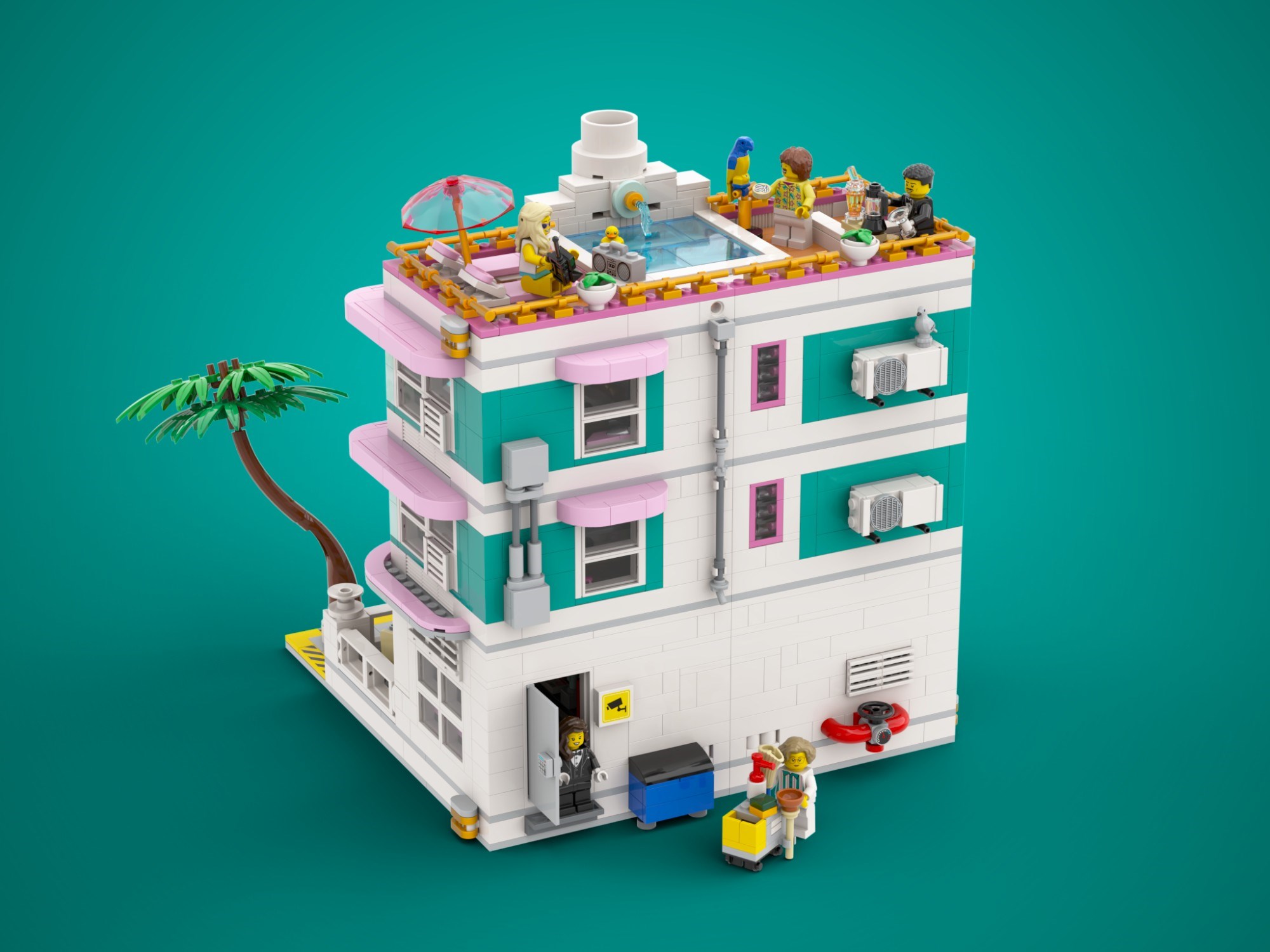 For my new entry for Series 9 of the Bricklink Designer Program, I wanted to try something that blends the vibes of Miami, the retro flair of the 1980s and the classic LEGO theme Paradisa. The result is The Sunset Hotel.