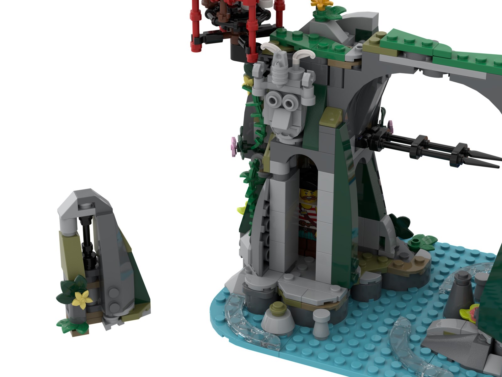 The third island is where most of the Bricktonium that has trapped the Islander crew can be found. The first stop is the drummer’s station. Moving further up there is a secret compartment for the largest crystals next to the highest point, the lookout, with a domed roof made primarily from part 2682 in both Lime and Green. For the roof elements I wanted to include the same parts that are used in the trees that are scattered around the islands.
