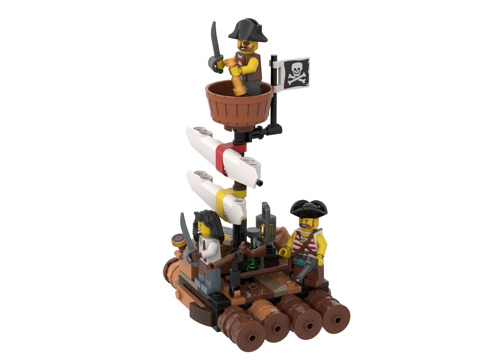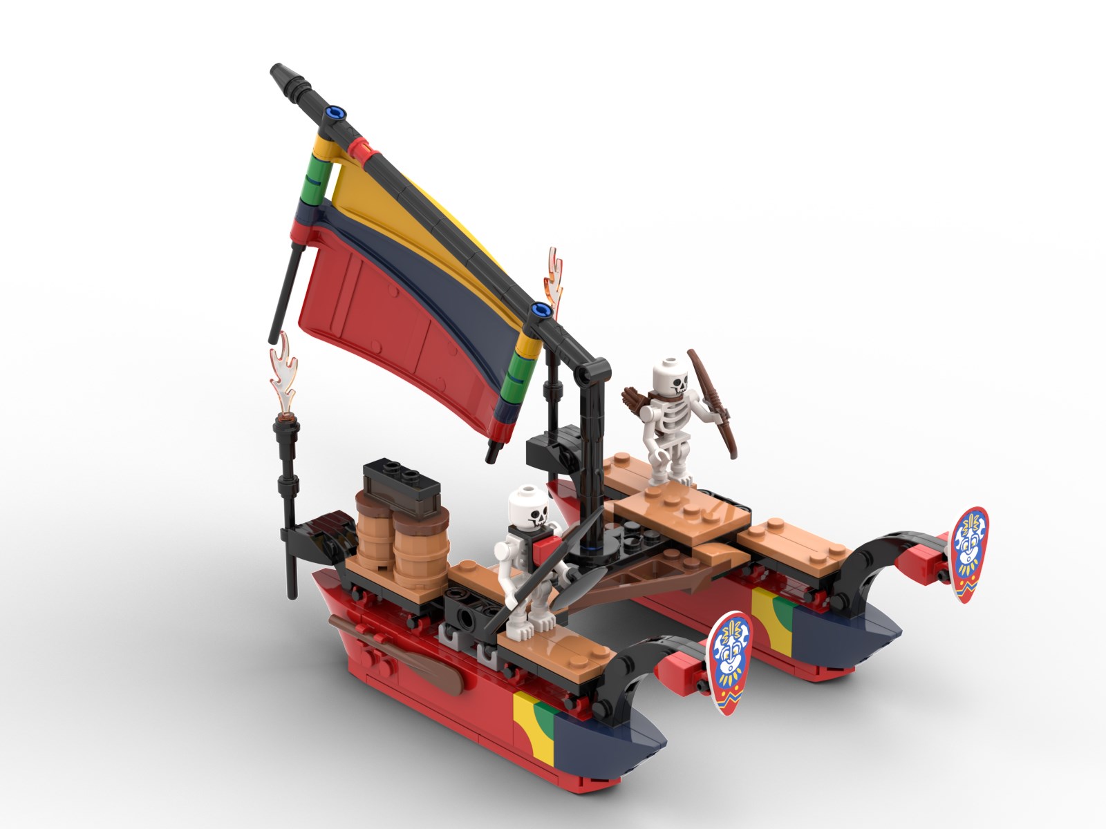 A foil for the catamaran is a brick-built raft crewed by pirates and inspired by various raft designs for the early Pirate theme.