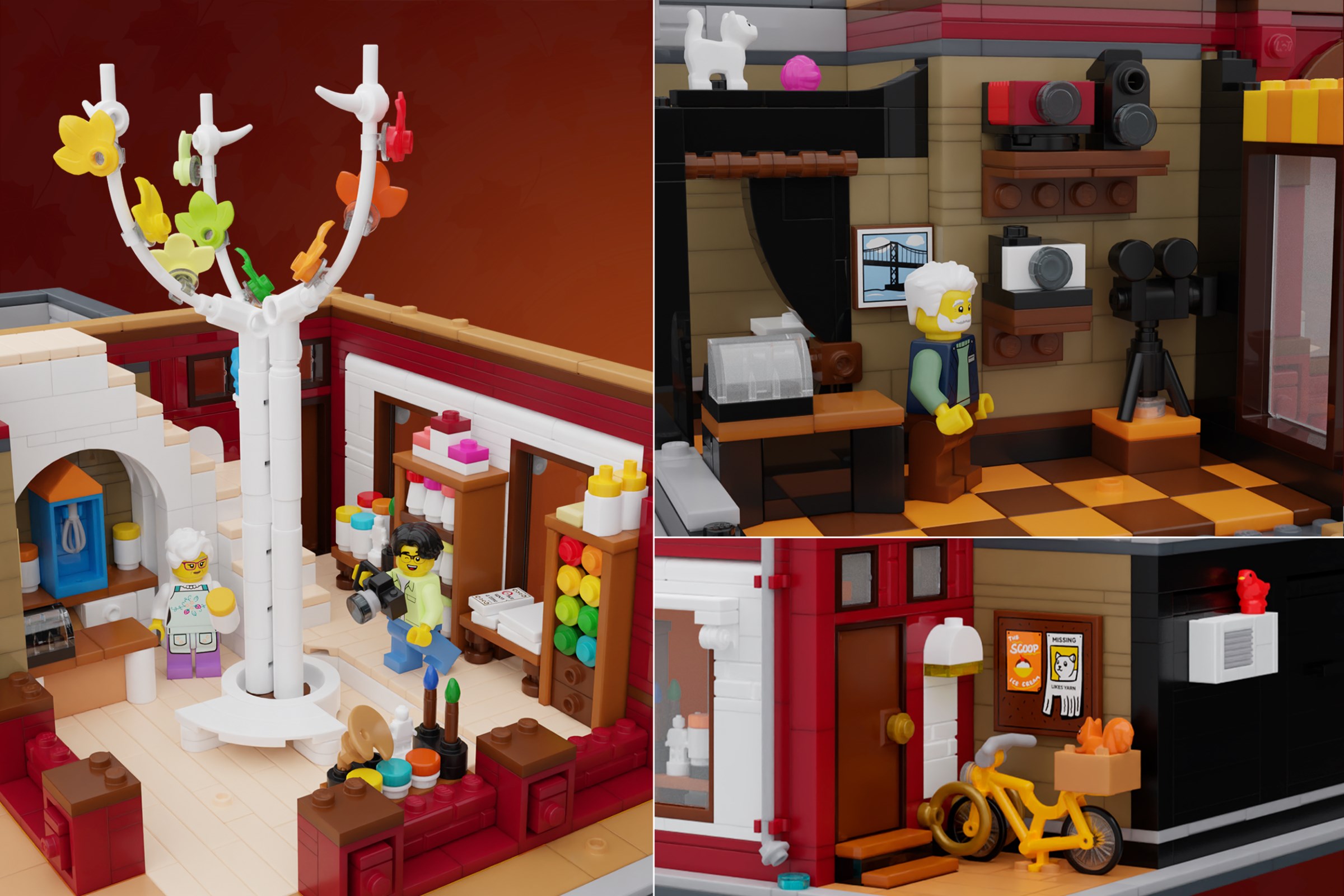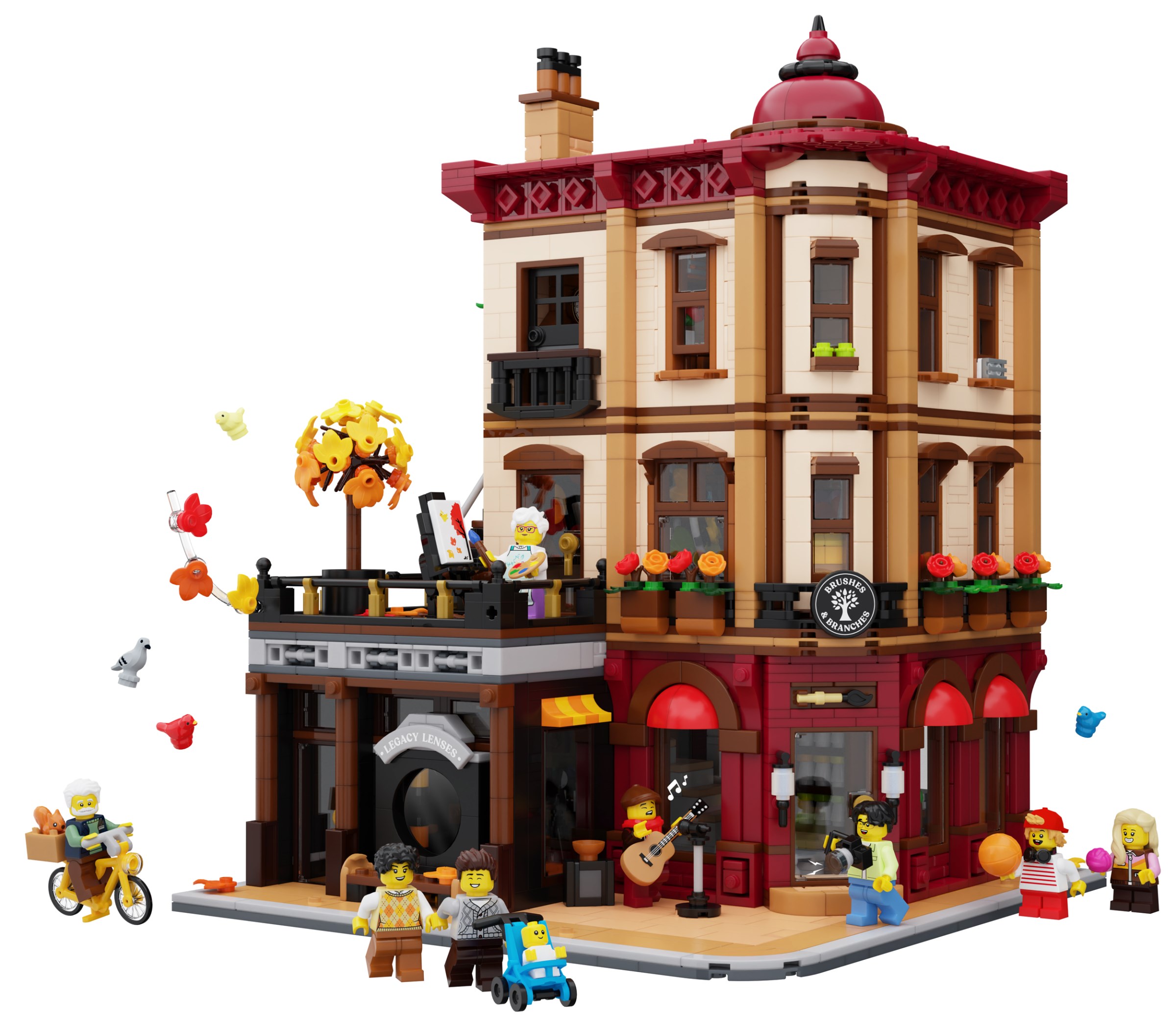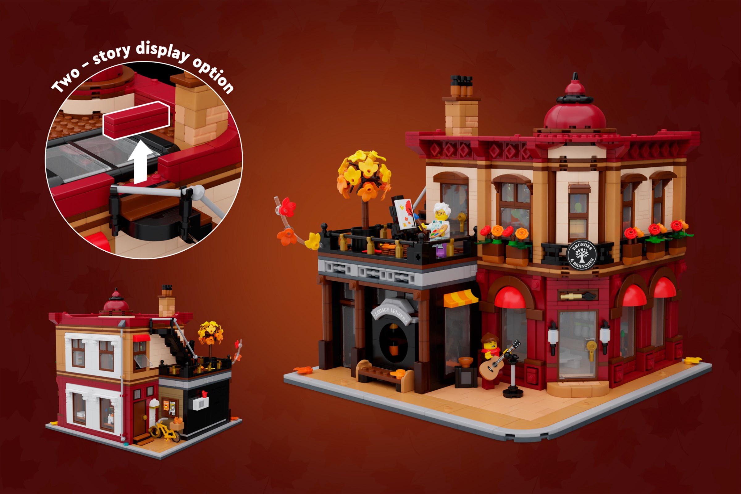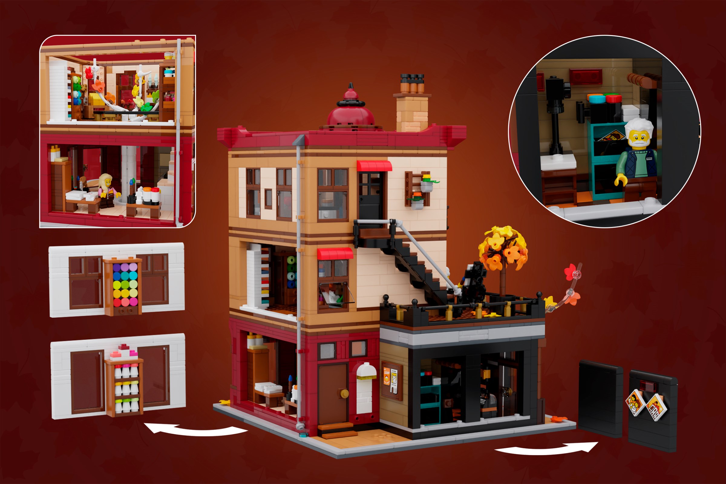 This warm and cozy city building depicts an autumn scene and two shops that celebrate two of my favorite creative hobbies - art and photography. The model includes 9 minifigures and is just shy of 3100 pieces. The footprint is 32x32 studs, so it fits in any traditional LEGO city. Besides having removable floors, all four sides are detailed and have removable wall panels for full access inside to see all of the detail.