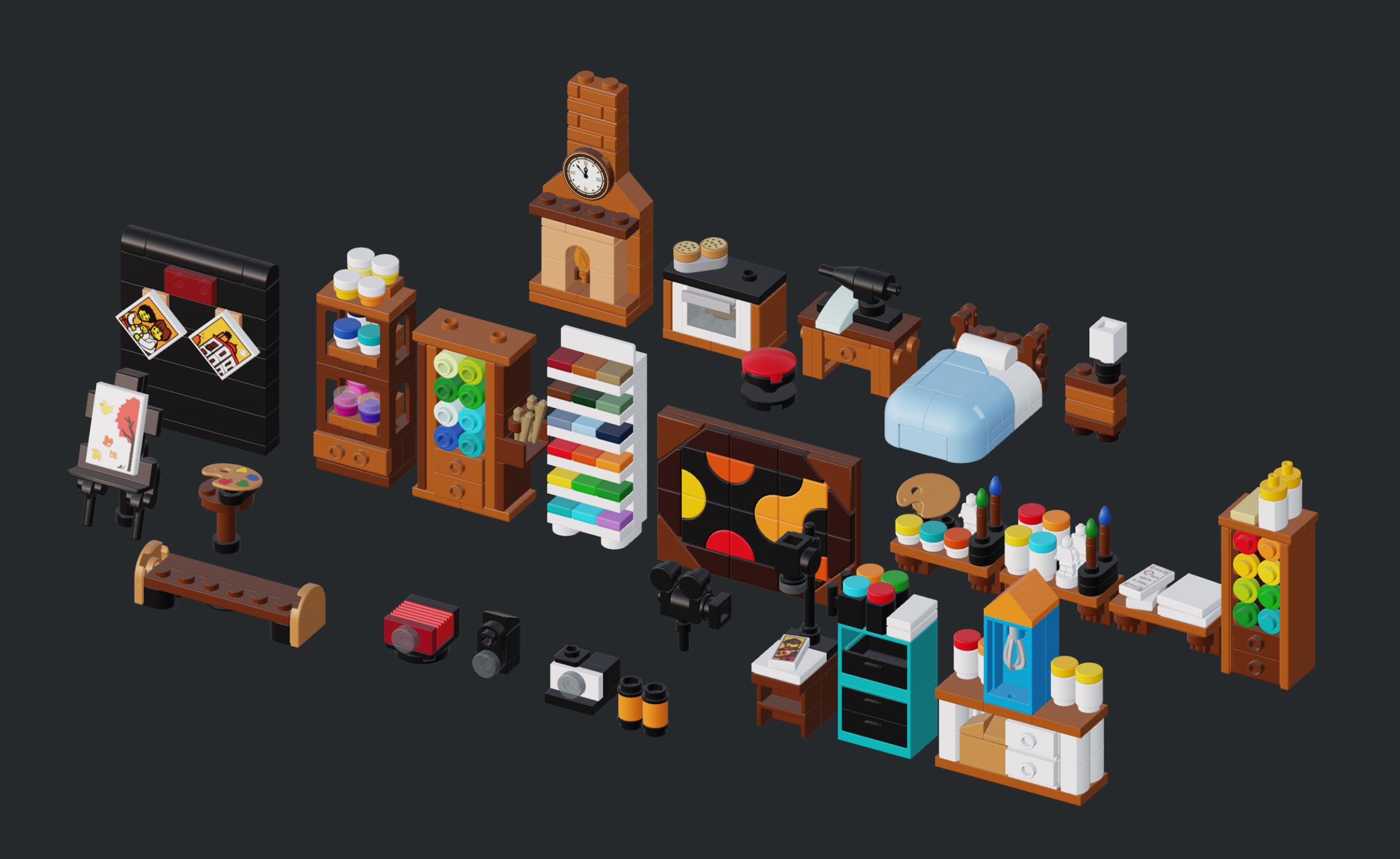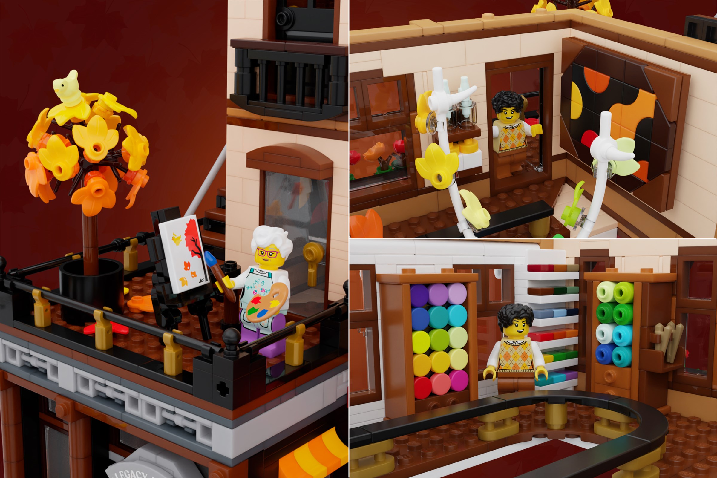 Wow! I overlooked this one while first browsing the entries for this period, but you've absolutely sold me on it. The design of the building is amazing (easily on par with "official" modulars), and the graphic design is top-notch. I love the use of color, both for the rainbow paints and leaves on the store display as well as the use of vivid autumn colors throughout for some of the other artworks. And as a former photography and art student myself, the subject matter definitely speaks to me on a deep level!
