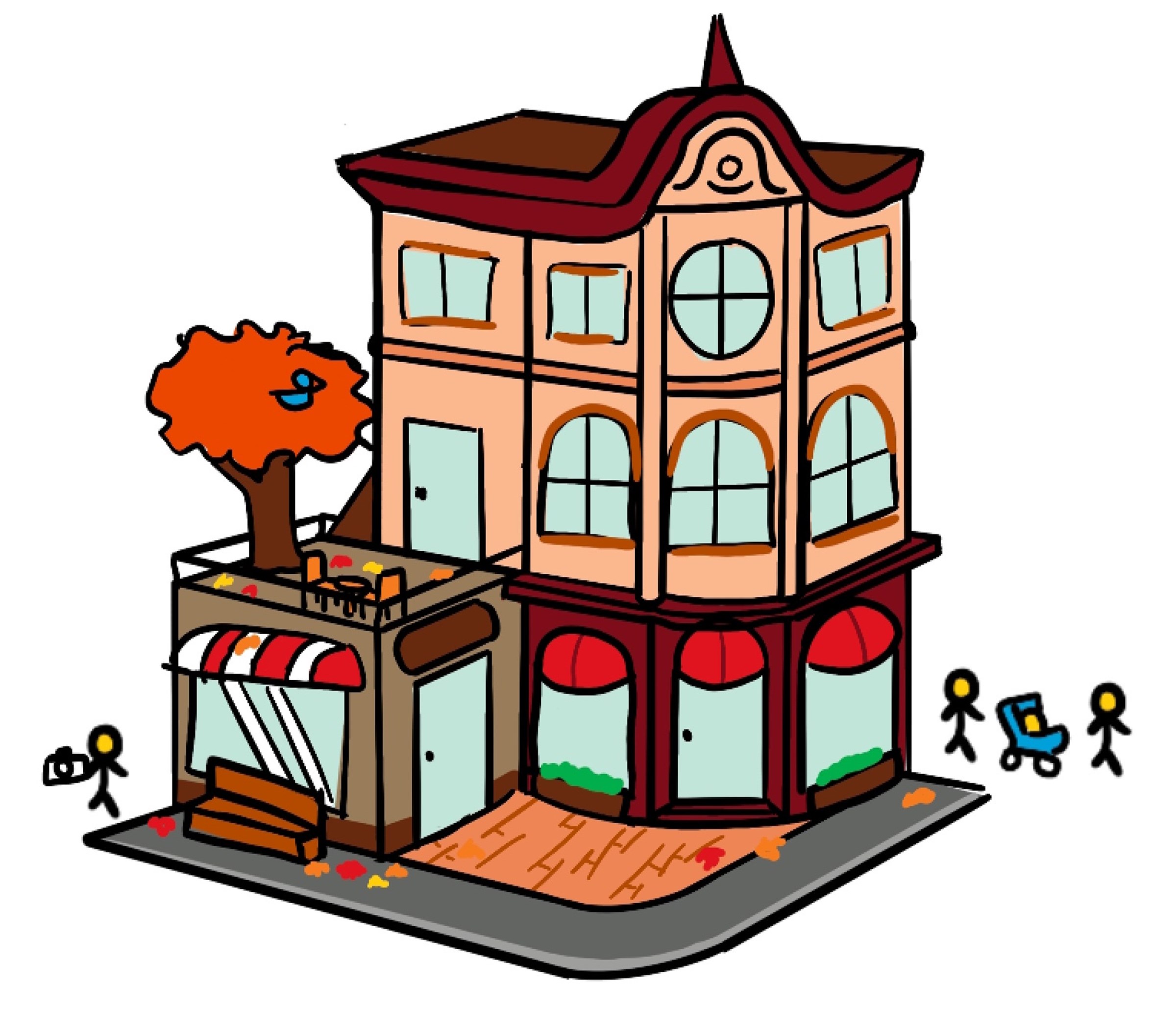 In this world, the camera shop Legacy Lenses specializes in vintage cameras. I enjoyed coming up with different builds for medium format, motion picture, and Polaroid cameras. There are photos of the included family and street performer being developed in trays alongside an enlarger. Outside, the camera window is a popular photo-op for people to sit beneath with the circle window framing them and the sign hanging above. It felt more fun than traditional windows. This shop is an homage to my time in film photography class in college, which I loved and have continued as a hobby since. Though I’m young and enjoy my phone, I miss my days in the darkroom.