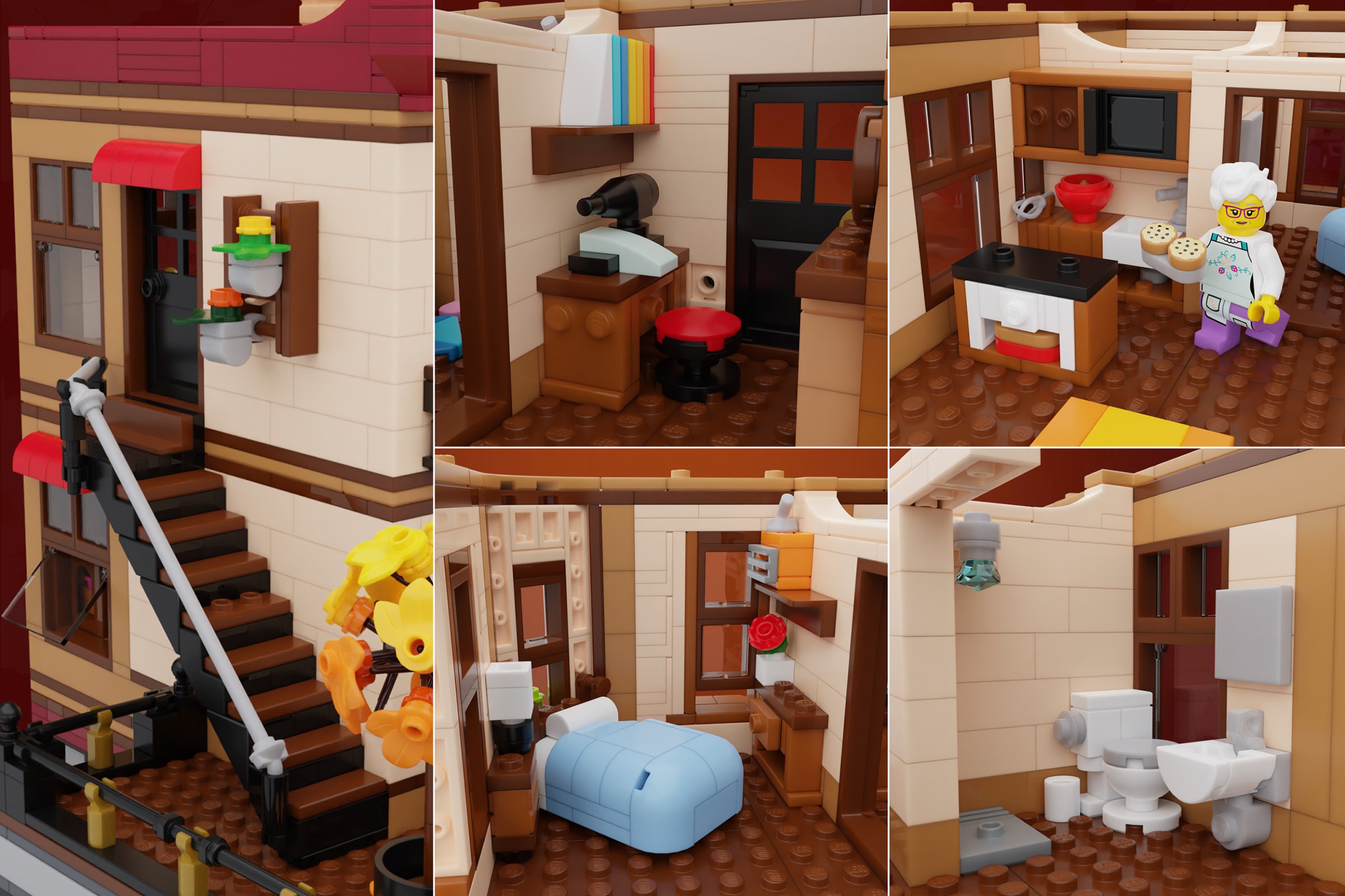 The apartment has some of my favorite builds in the model. There are several mini-builds built entirely on their side, connected to the wall by headlight bricks on one side while other builds are connected using the back. I feel the BrickLink models should be a celebration of cool techniques and tried to put everything together in interesting ways. More details did push me closer to 3,000 pieces, though!