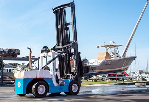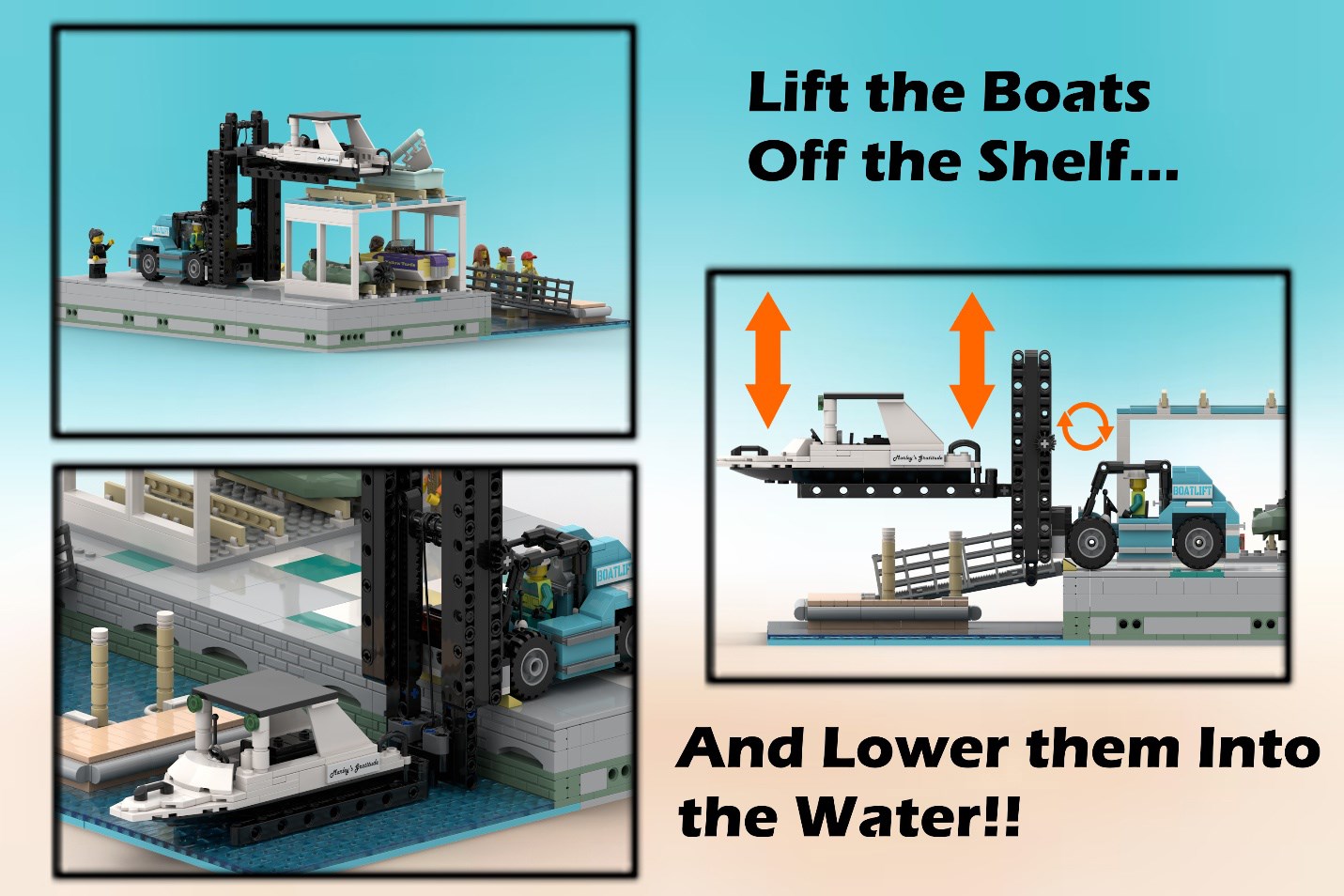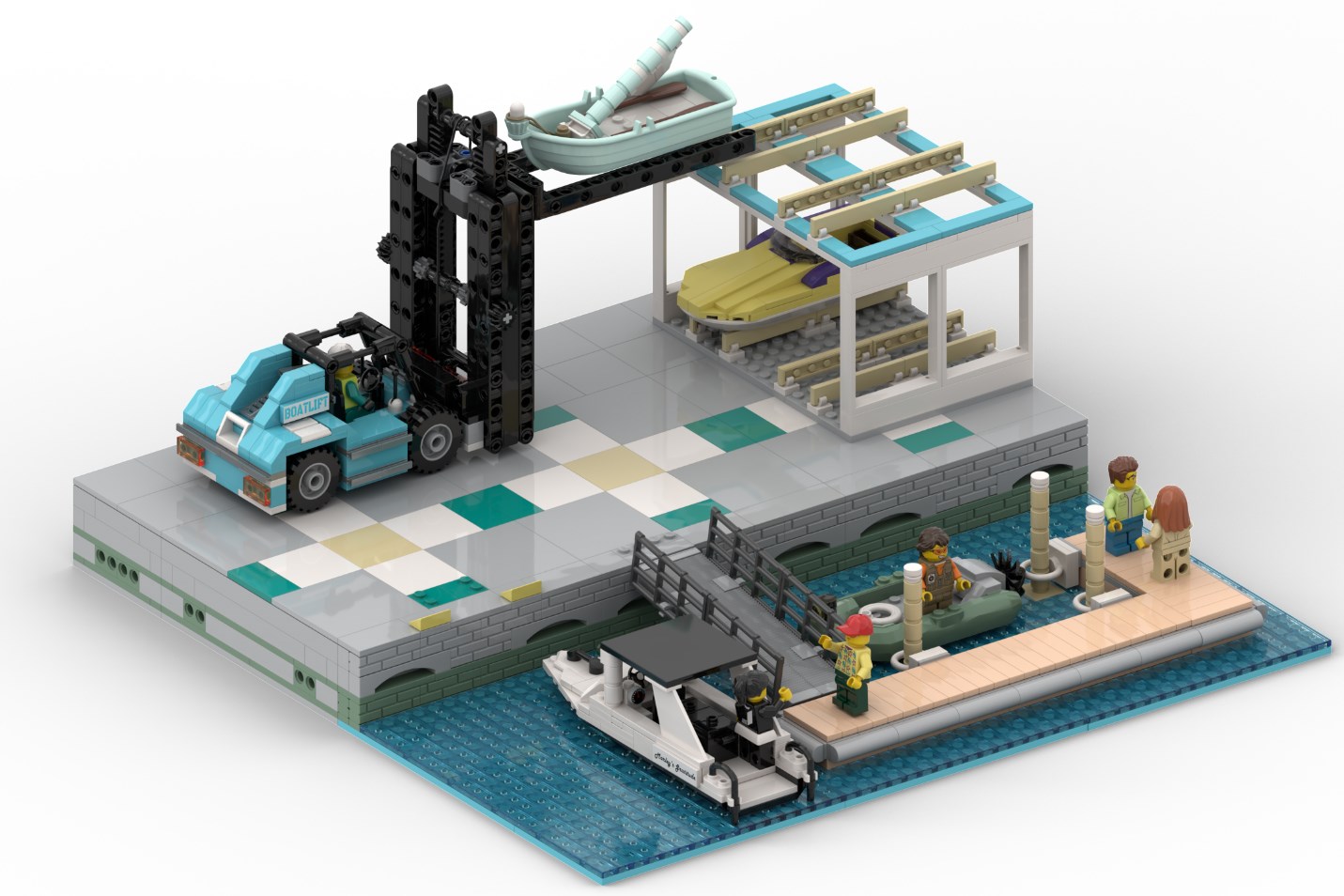The central feature of the build is the forklift that has a working boom. It is able to lift boats off of the shelf, and place them into the water. This “double arm” technique was the most challenging part of the build to engineer, but the end result is excellent! The boom is now able to move below ground level, and above the forklift itself!