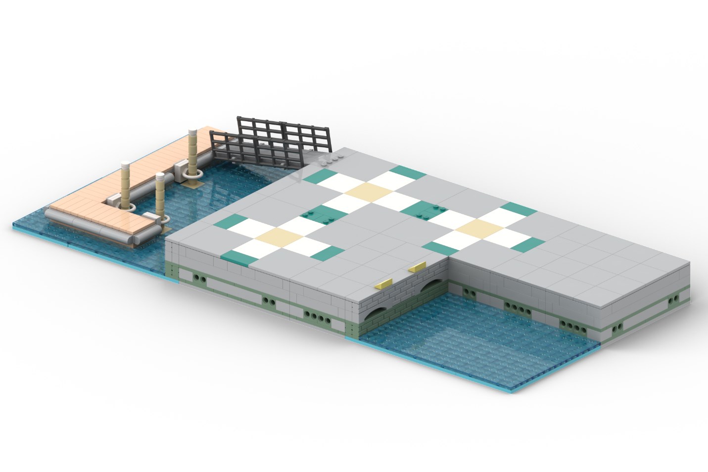 In order to give the forklift enough room to manoeuvre around, I built a dock raised above the water. Eventually, I had the idea to make the platforms modular. This allows for dozens of different combinations! (and even more if you move a few tiles to reposition the dock platforms).