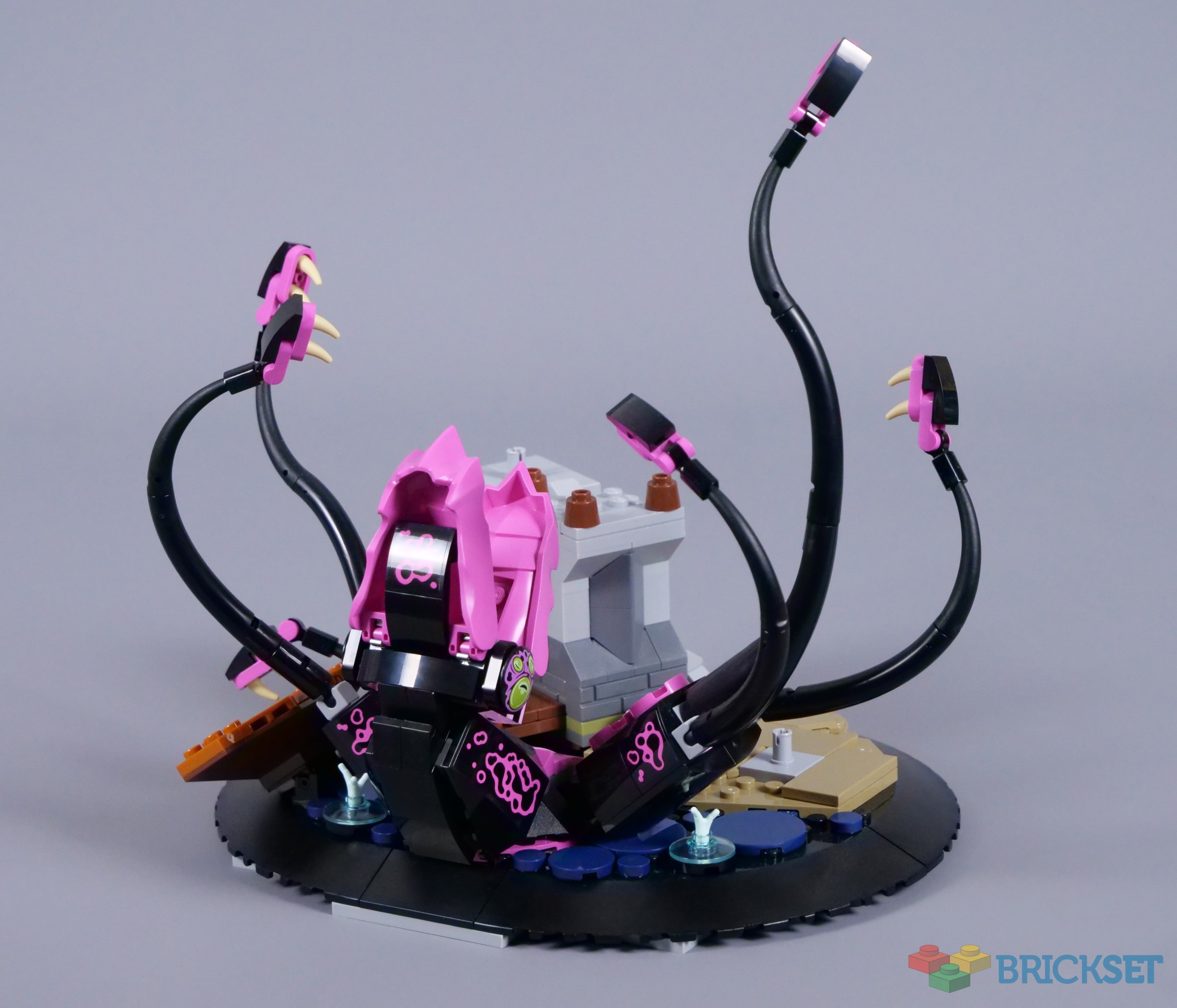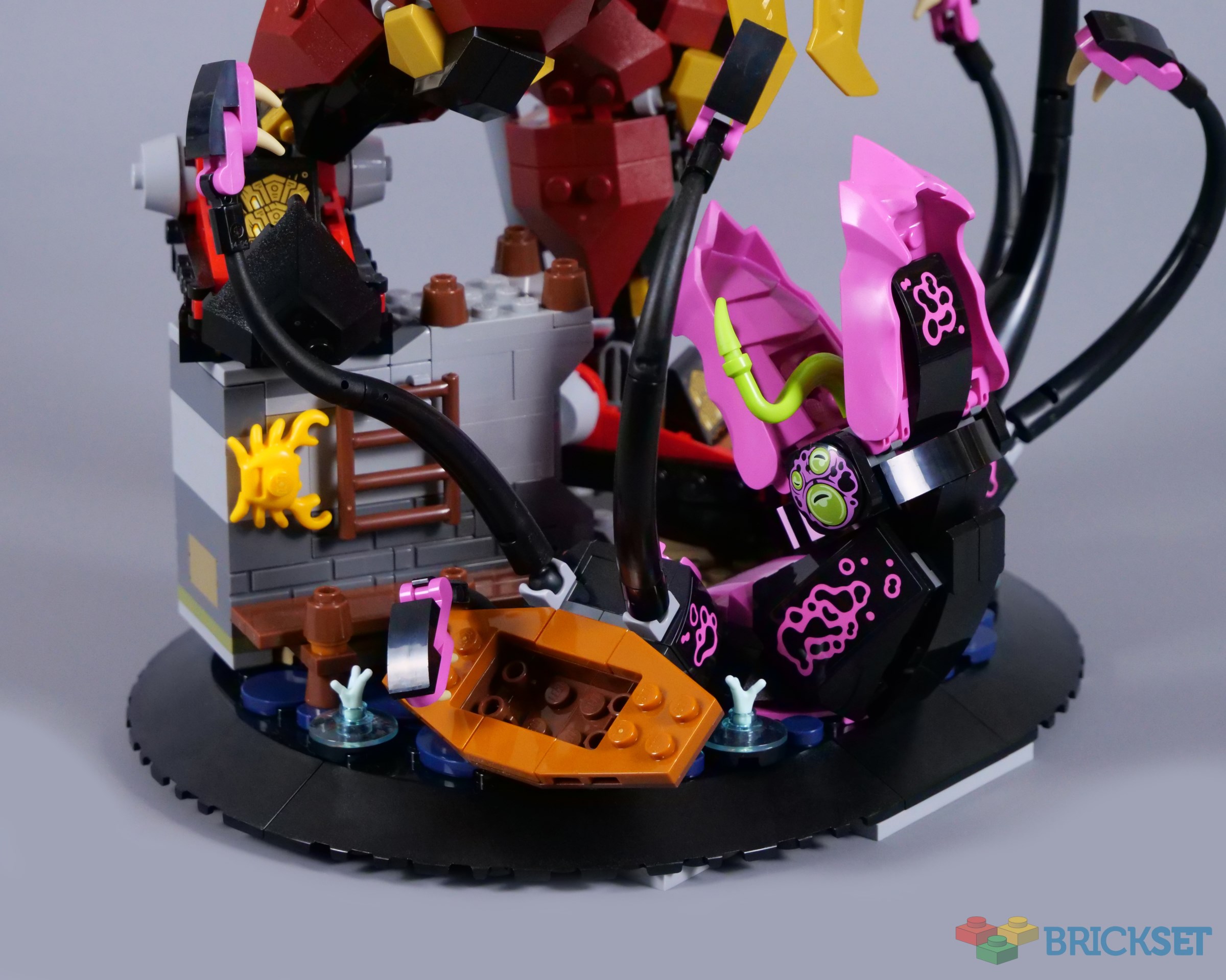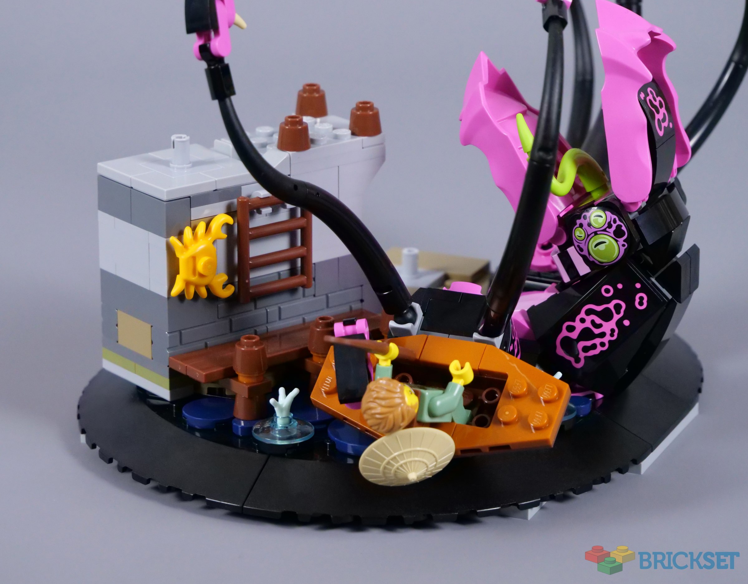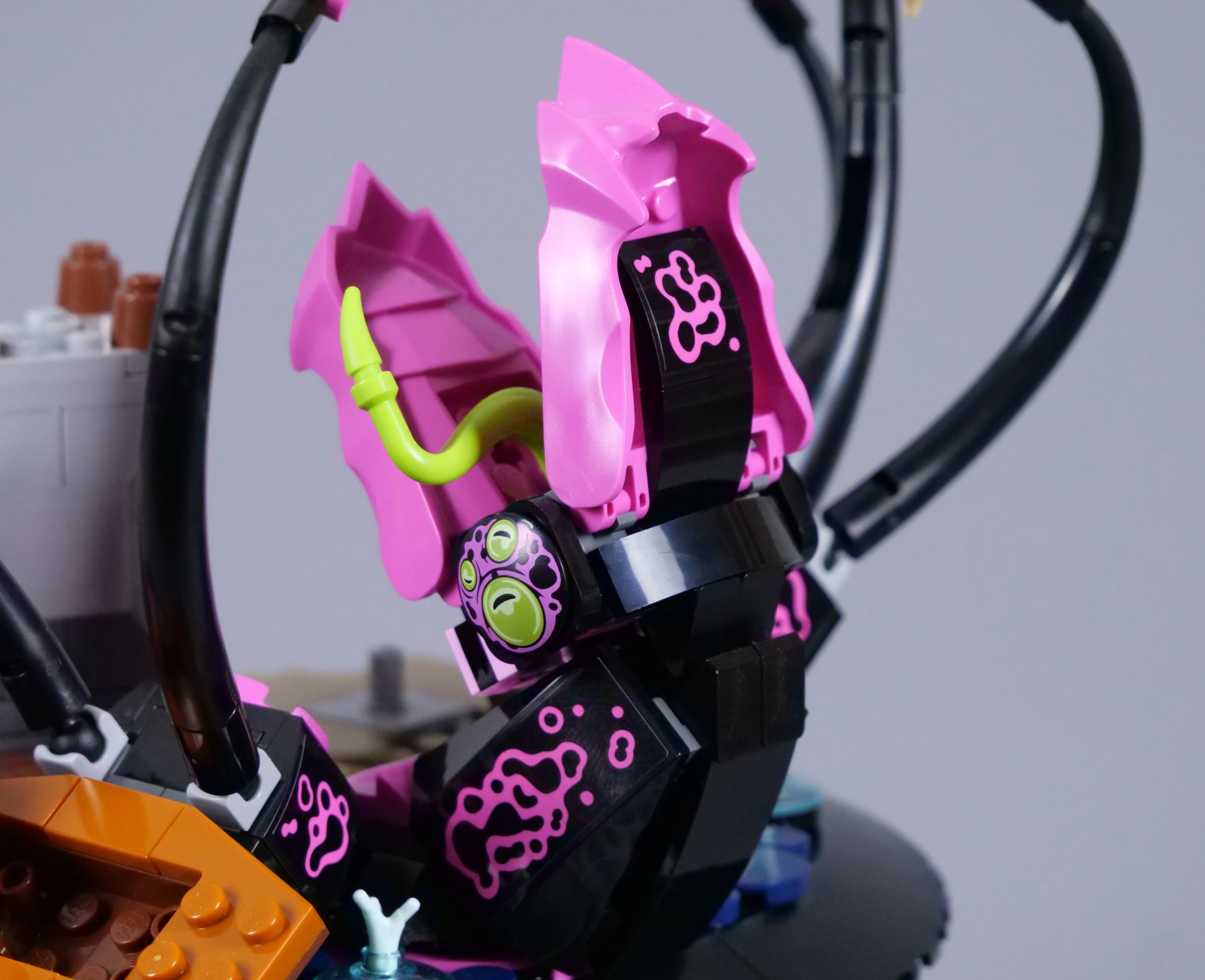 While nowhere near the size of its animated counterpart, the sea beast nevertheless occupies much of the base and is unlike anything else in NINJAGO sets to date. Dark pink dragon head elements are used brilliantly for its jaws and the printed eyes look superb. The stickered details look lovely too, although stickers are never ideal on a set like this.