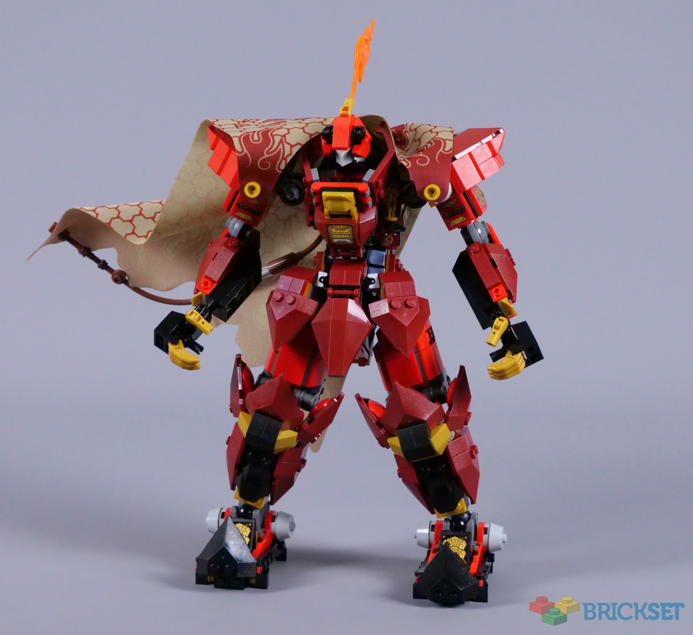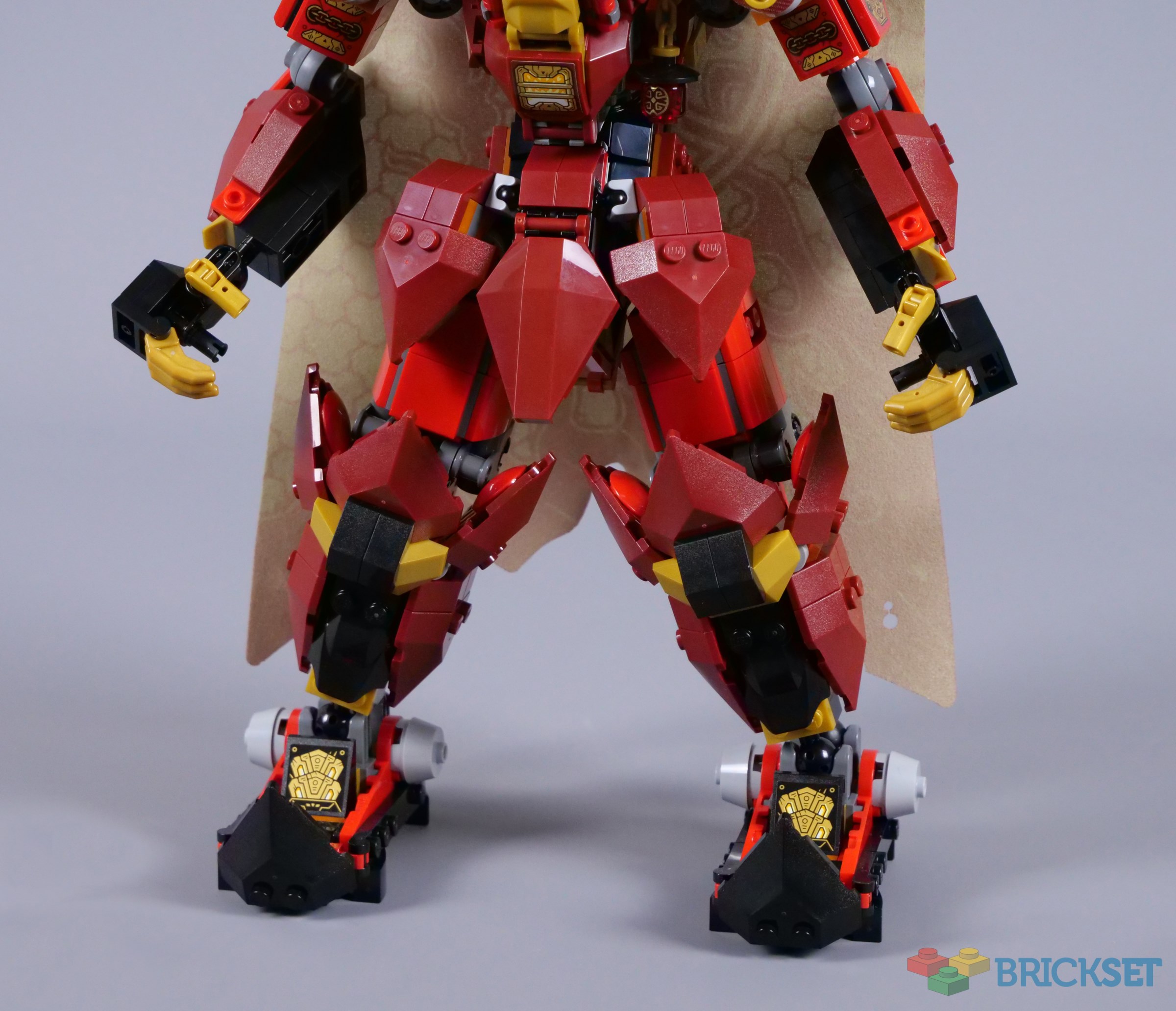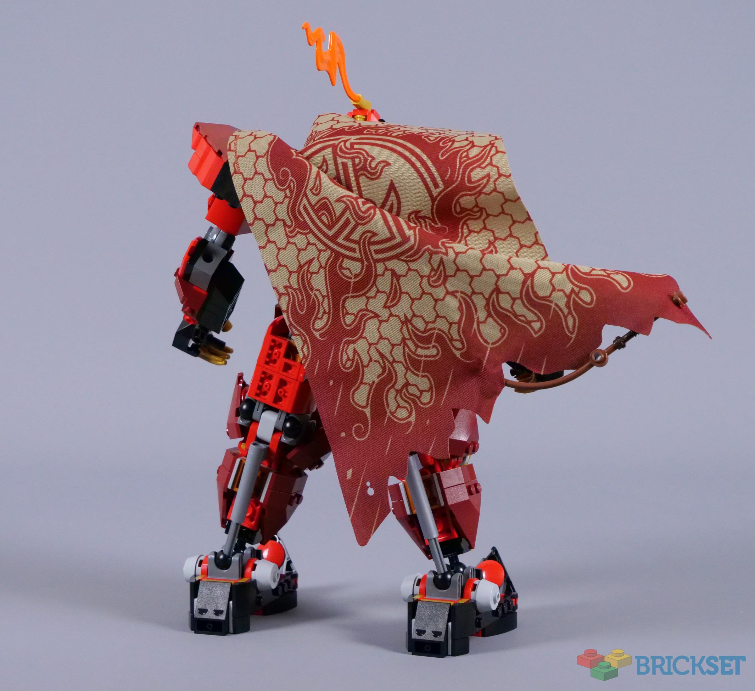 Displaying the mech separately gives a clearer impression of its design. The proportions of the model are pretty similar to 71821 Cole's Titan Dragon Mech and other Titan Mechs, including a narrow waist, with chunky thigh and shoulder armour. This tested combination looks marvellous and perhaps even better than usual, thanks to the cape adding volume behind the torso.
