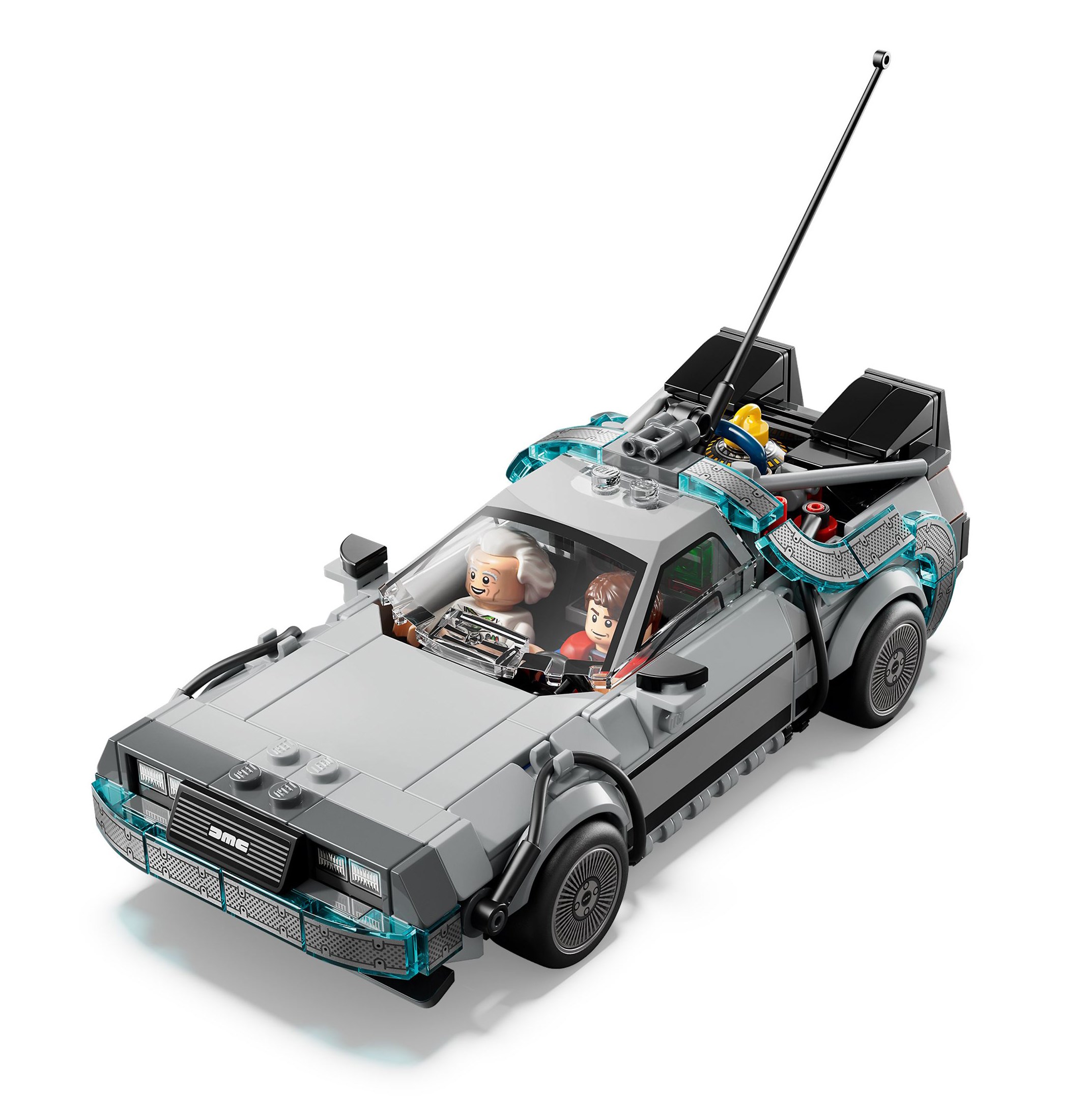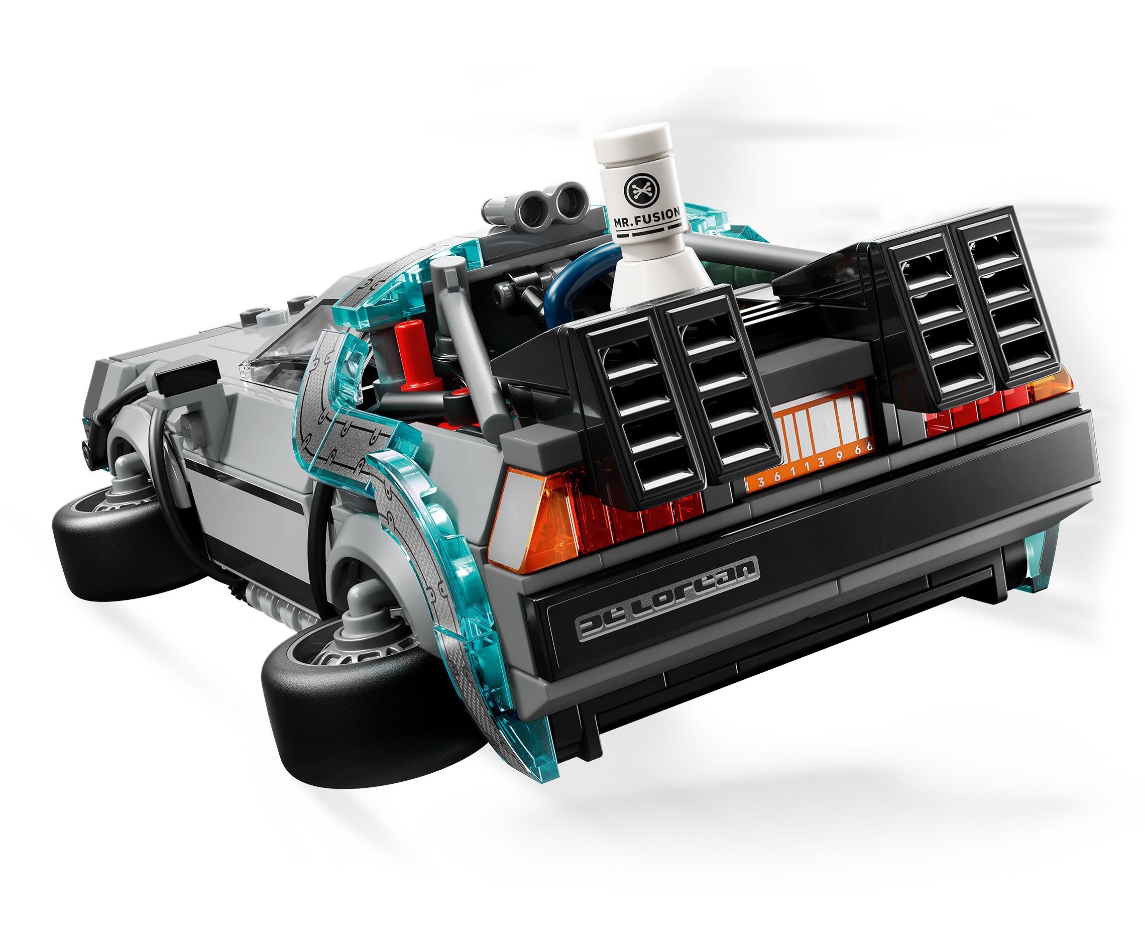 Build this iconic car with a lightning rod and California number plate from the first movie before rebuilding it into its flying version from the second movie with Mr. Fusion, an orange number plate and sideways wheels.