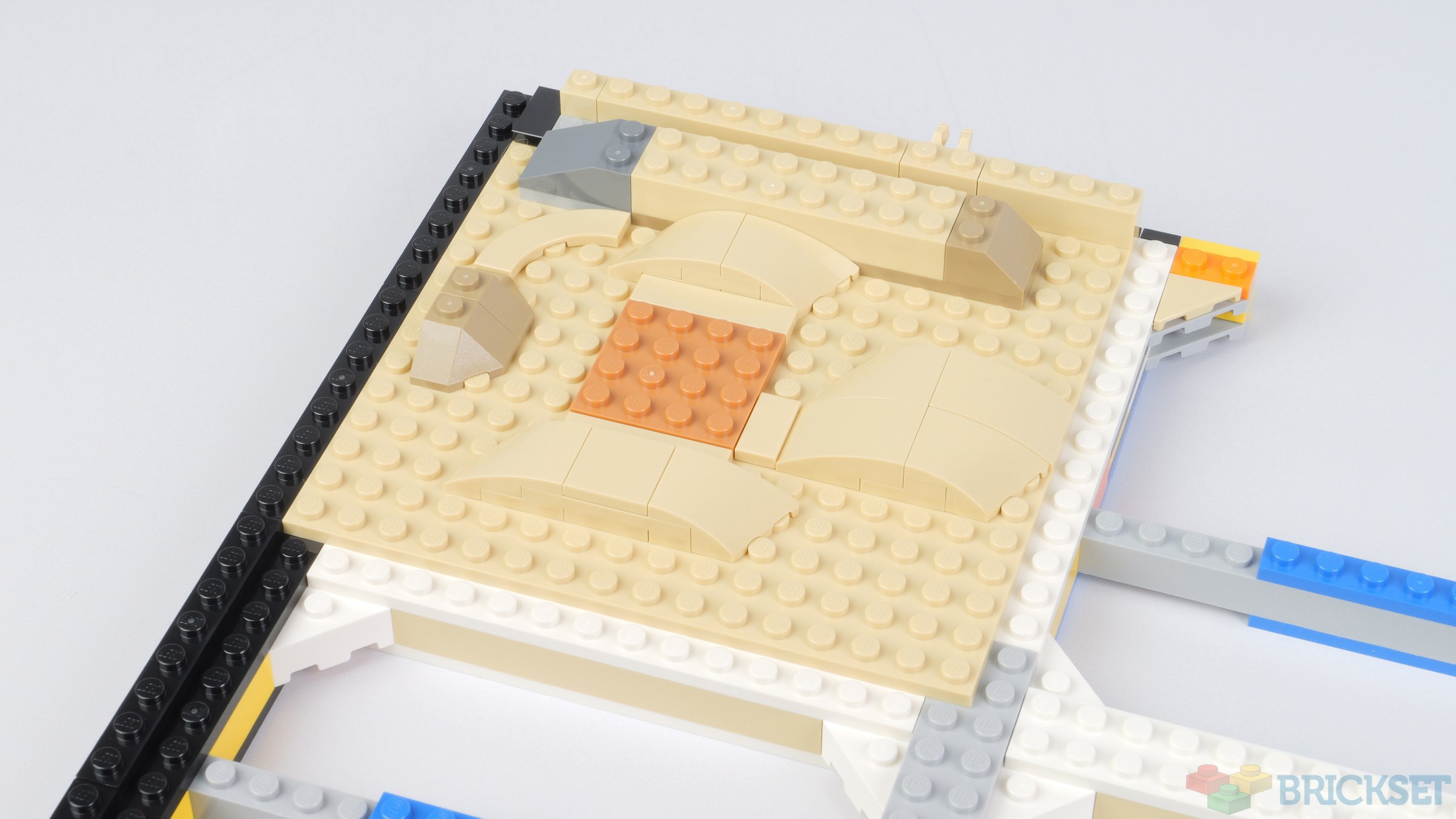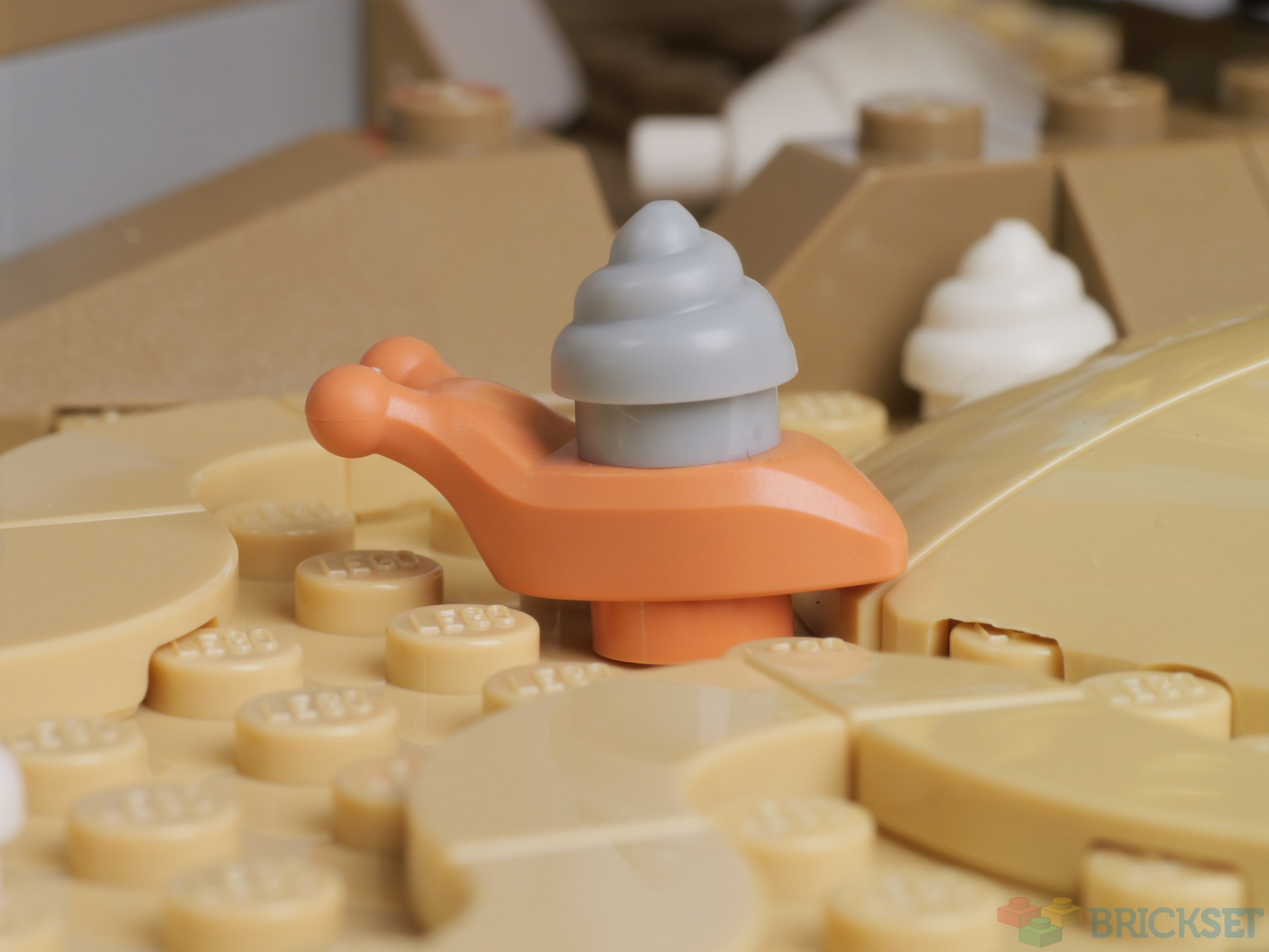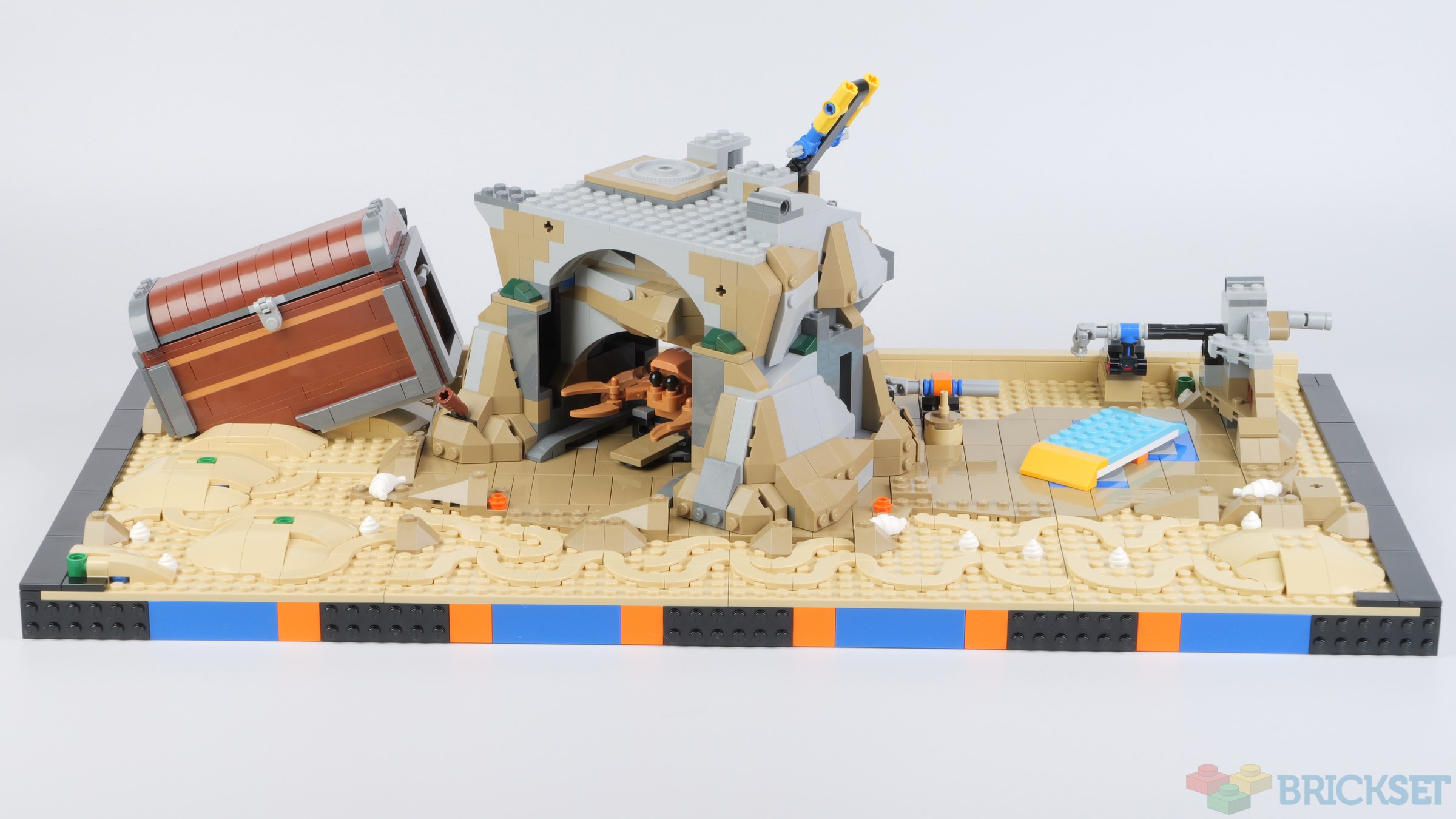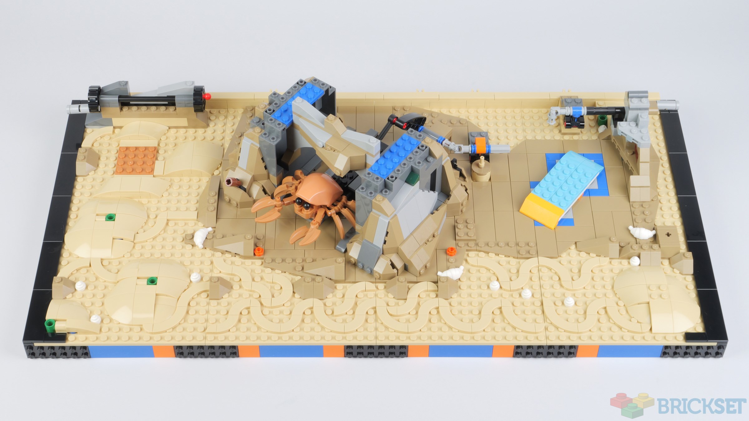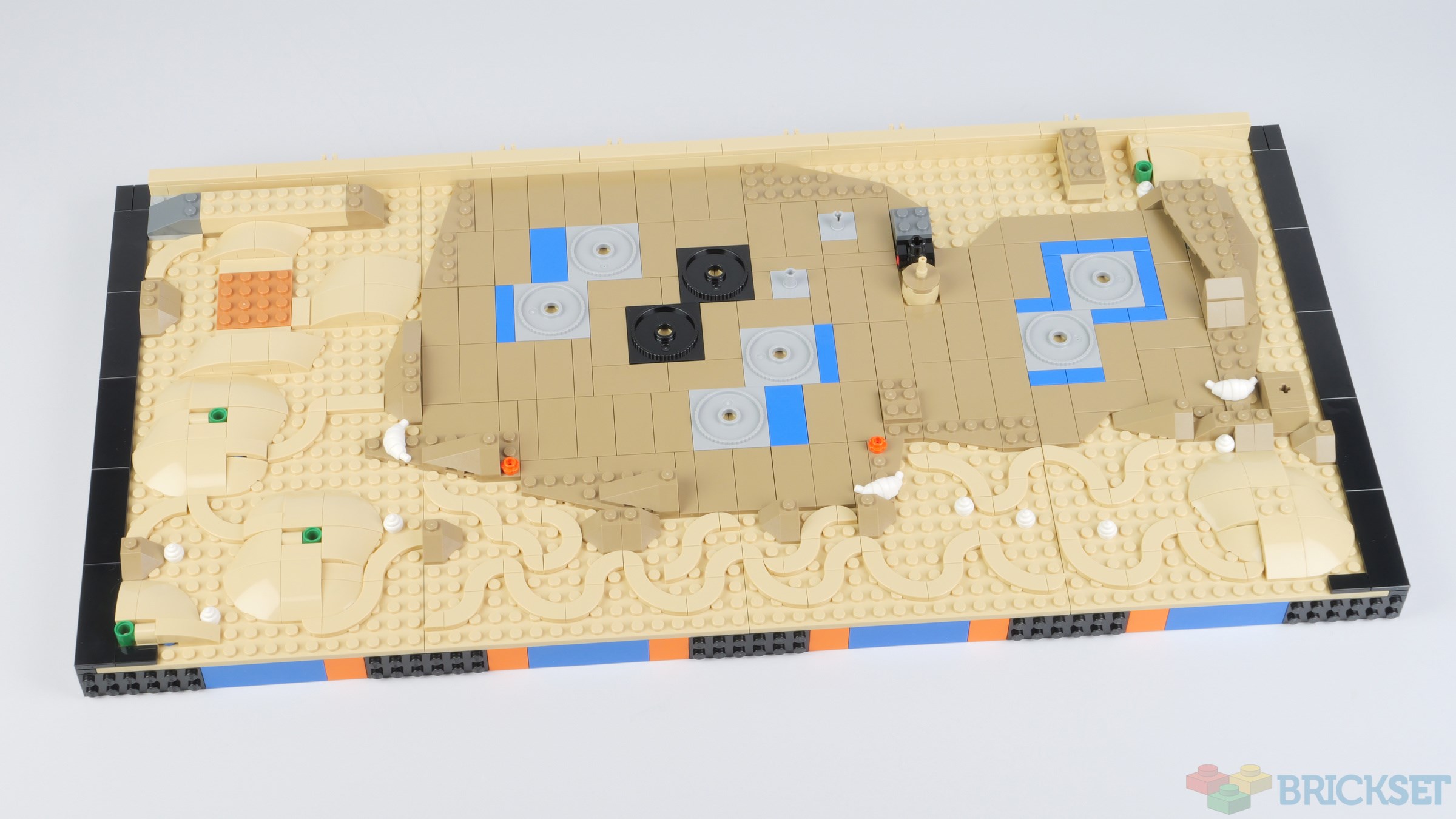 Eight 16x16 tan plates make up the bed of the aquarium, which are covered in mounds of 'sand', swirls in the sand, and turntable bases which are used to attach the cave and other structures at an angle.