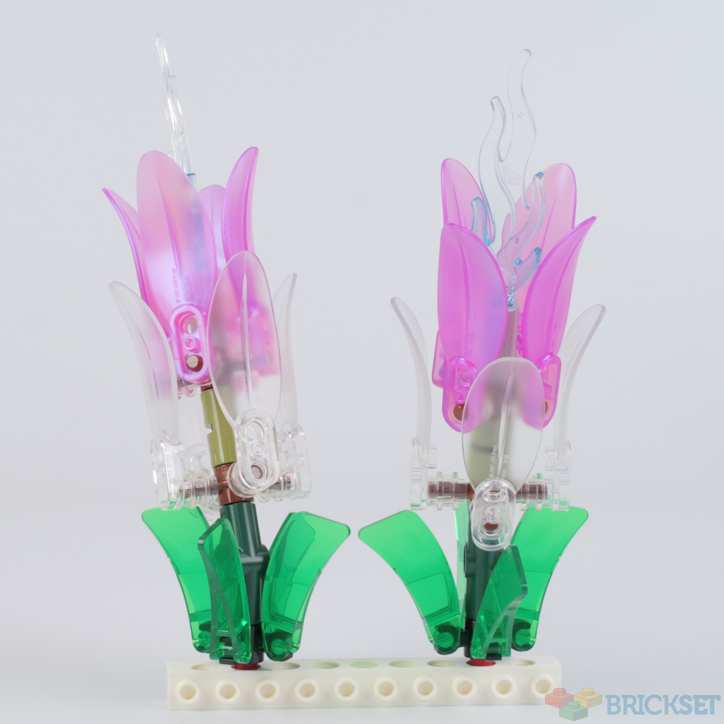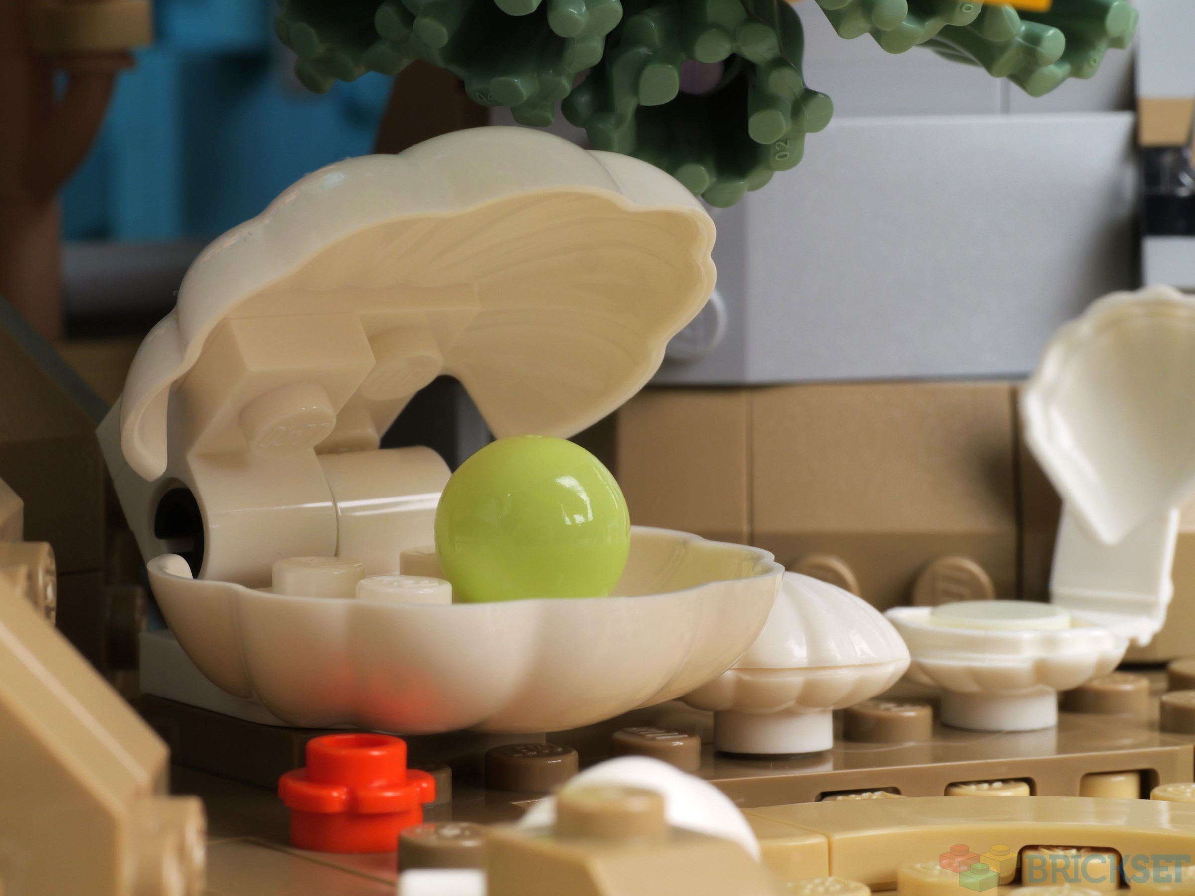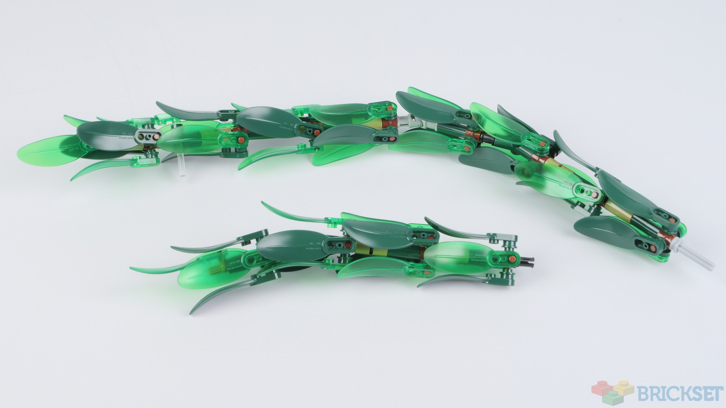Two branches of seaweed are the first to be added, made using dark green and transparent green Leaf 2X6X1s connected to a core of Technic axle connectors.
