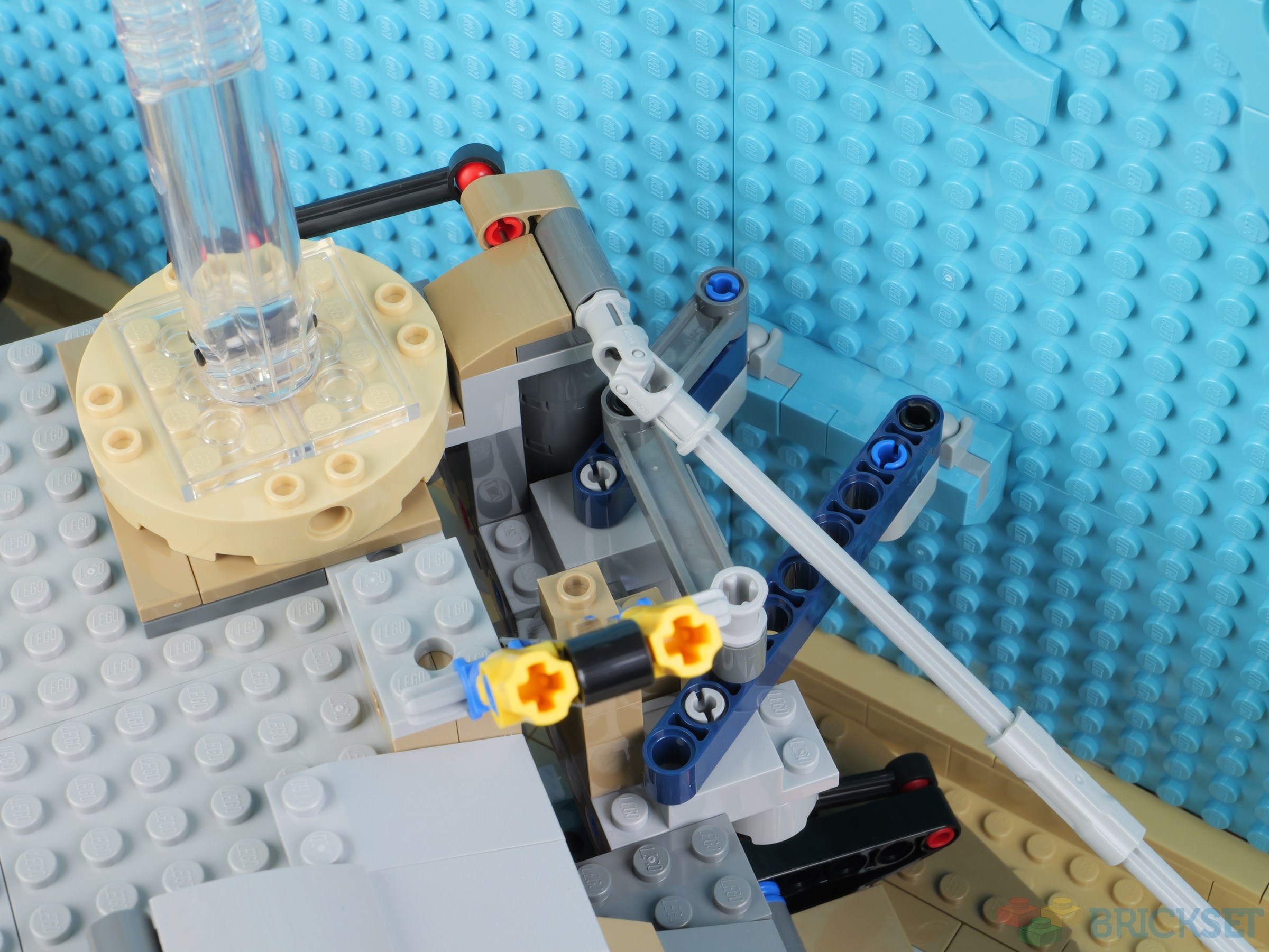 The backdrop is attached to the base using two rows of studs along the bottom, and click-hinges for additional strength. It's also affixed to the back of the cave with Technic beams to doubly sure it's secure.