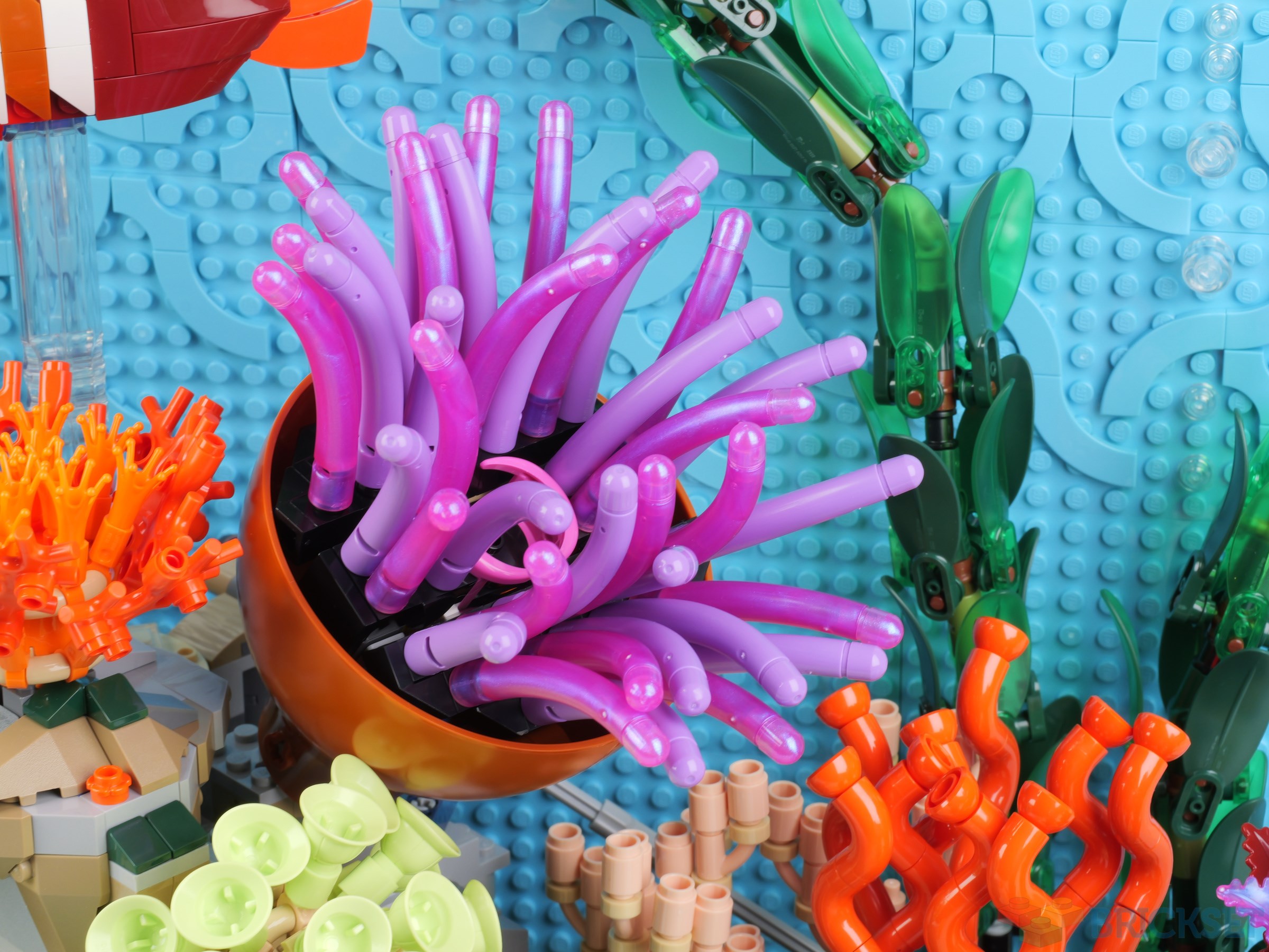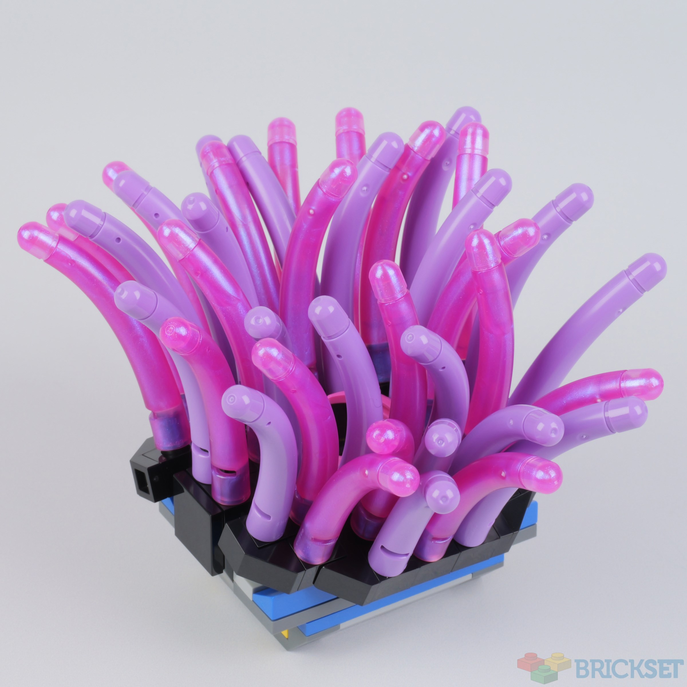 The other anemone is constructed on hinged Technic bricks, then nestled inside two dark orange Shell 10X11X6 W/ Cross Hole pieces that form the lampshade of 21357 Disney Pixar Luxo Jr., as you will see in photos below. I think it looks wonderfully realistic.