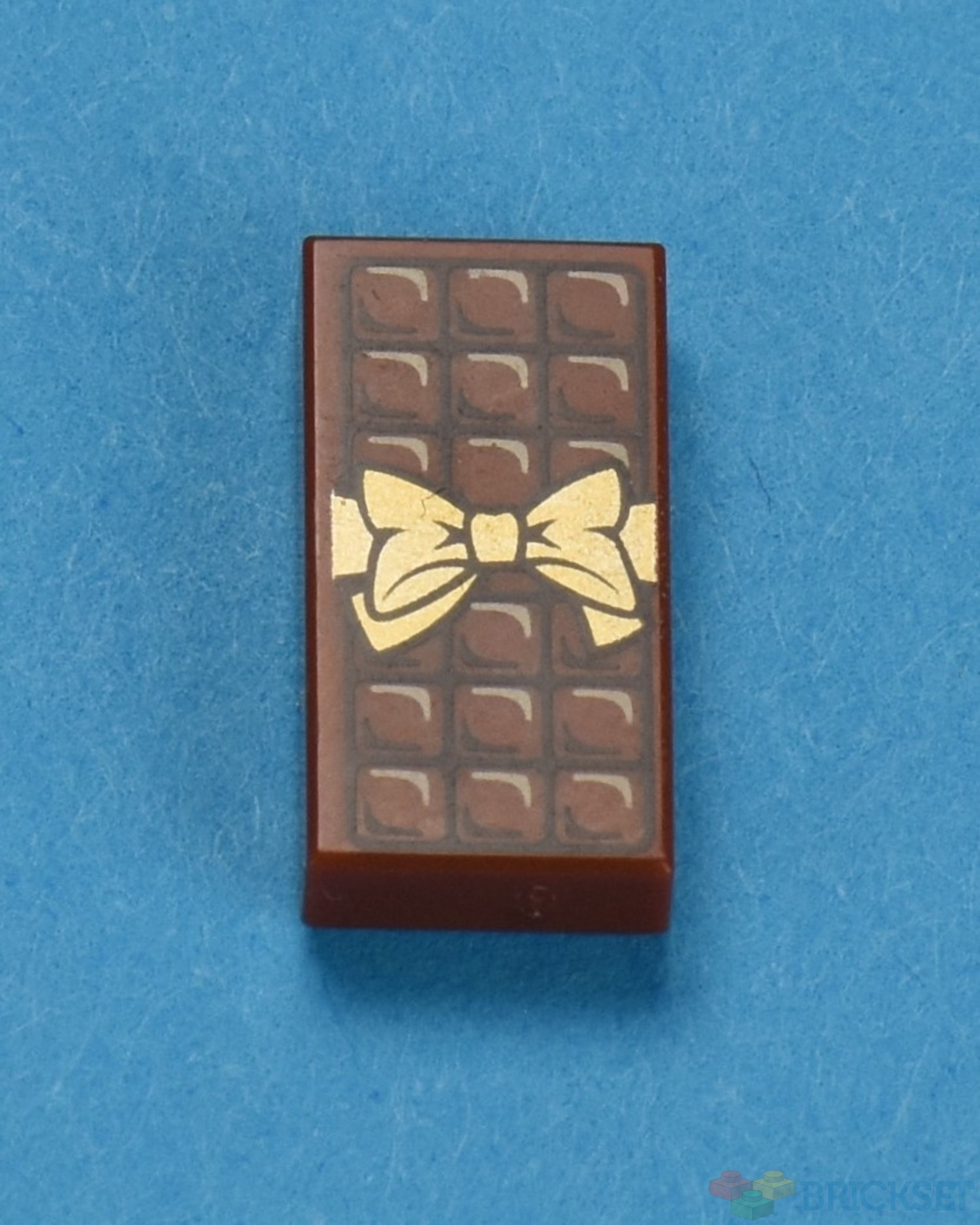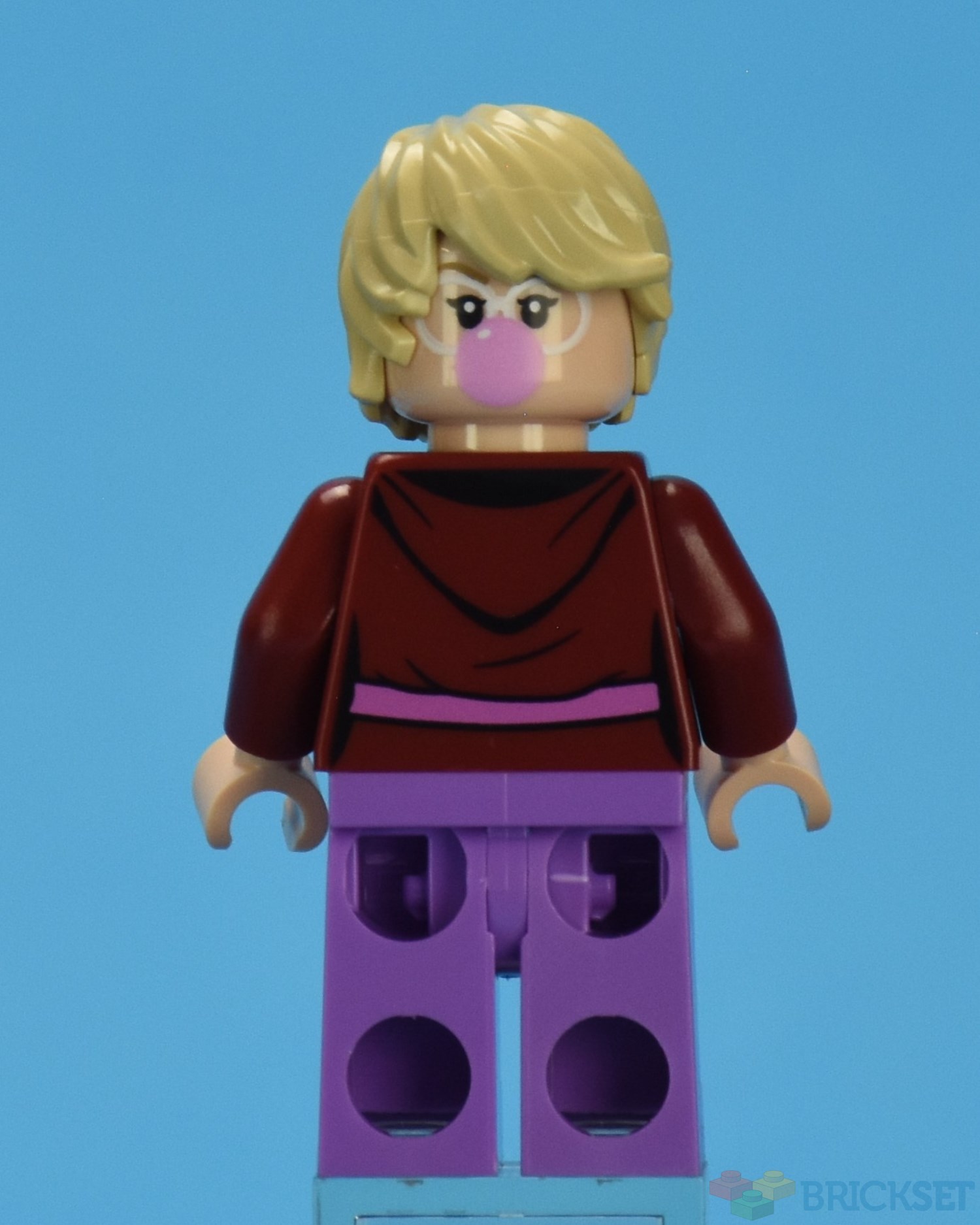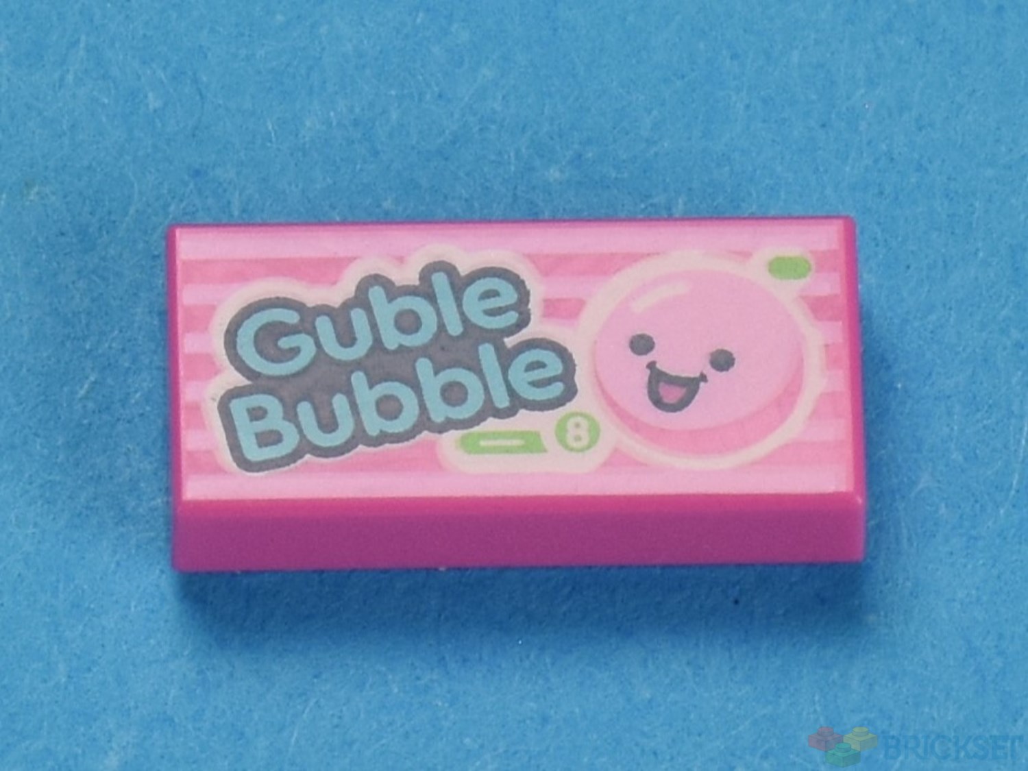 Stef holds a stick of gum which is a printed 1x2 tile.