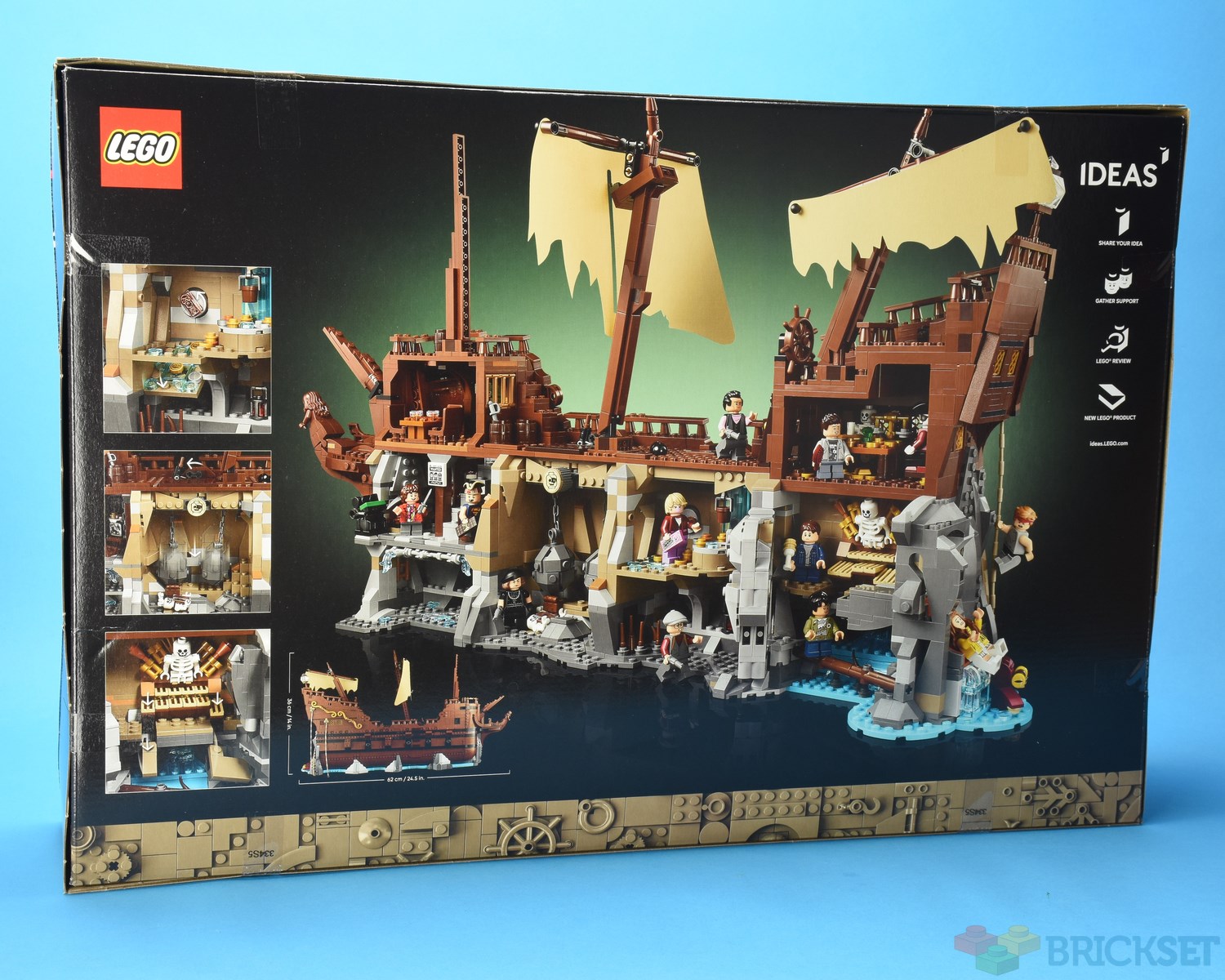The box for 21363 The Goonies has an image of the cutaway side of the model with the tunnels leading to One-Eyed Willy's treasure trove. There is a similar image on both sides of the box.